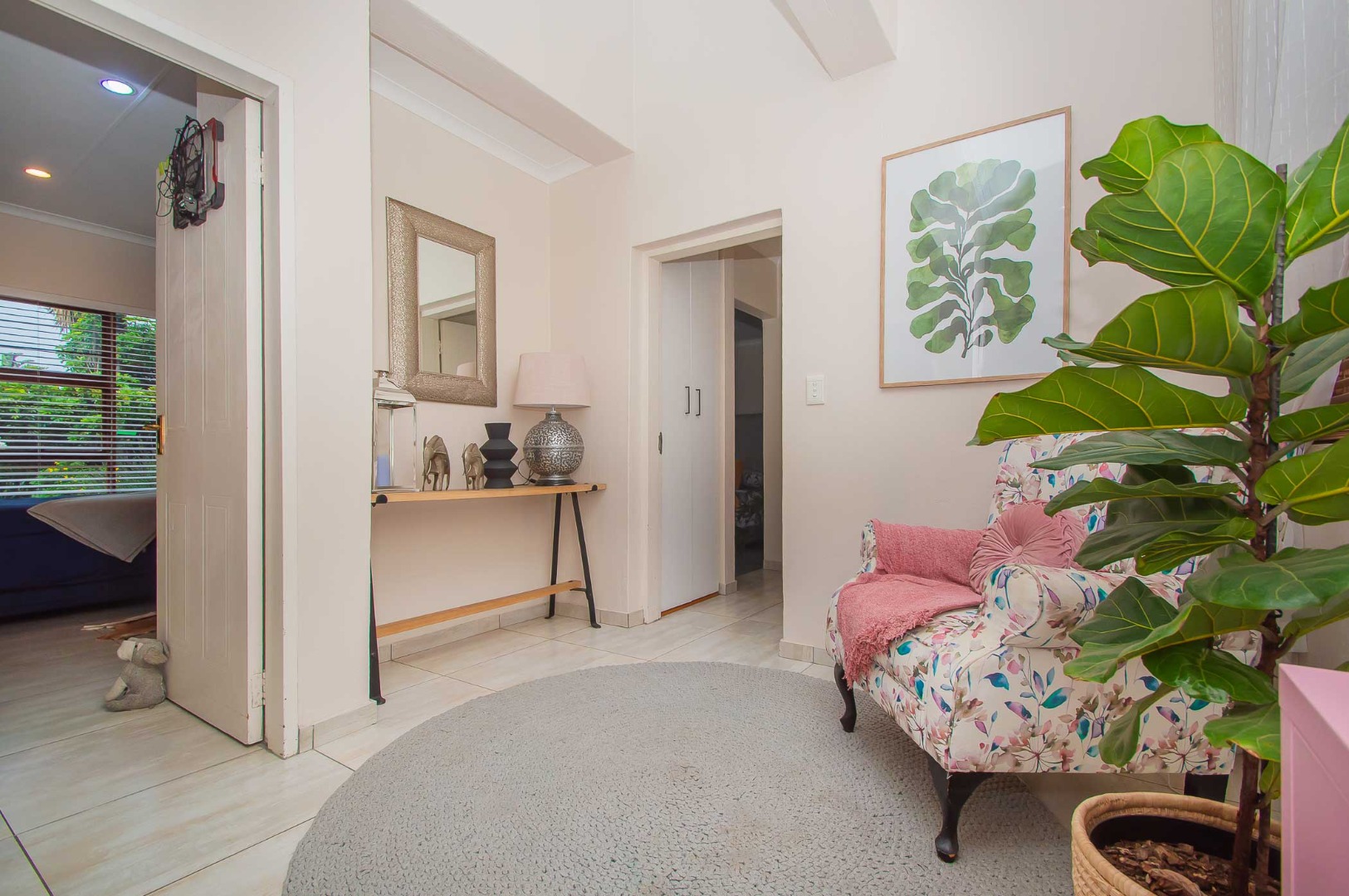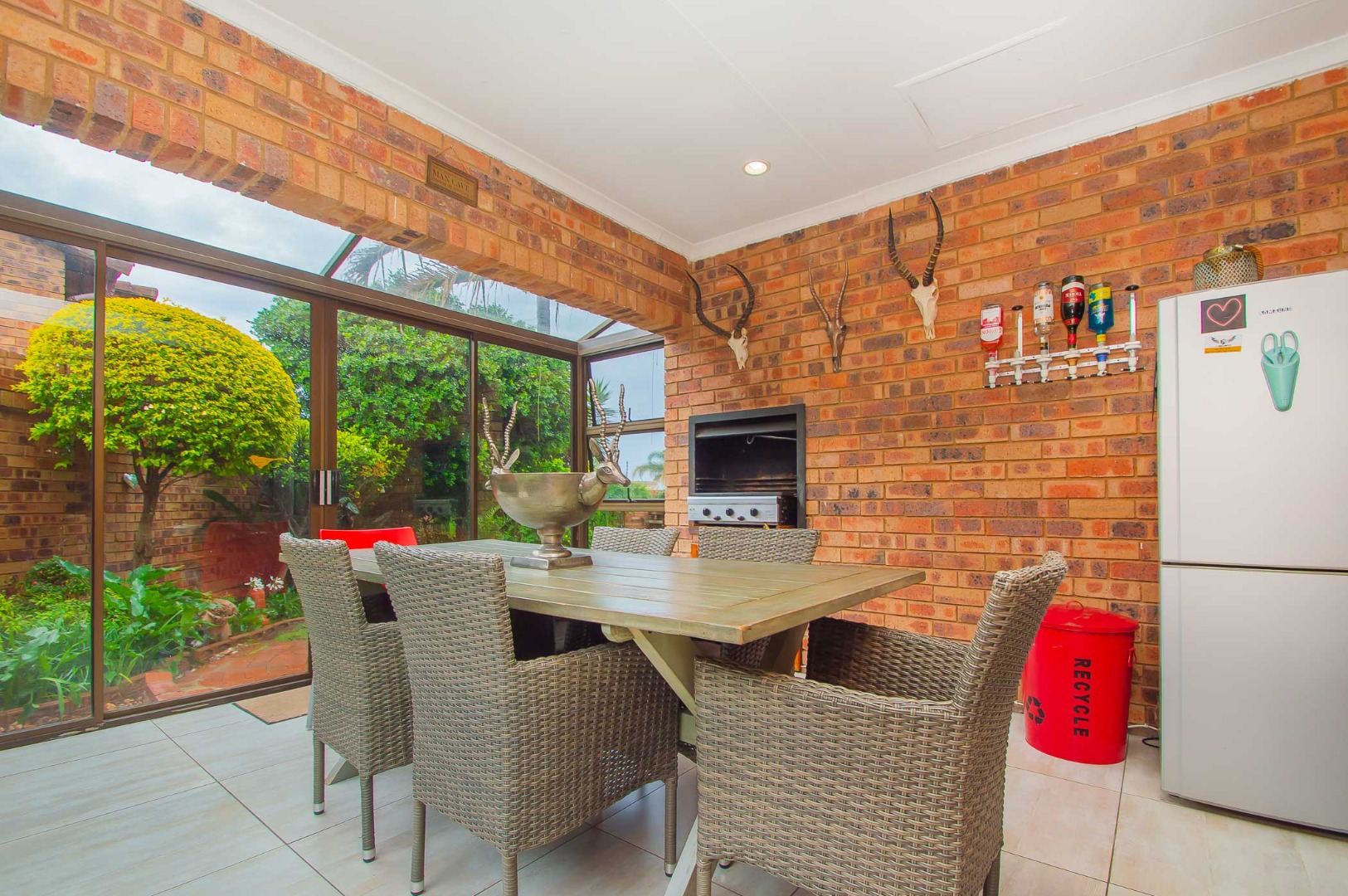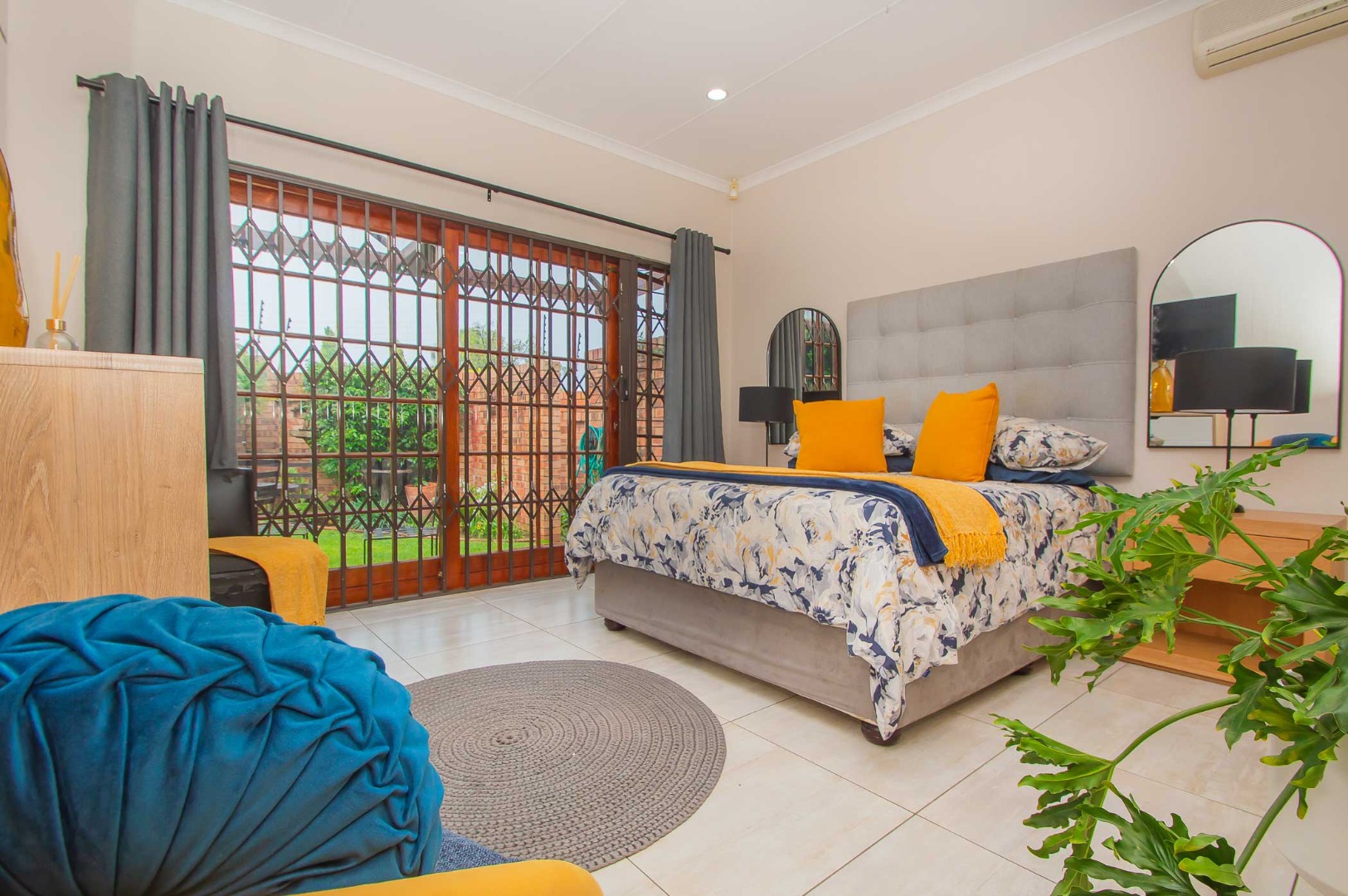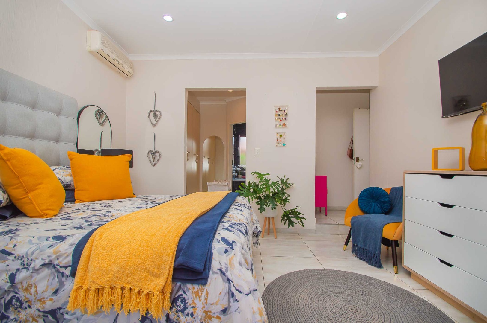 The spacious living area, complete with an air-conditioning unit, seamlessly flows into an enclosed patio. This space is perfect for year-round relaxation and entertaining guests. The kitchen is a blend of style and functionality, offering granite countertops, a gas hob, and a separate scullery area. It caters to both the culinary enthusiast and those who appreciate contemporary living.