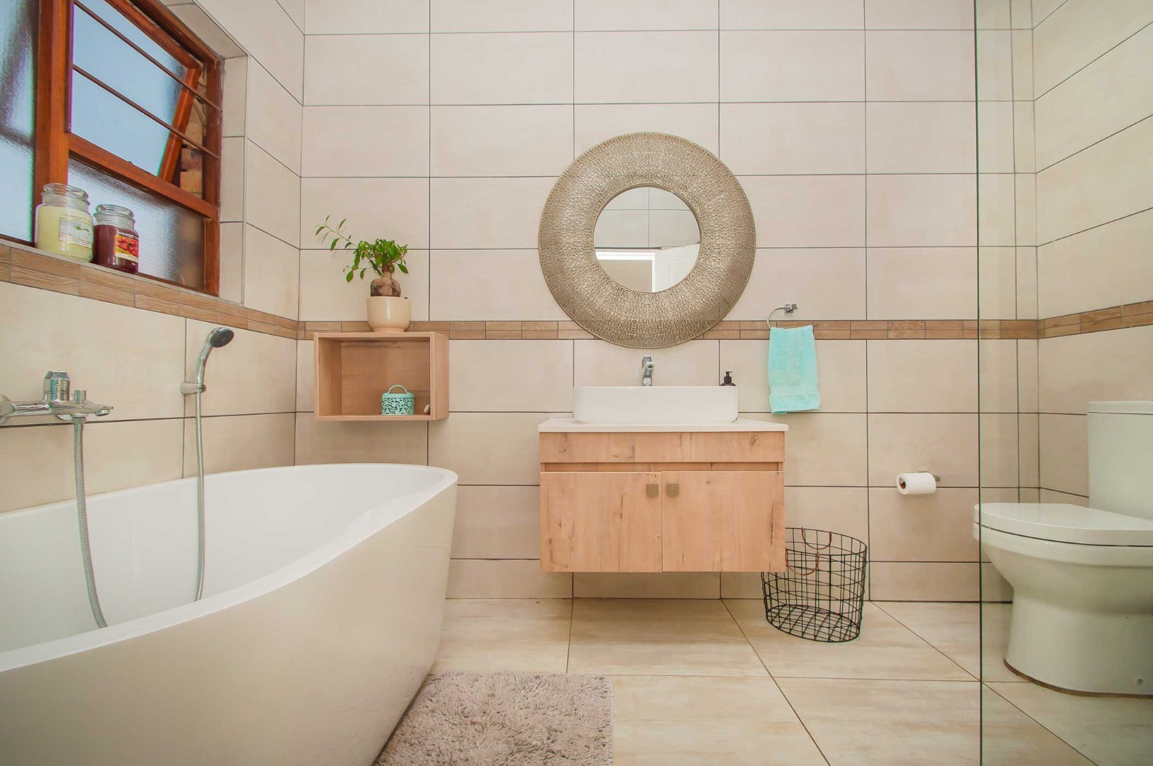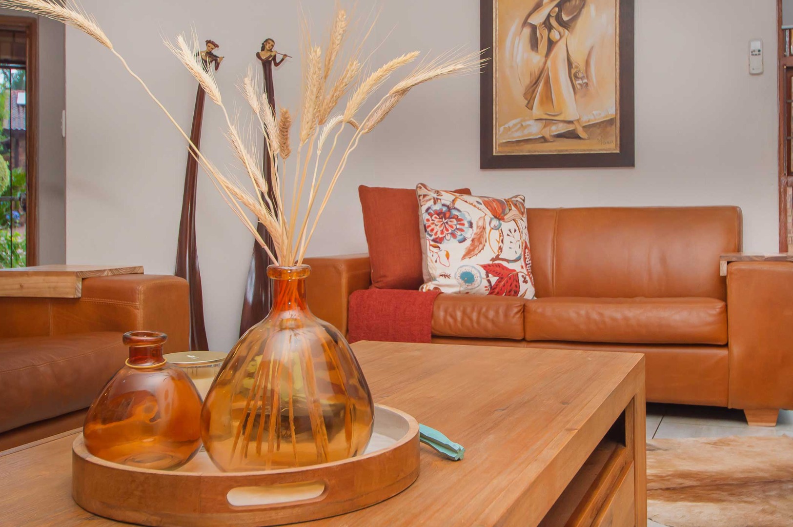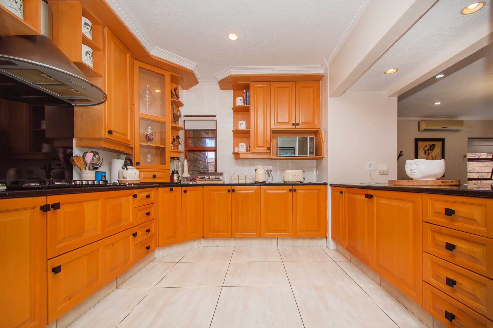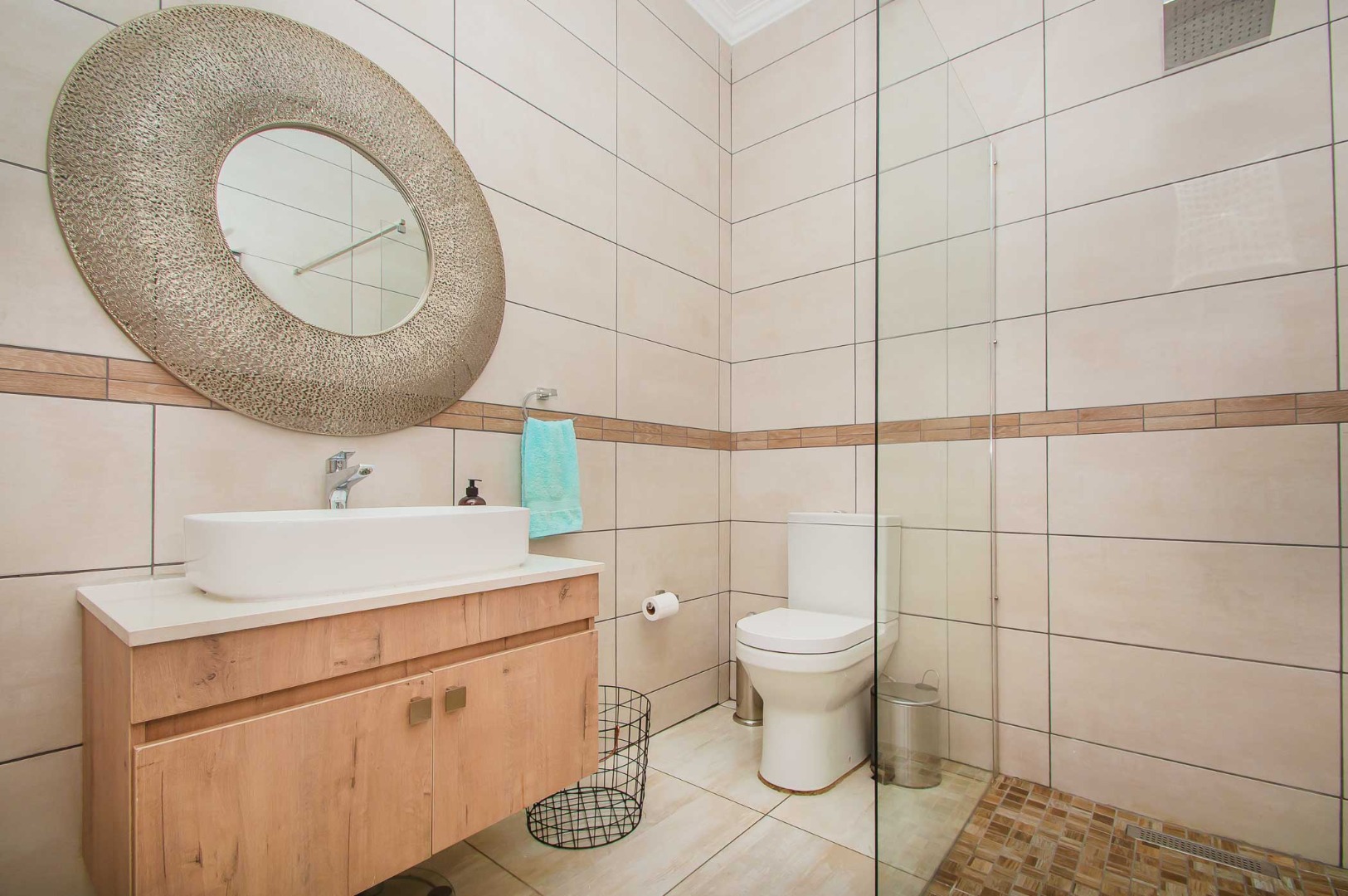 The spacious living area, complete with an air-conditioning unit, seamlessly flows into an enclosed patio. This space is perfect for year-round relaxation and entertaining guests. The kitchen is a blend of style and functionality, offering granite countertops, a gas hob, and a separate scullery area. It caters to both the culinary enthusiast and those who appreciate contemporary living.