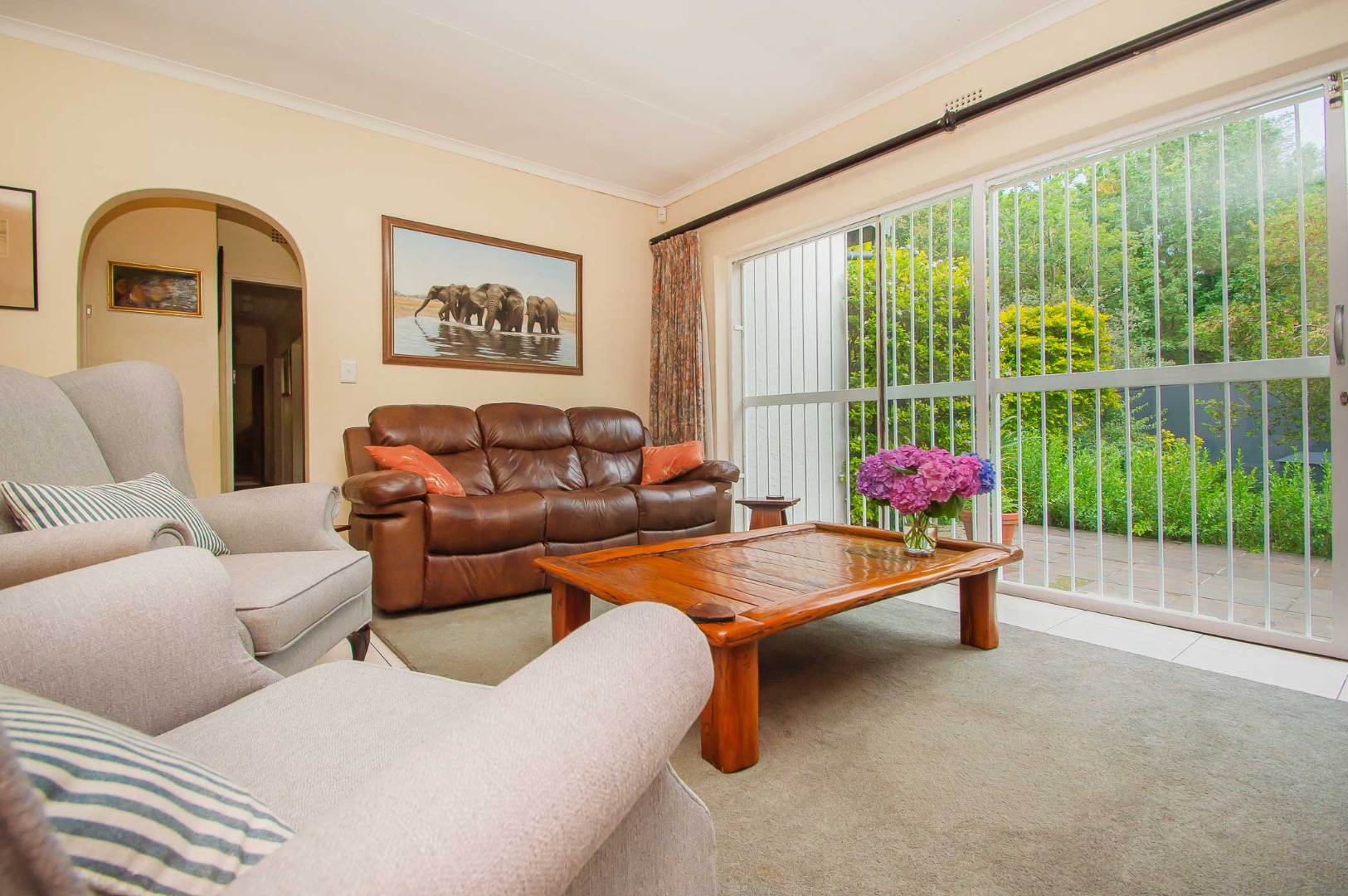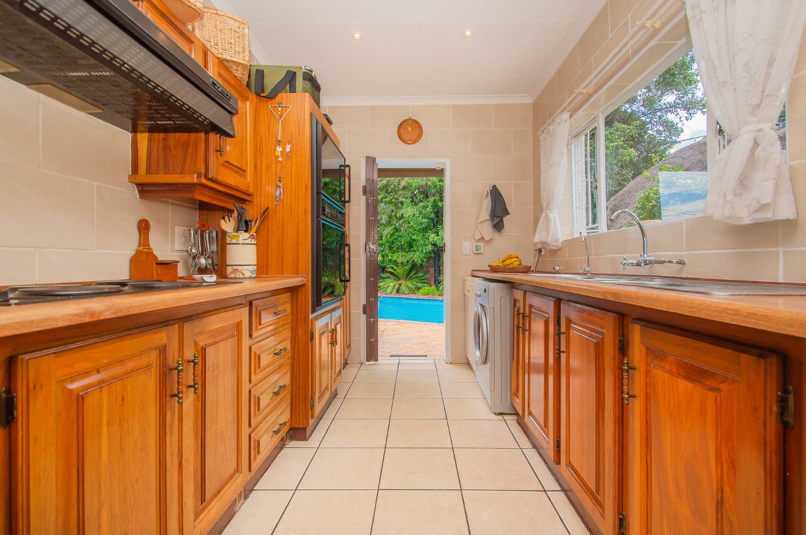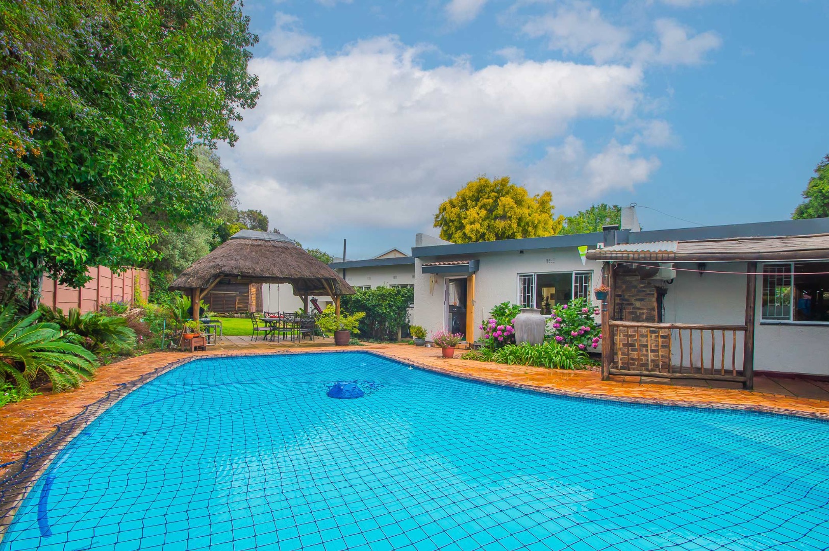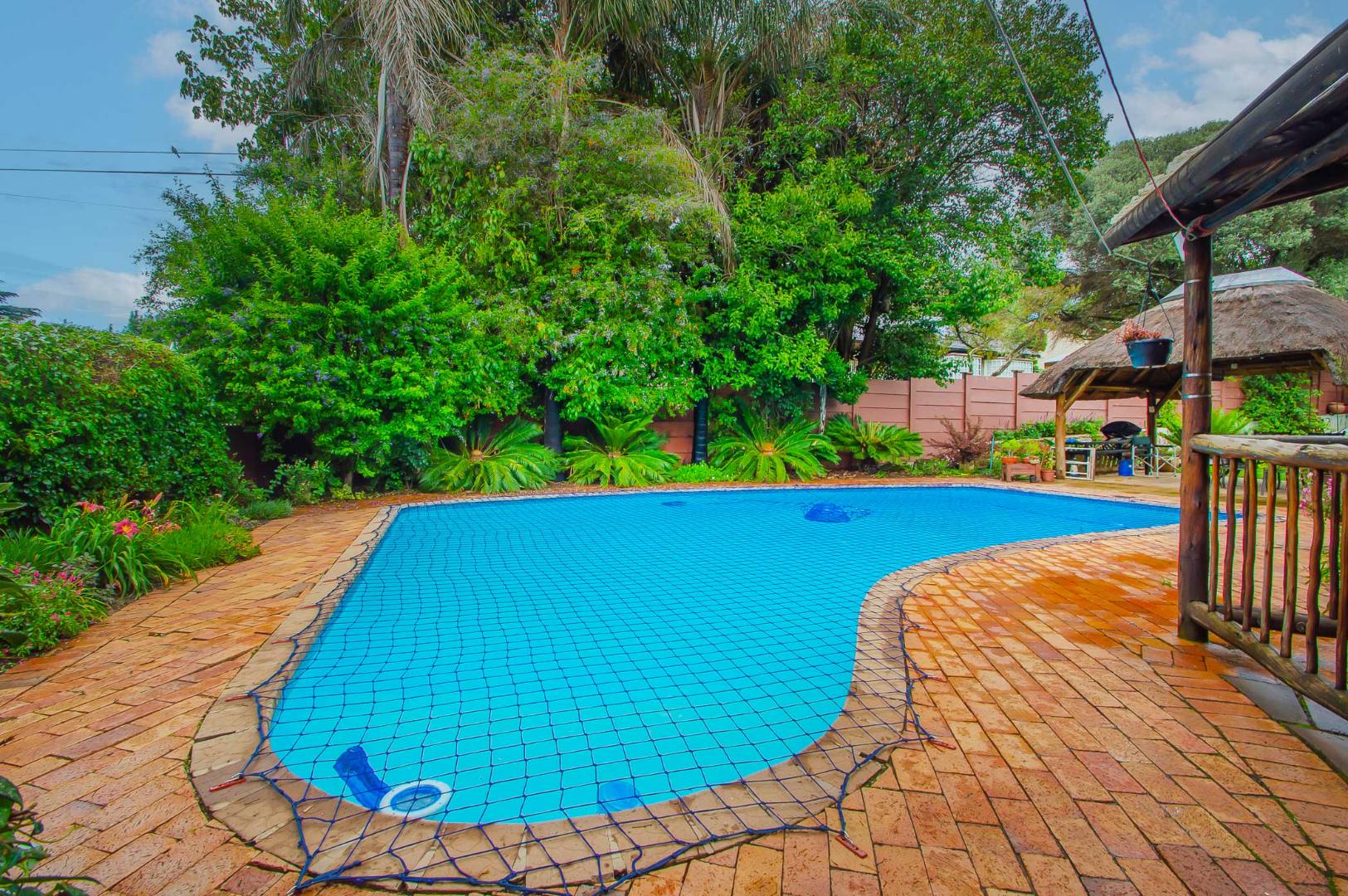 The back garden is your private oasis, featuring a covered patio with built in braai, overlooking a large sparkling swimming pool and a lapa, perfect for entertaining family and friends on sunny days.
