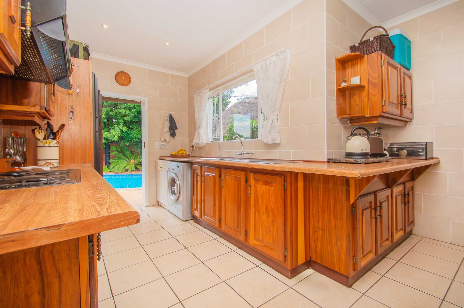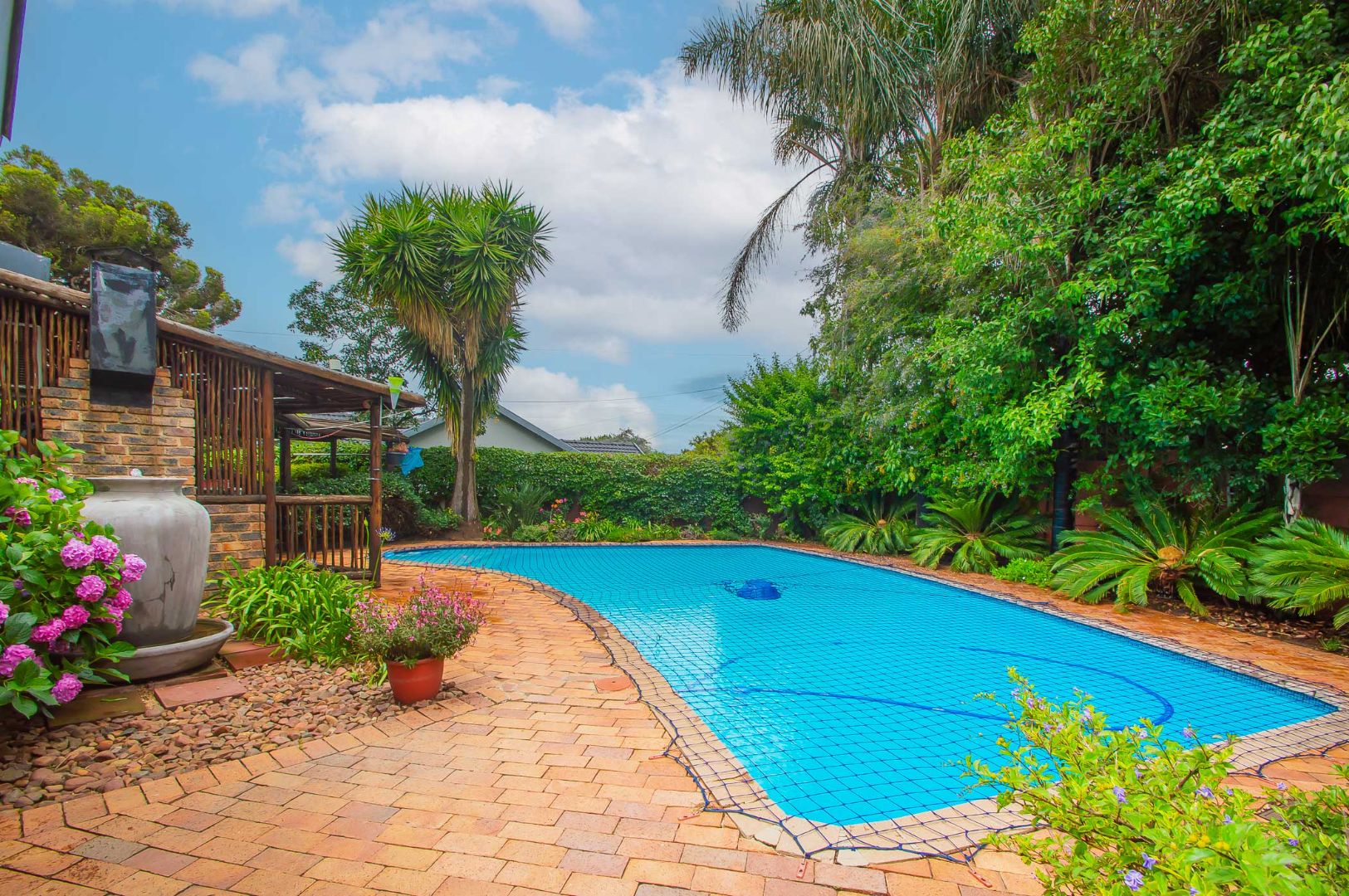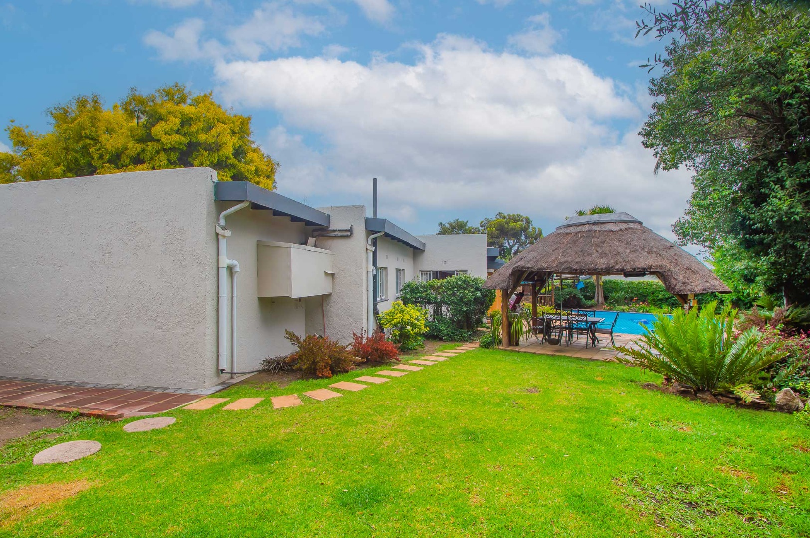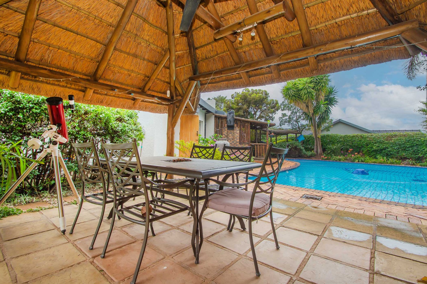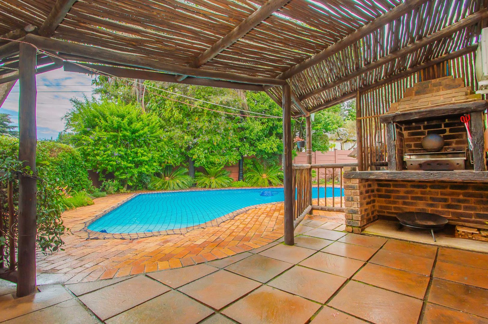 The back garden is your private oasis, featuring a covered patio with built in braai, overlooking a large sparkling swimming pool and a lapa, perfect for entertaining family and friends on sunny days.