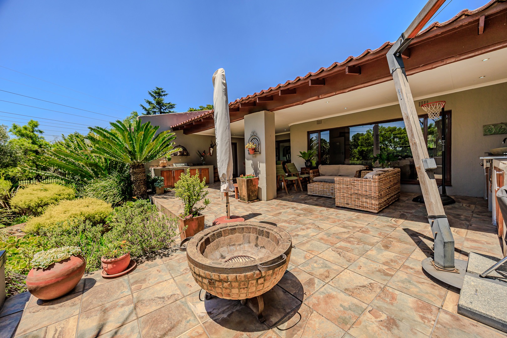 The home boasts a variety of reception areas, including a formal lounge complete with a cozy fireplace, perfect for those chilly evenings. The family room, equipped with air conditioning, seamlessly opens onto a large patio. This outdoor space is an entertainer’s paradise, featuring a built-in gas braai and a boma fireplace, all overlooking the expansive, well-established garden.