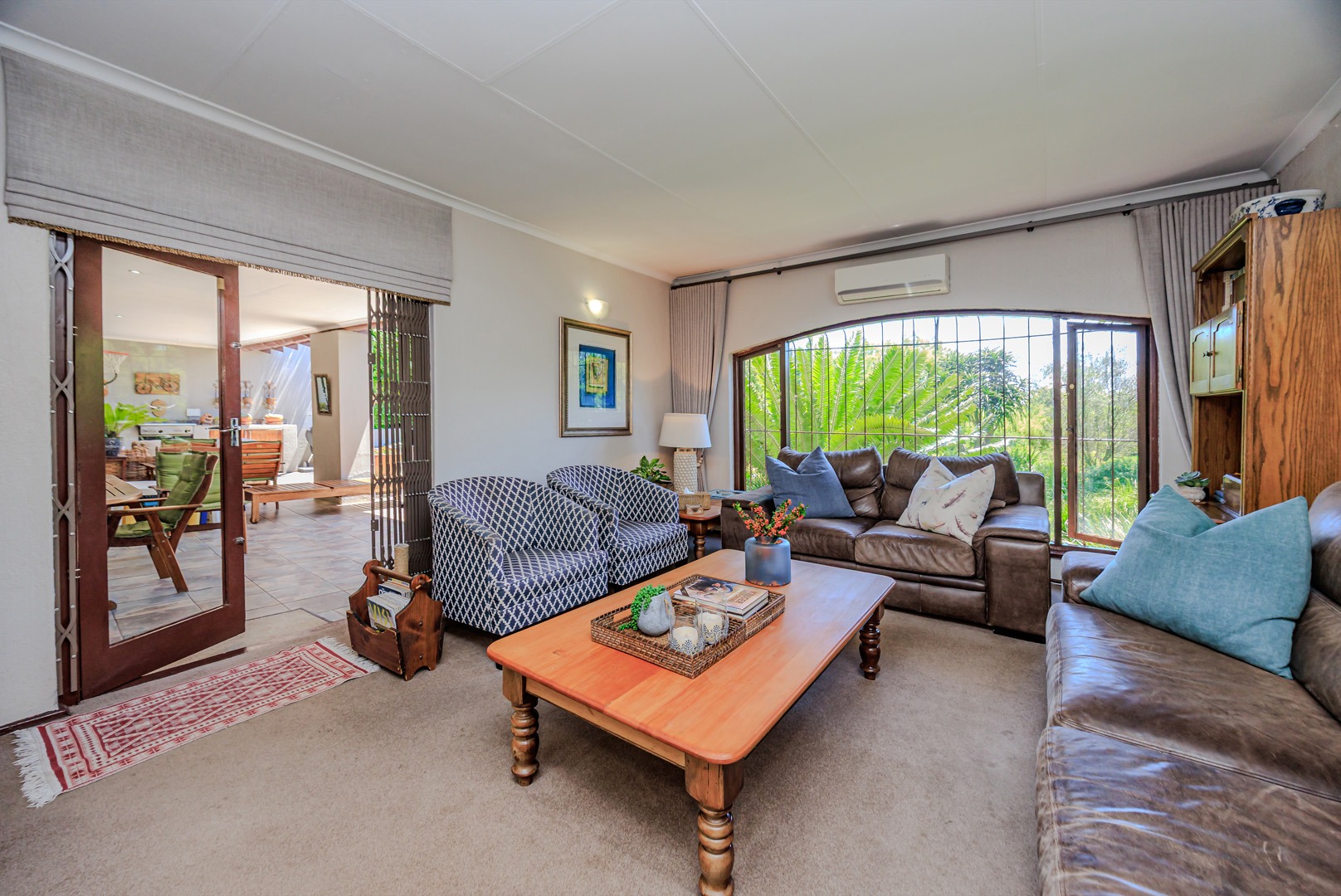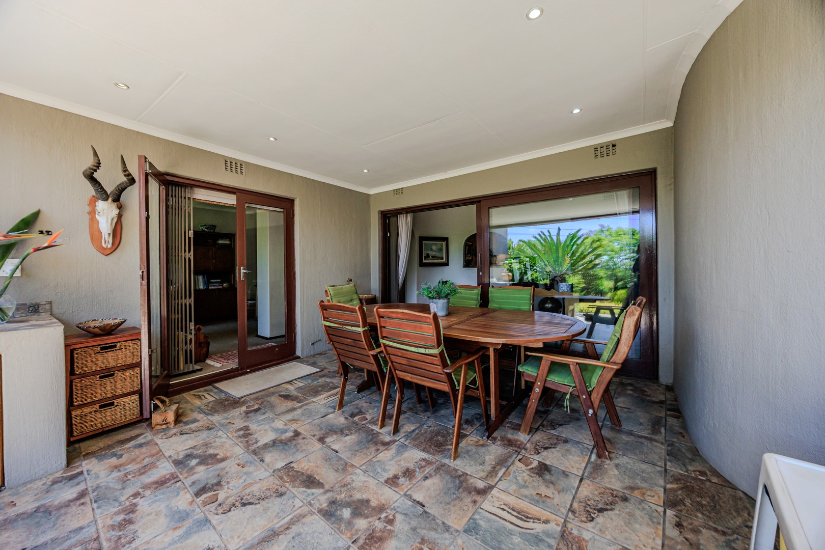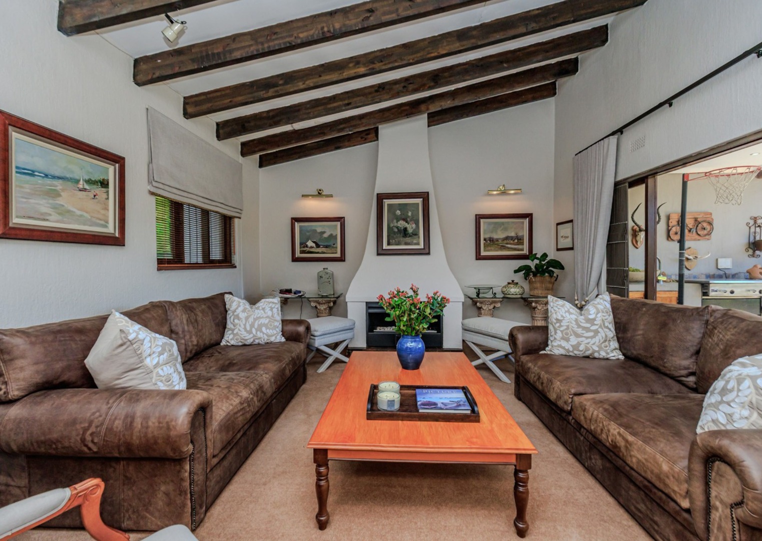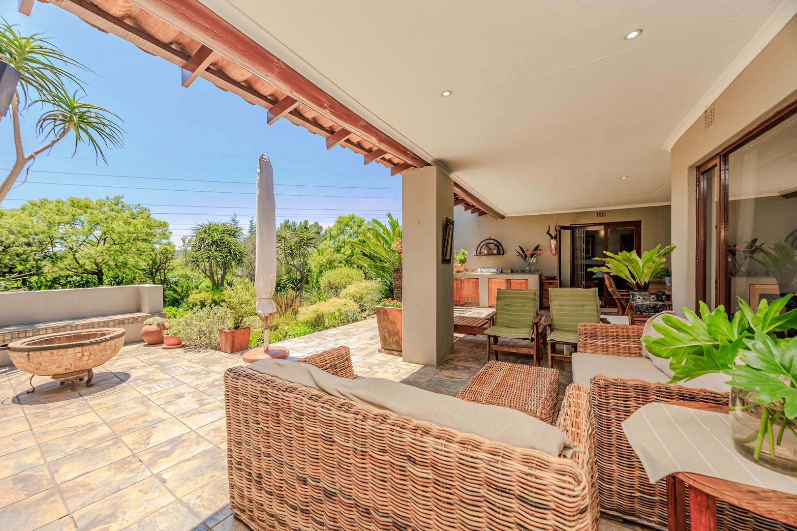 The home boasts a variety of reception areas, including a formal lounge complete with a cozy fireplace, perfect for those chilly evenings. The family room, equipped with air conditioning, seamlessly opens onto a large patio. This outdoor space is an entertainer’s paradise, featuring a built-in gas braai and a boma fireplace, all overlooking the expansive, well-established garden.