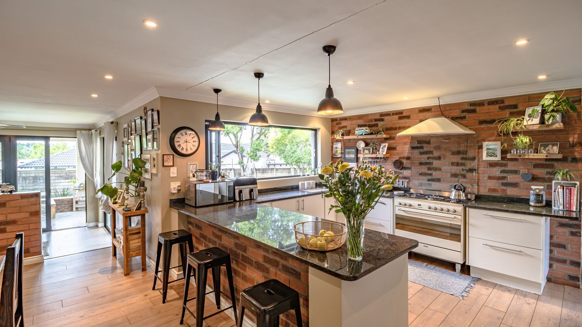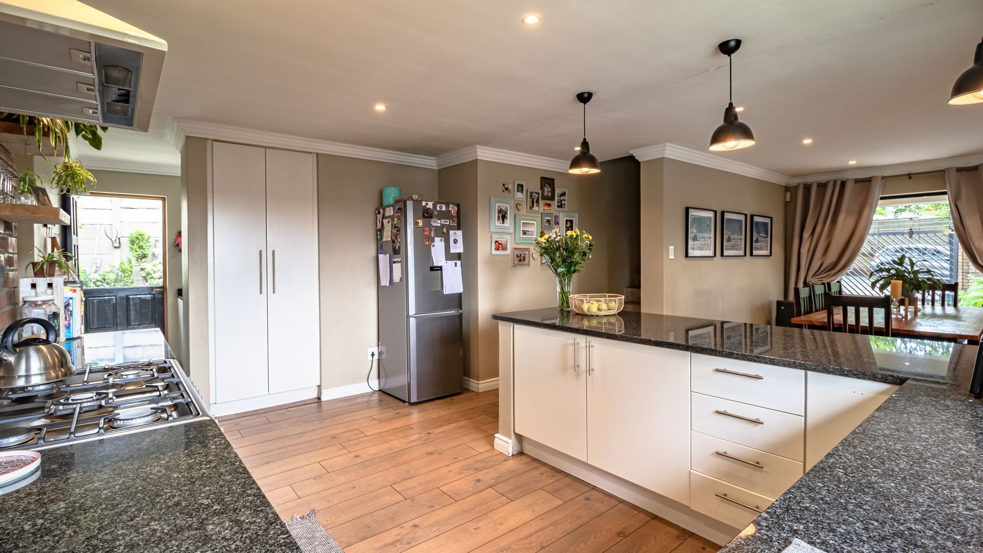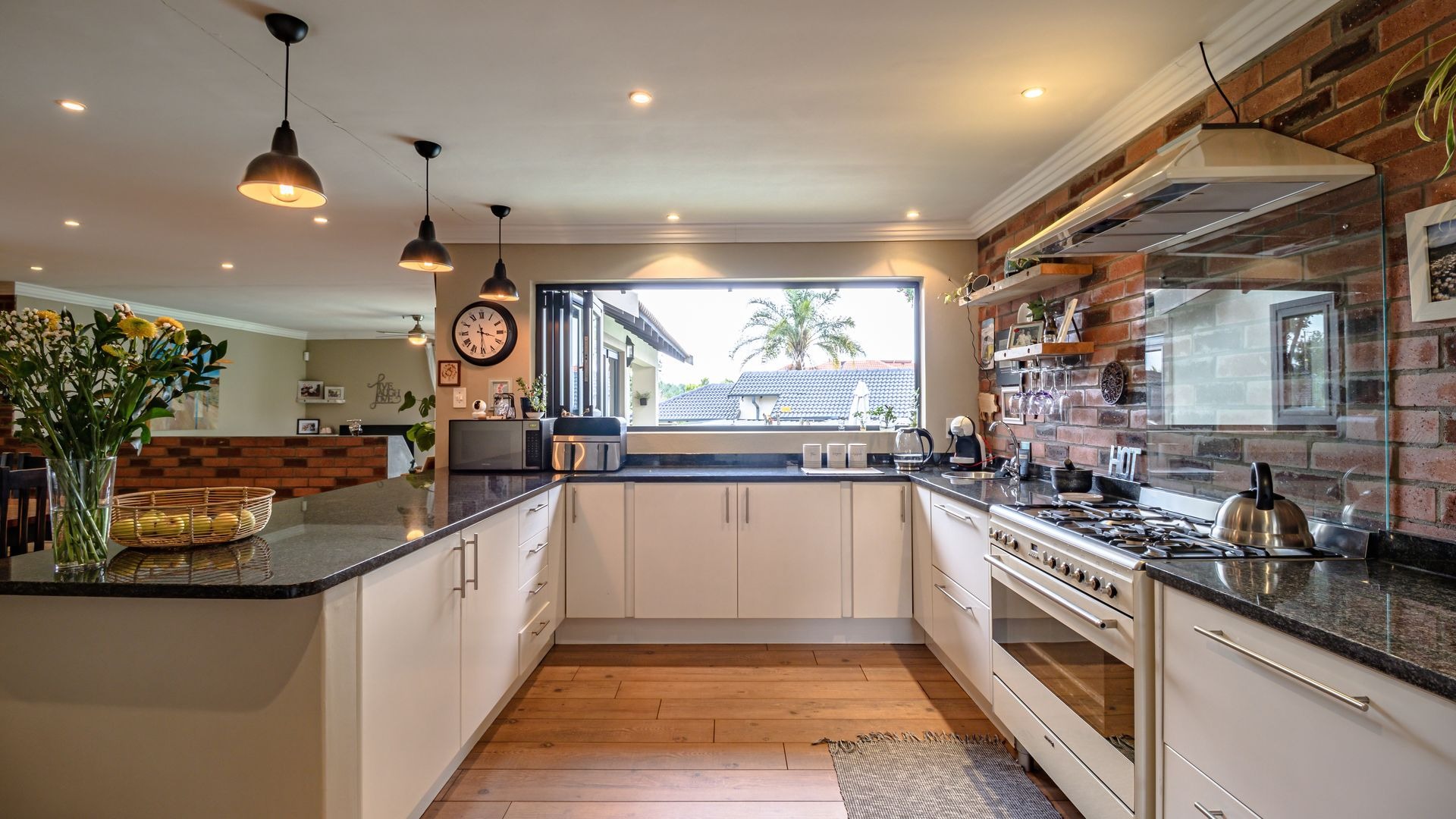 Open plan kitchen with granite tops, gas hob and oven