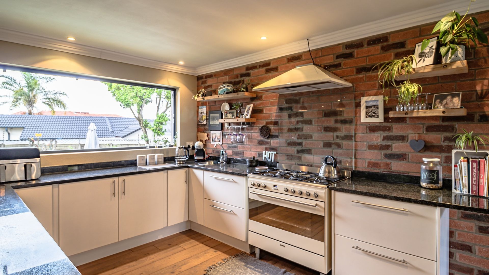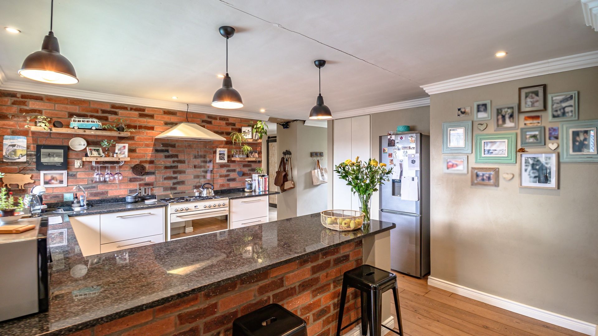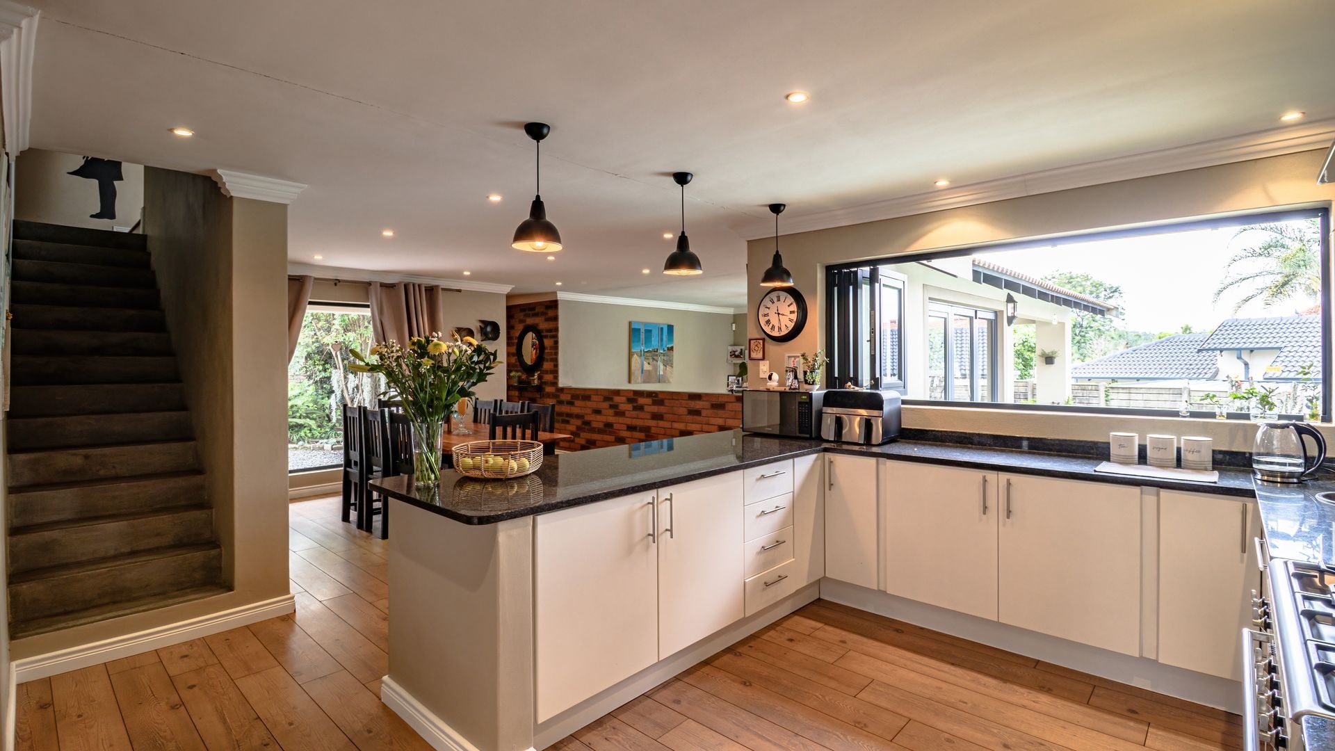 Open plan kitchen with granite tops, gas hob and oven