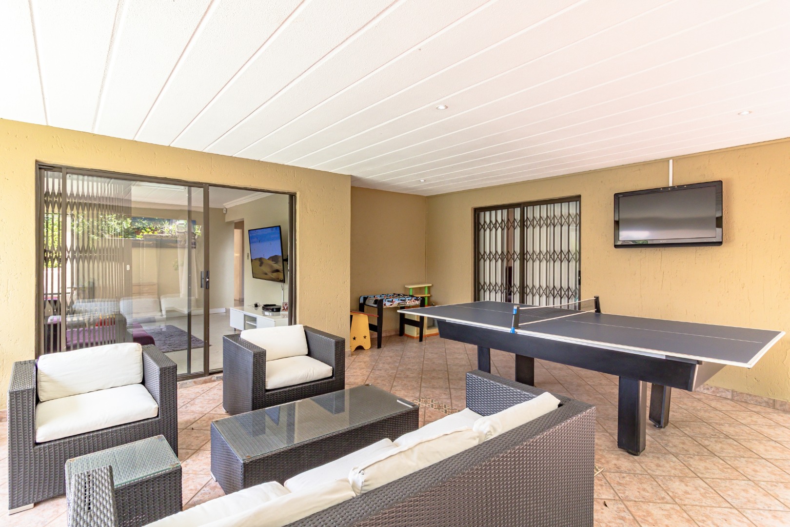 A large covered patio, complete with built-in braai, outdoor seating, wall-mounted TV area, and space for recreational activities like ping-pong or foosball—perfect for year-round entertaining. This overlooks the sparkling swimming pool and a well-maintained garden, creating the ideal setting for summer gatherings, laid-back weekends, and unforgettable moments.