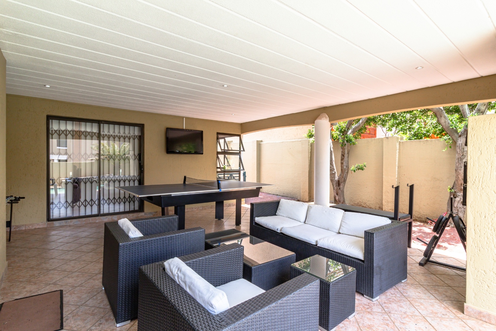 A large covered patio, complete with built-in braai, outdoor seating, wall-mounted TV area, and space for recreational activities like ping-pong or foosball—perfect for year-round entertaining. This overlooks the sparkling swimming pool and a well-maintained garden, creating the ideal setting for summer gatherings, laid-back weekends, and unforgettable moments.
