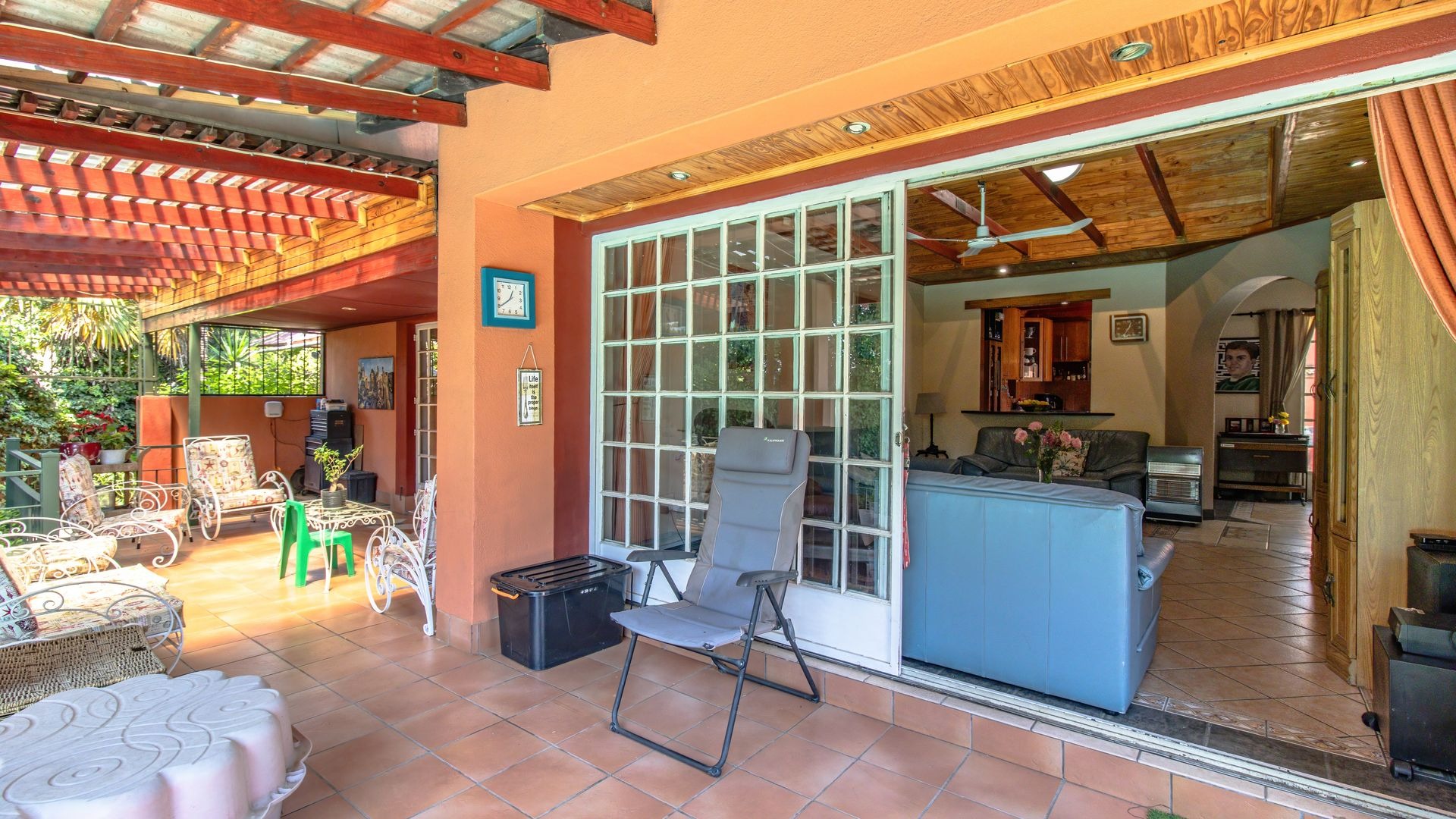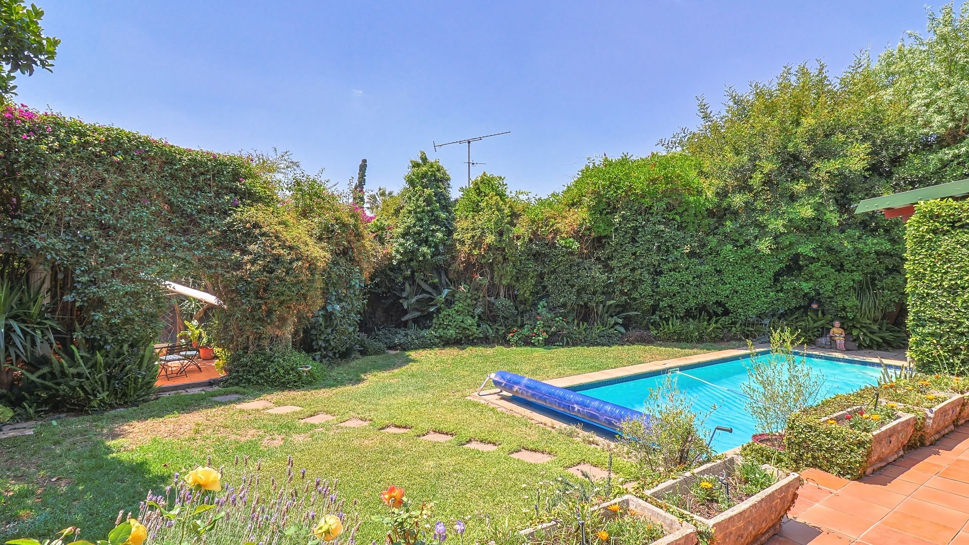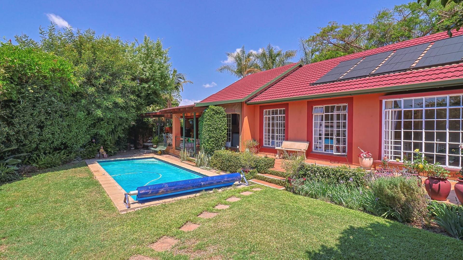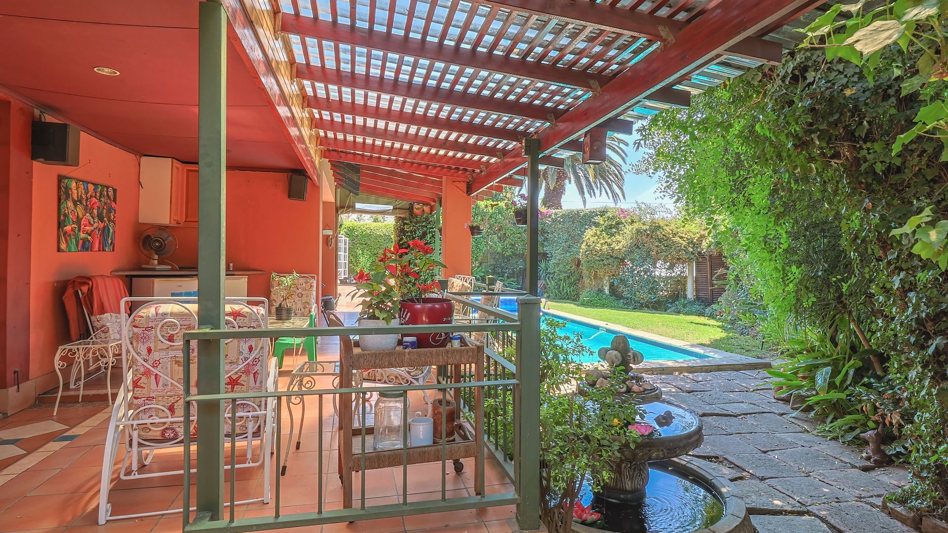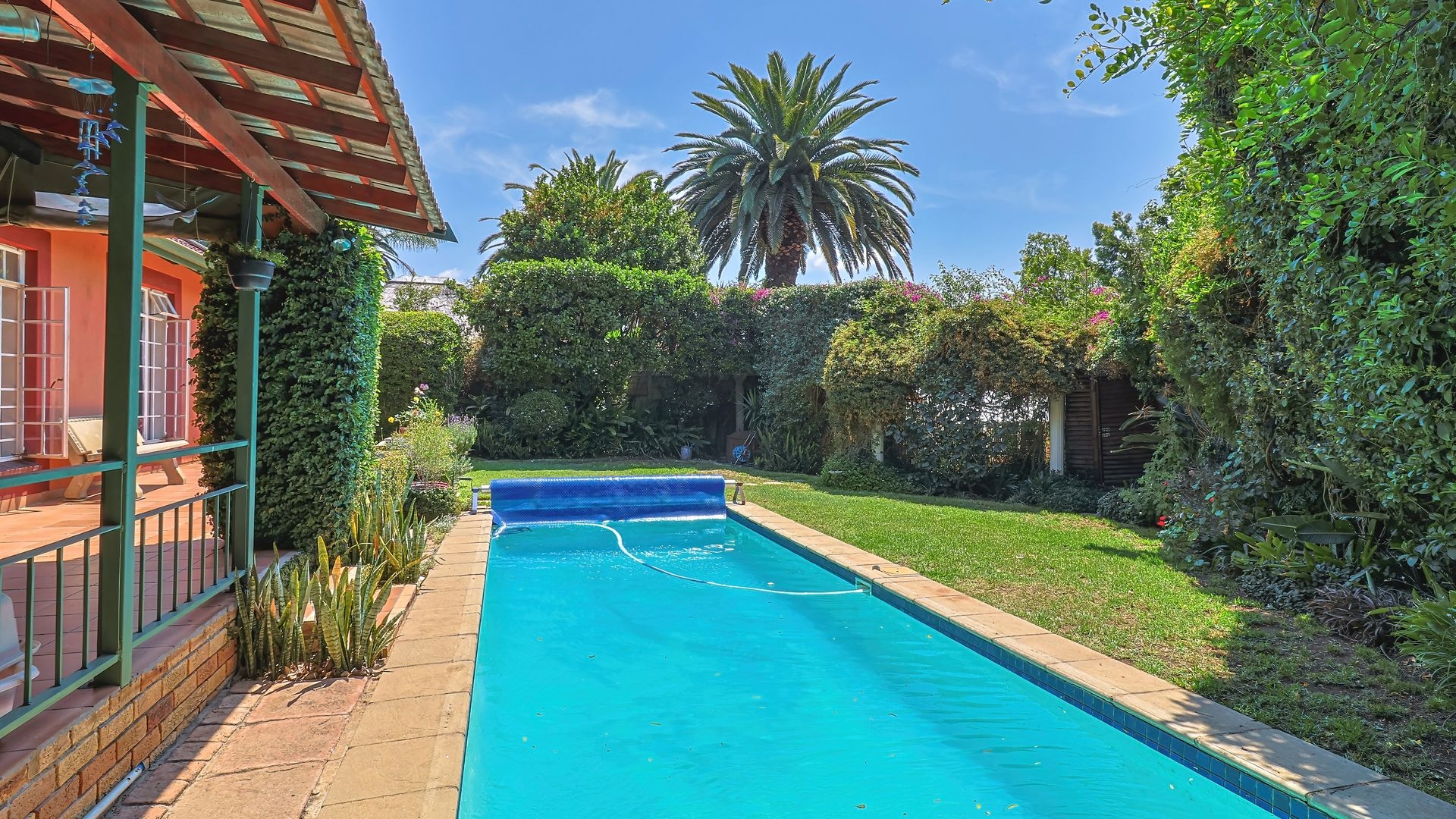 The patio overlooks a solar-heated lap-length pool, ideal for early morning swims or relaxing afternoons, surrounded by lawn and a low-maintenance garden with an irrigation system.