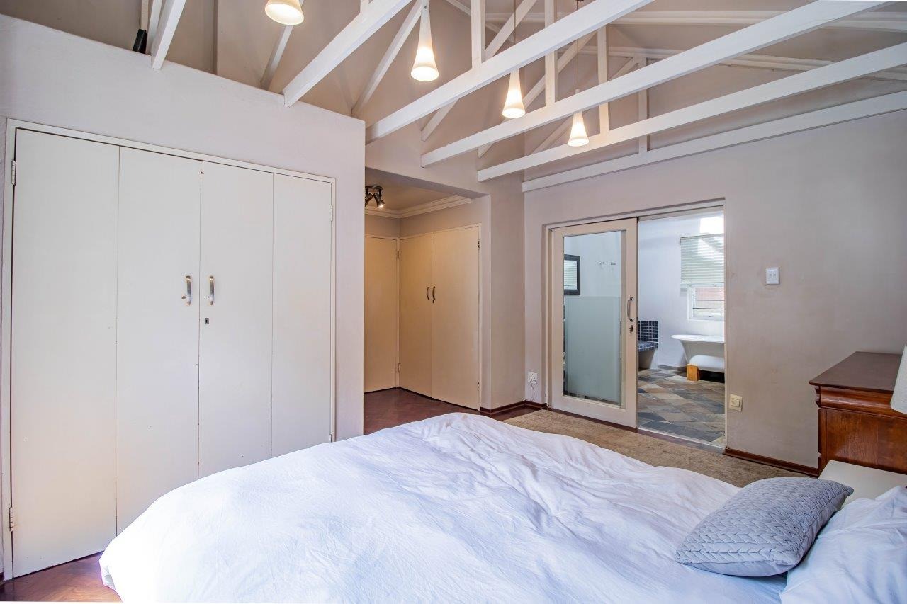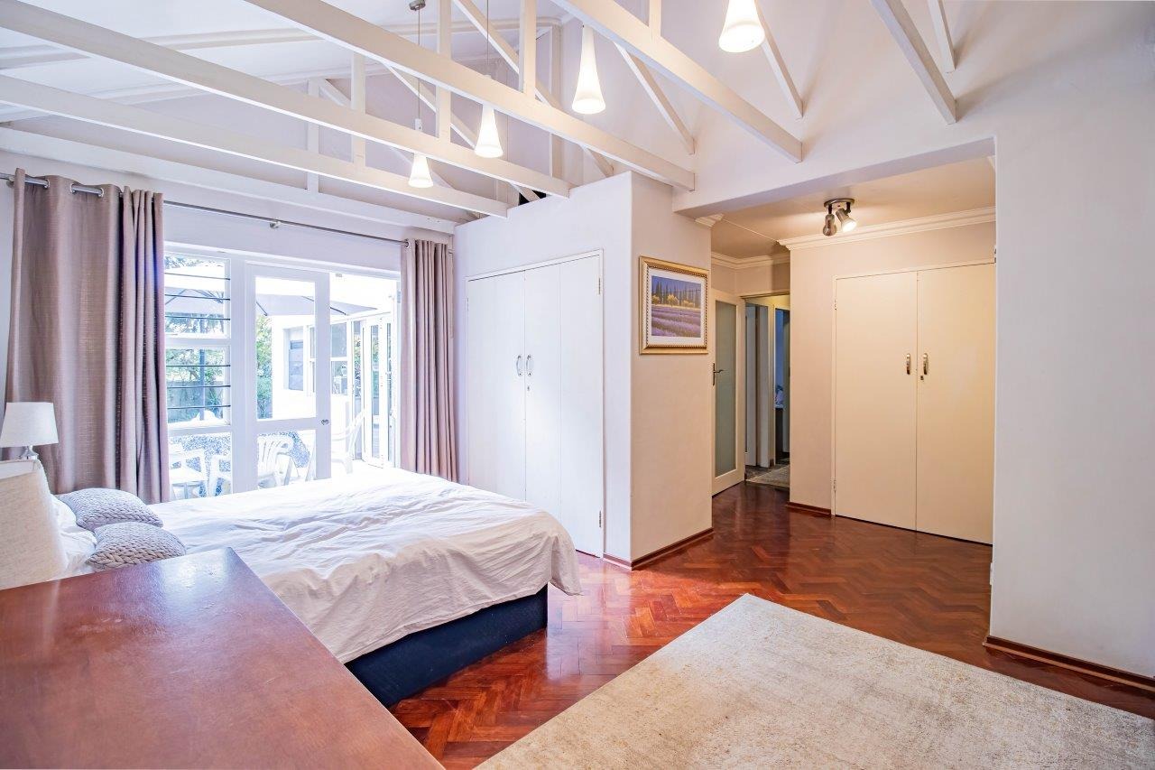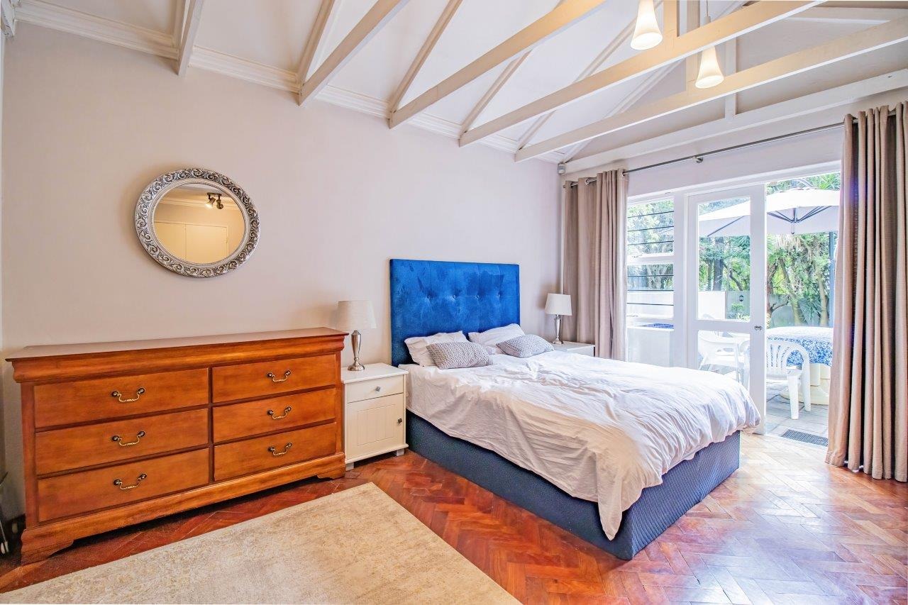 The 2nd and 3rd bedrooms are serviced by an appropriately tasteful guest-bathroom with shower and both look out through the patio to the pool and garden whilst the 2nd bedroom has the added bonus of double outside French-doors. The palatial master-bedroom continues the feature double-volume painted exposed eaves theme and is serviced by a luxurious ensuite bathroom with privacy frosted glass sliding-doors providing double vanity basins, double showers, and a feature modern bath. There are also double French-doors to a private open patio to inspire a romantic breakfast or sundowners.