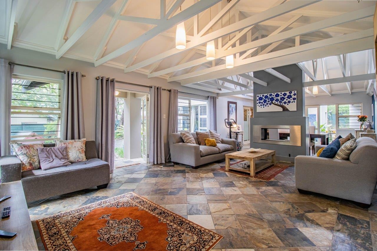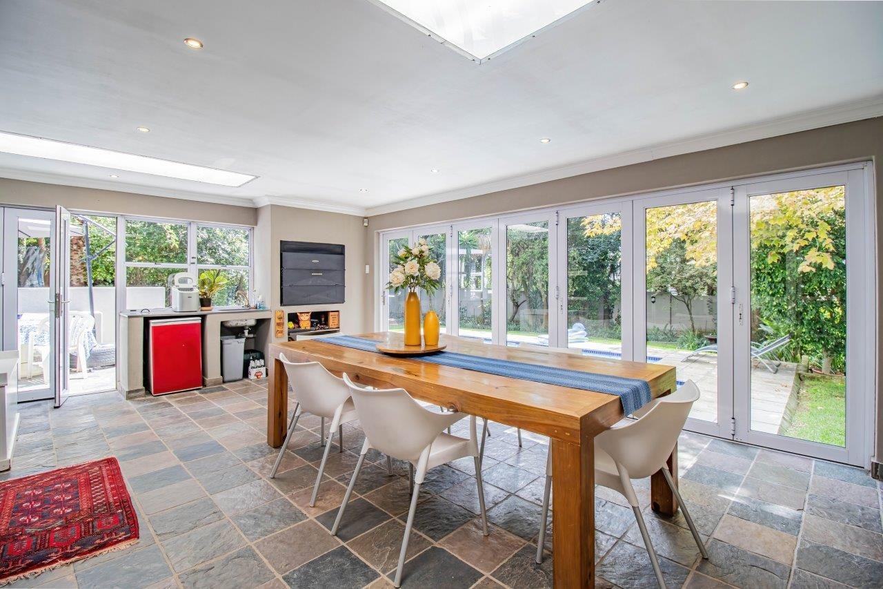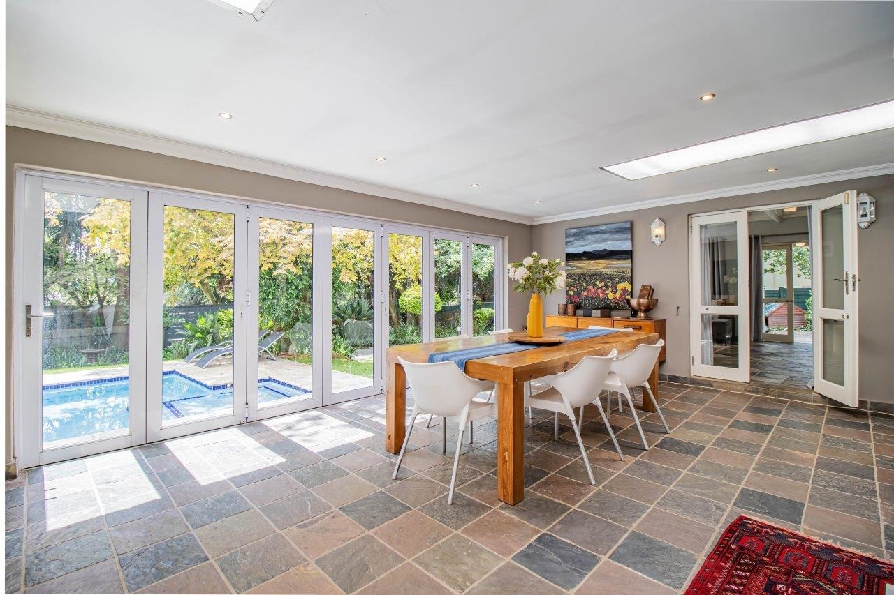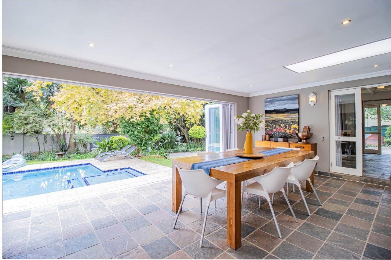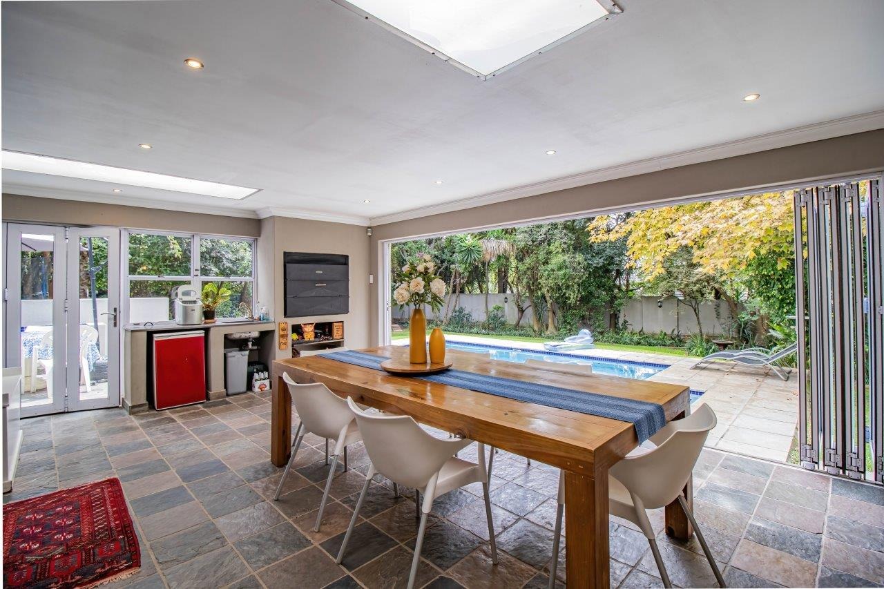 Now that we've explored the relaxed family living and productive work-from-home aspects of this house, let's investigate the entertainment side through the double French-doors from in the lounge onto the amazing all-weather enclosed patio which completely opens to the outside world through stacking doors overlooking the sparkling swimming pool for the more energetic of the family and guests during the hot summer days or can remain closed as a warm sun-trap during our icy highveld winter days. It comes complete with a double-sided braai seamlessly connecting indoor and outdoor spaces, making entertaining effortless in either season.