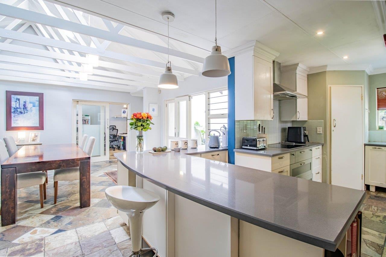 Formal access to this house is from a large inviting double-door porch directly into an extremely spacious bright and airy open style lounge, dining room and kitchen, the heart of this house with double-volume painted exposed eaves, setting the high standard for the rest of this house. A modern double-sided gas fireplace divides the lounge from the dining room and kitchen separated from a family room, currently used as executive office space, by glass privacy sliding-doors. For added pleasure, the dining room leads into a relaxing alfresco tiled courtyard with a pond and seating area to savour a delightful cup of coffee and snack or simply chill-out, also conveniently serviced by a guest-bathroom with shower.