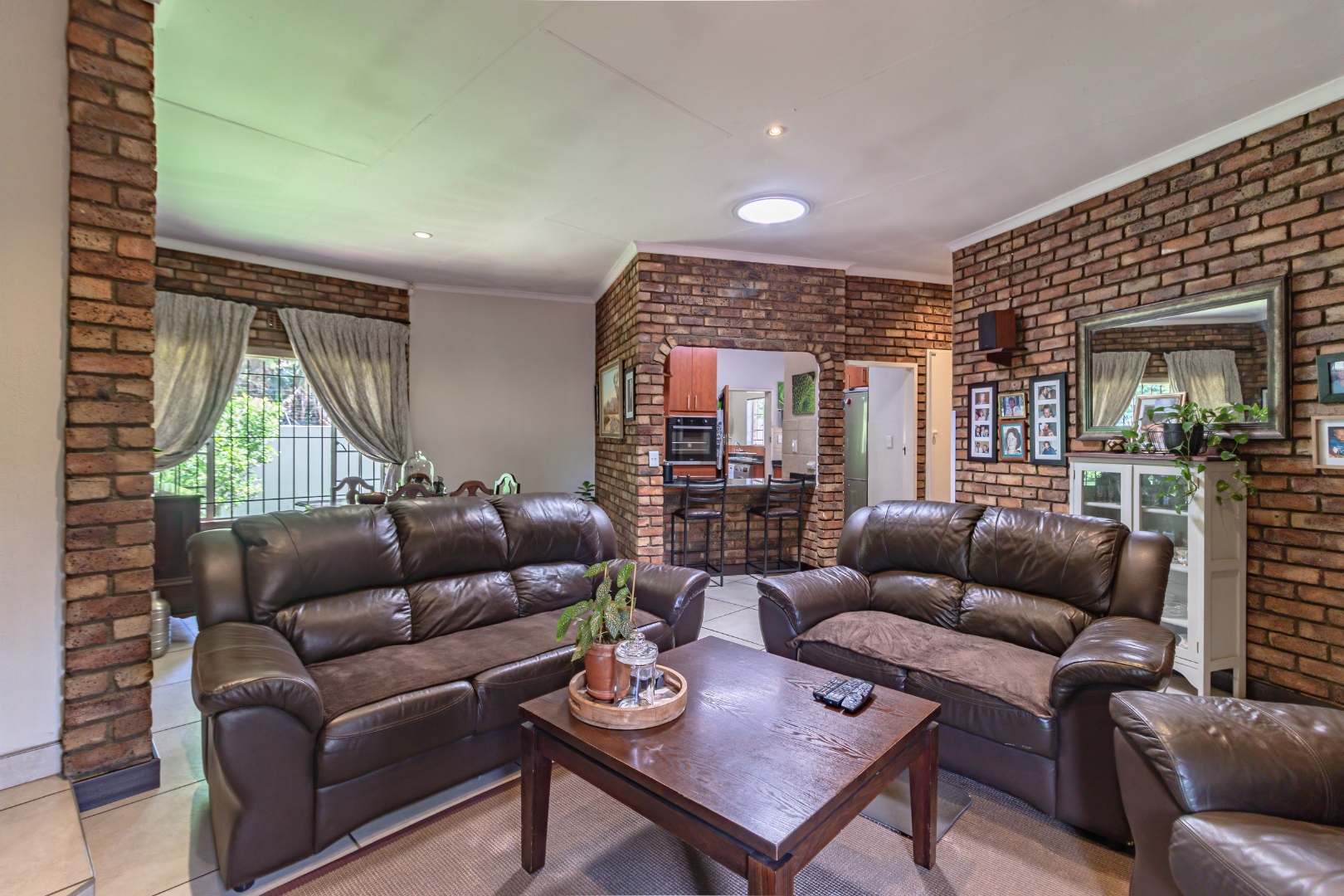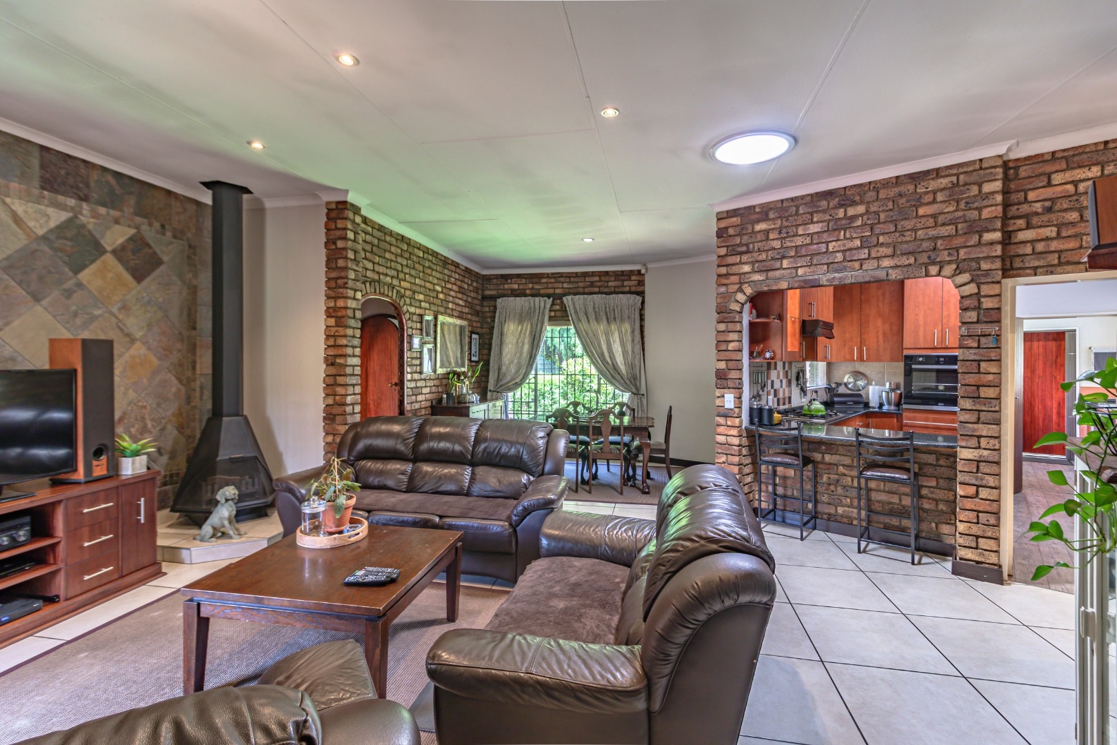 Inside, the home features a warm and welcoming lounge with a fireplace, creating the perfect setting for cozy winter evenings. The dining room flows seamlessly from the living space, making it ideal for both everyday family meals and formal entertaining.