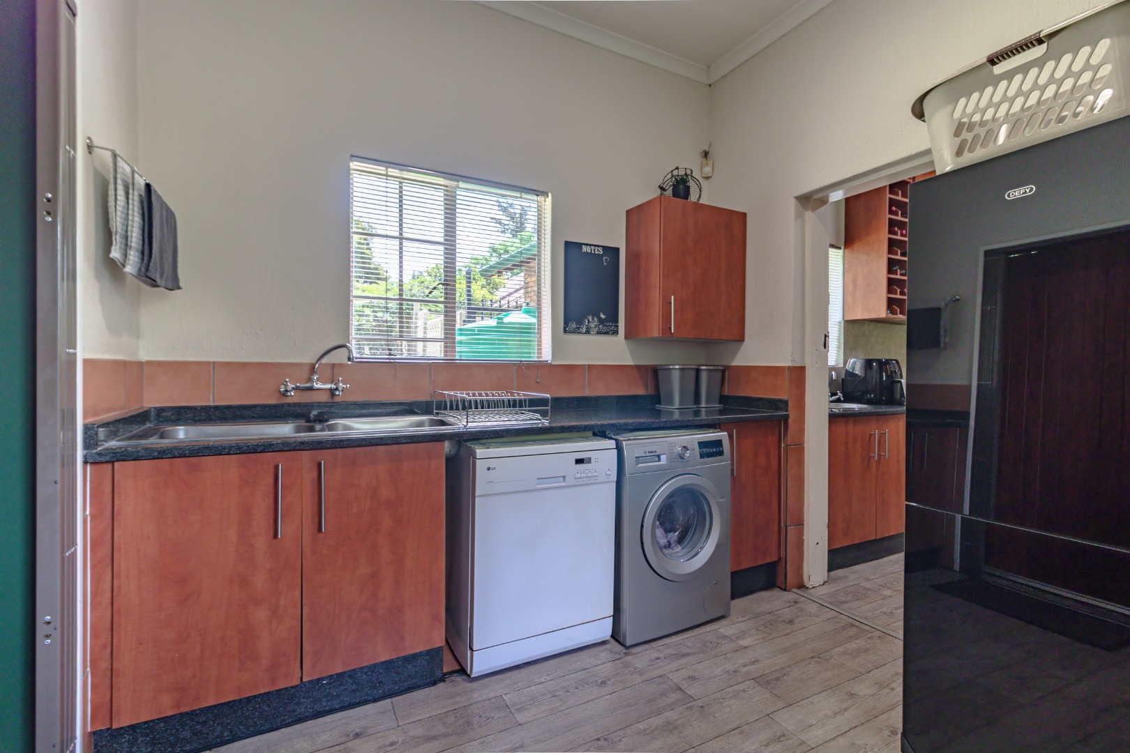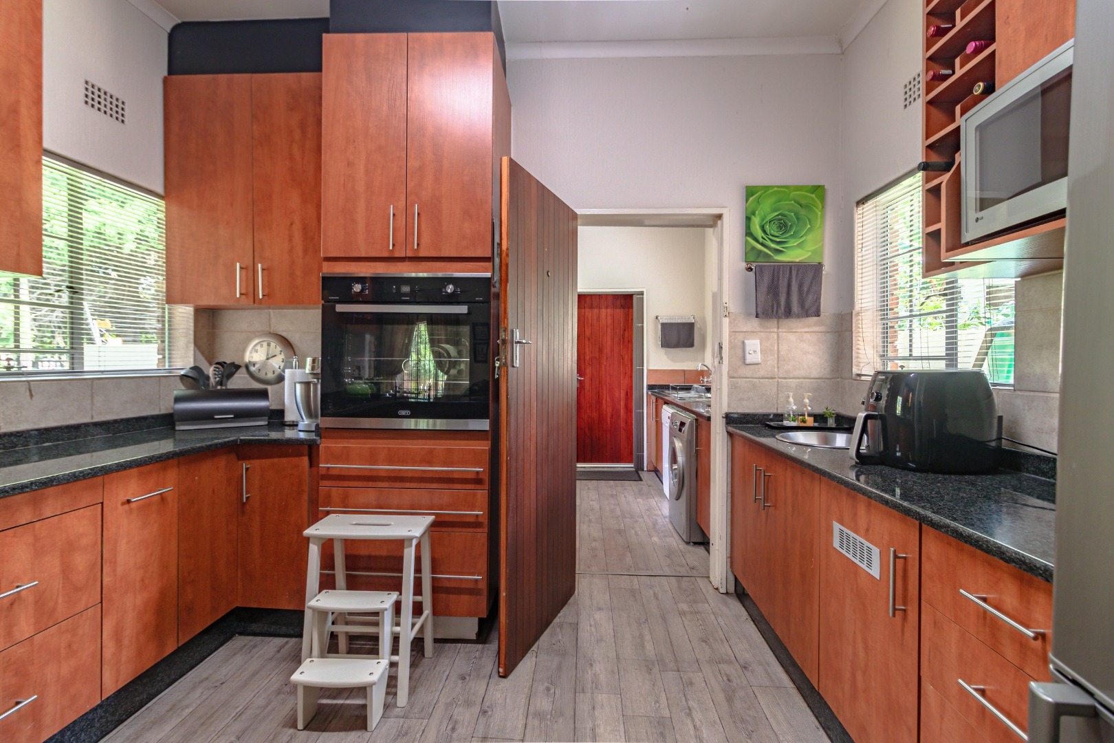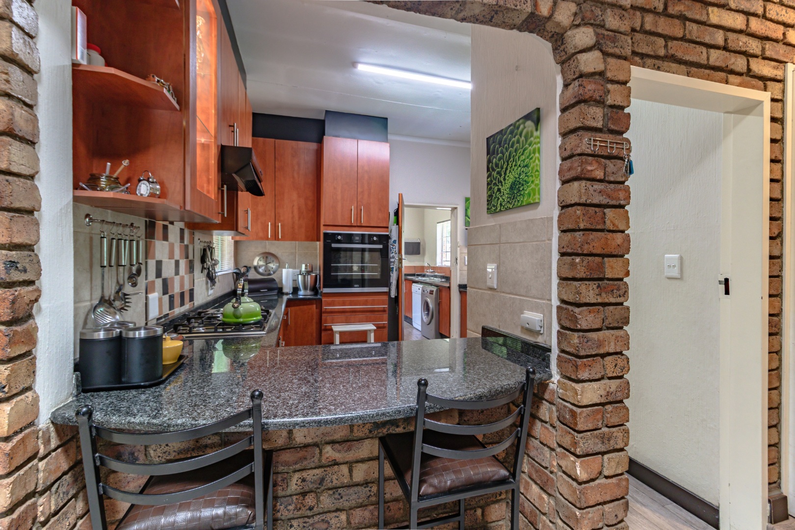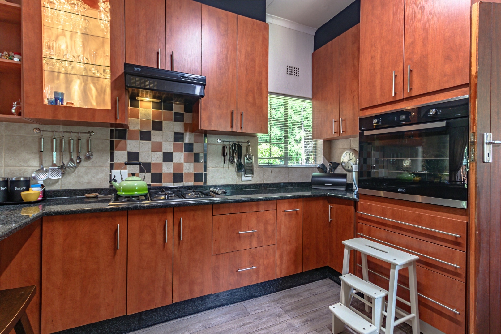The kitchen is well-appointed with granite countertops, a gas hob and eye-level electric oven, ample cupboard space, and a separate scullery, offering both functionality and style for the modern family.