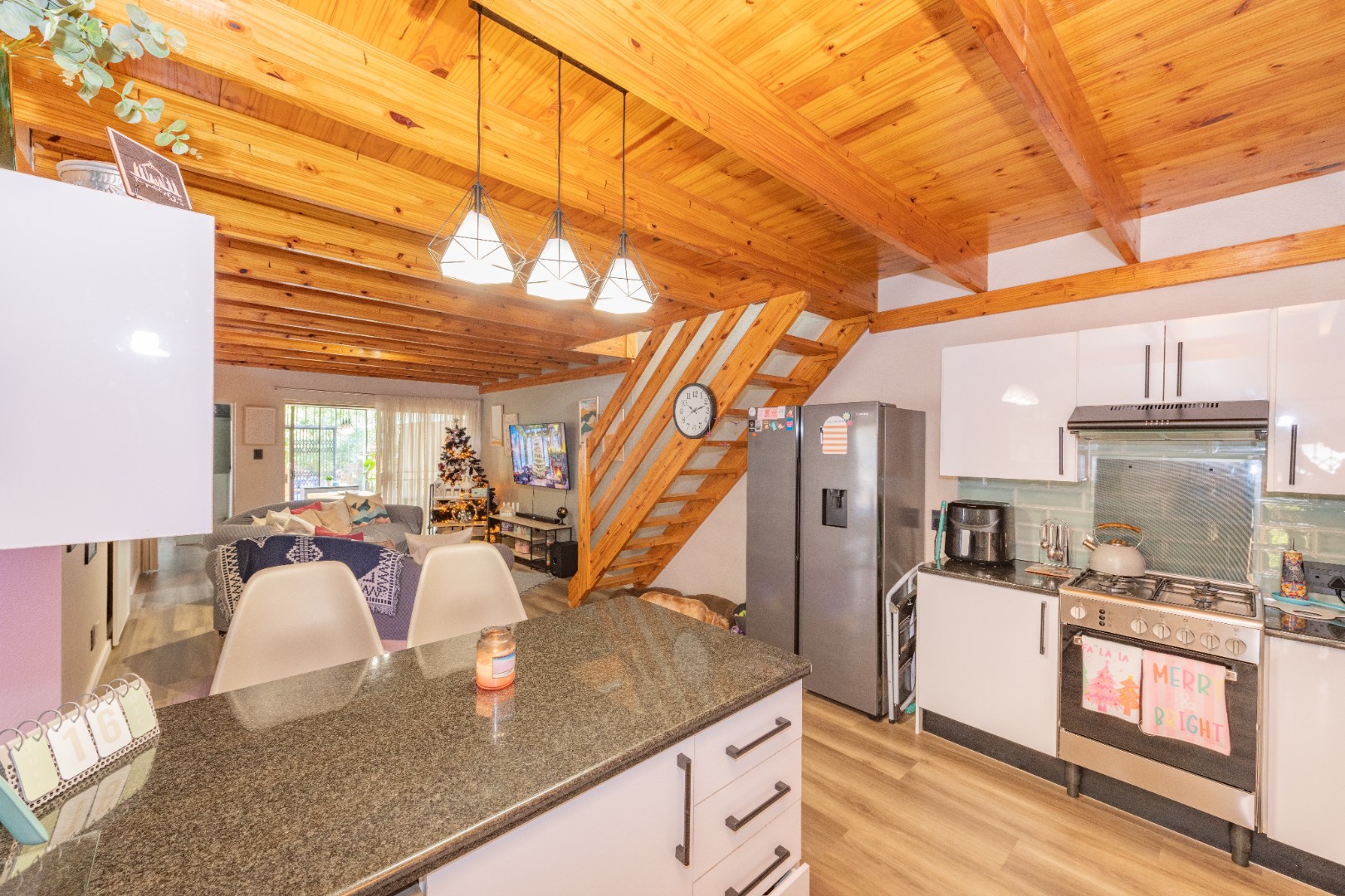 The stunning open plan kitchen with granite counters, a breakfast nook, and ample space for your double door fridge/freezer and a separate chest freezer.