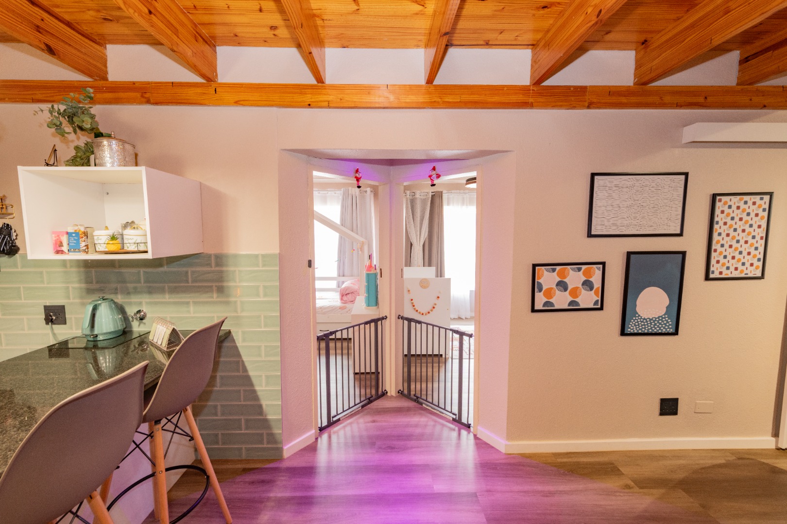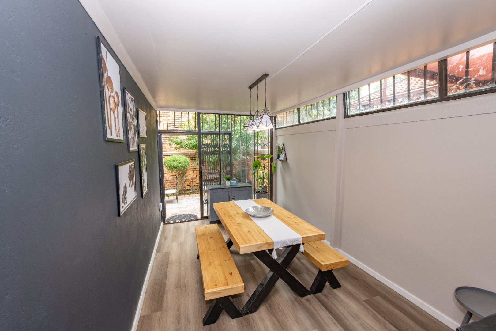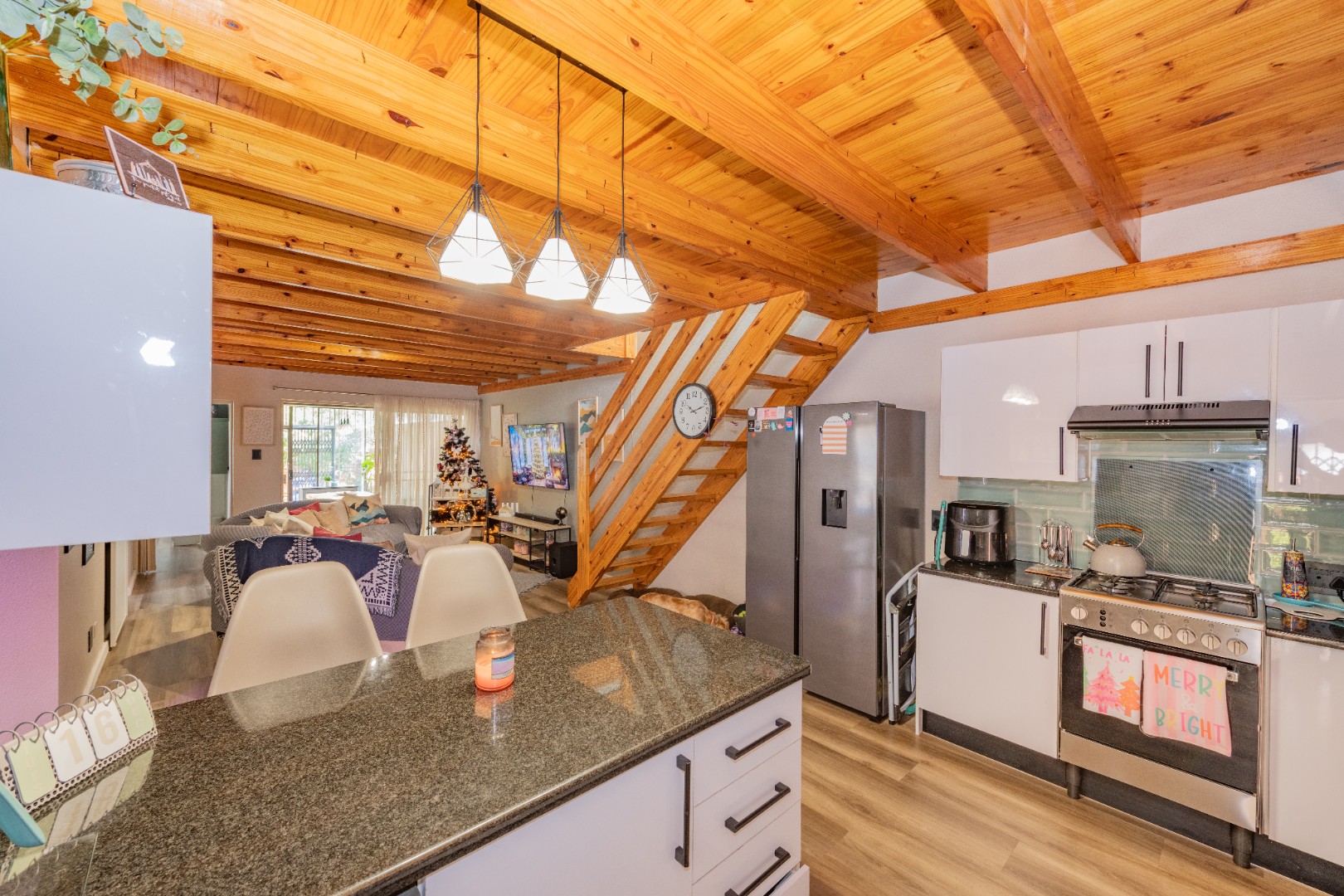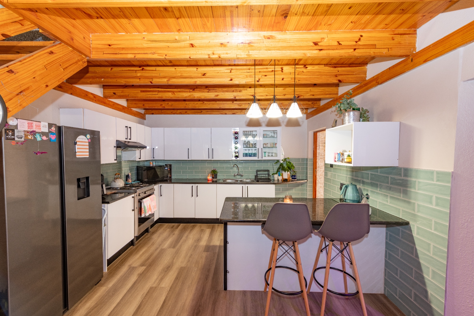 A newly renovated top-to-bottom 4 bedroom, 3 bathroom duplex with its vinyl flooring, and all bedrooms feature splendid ceiling fans. The 2 ultra modern full bathrooms (mes) are serviced by a gas geyser.