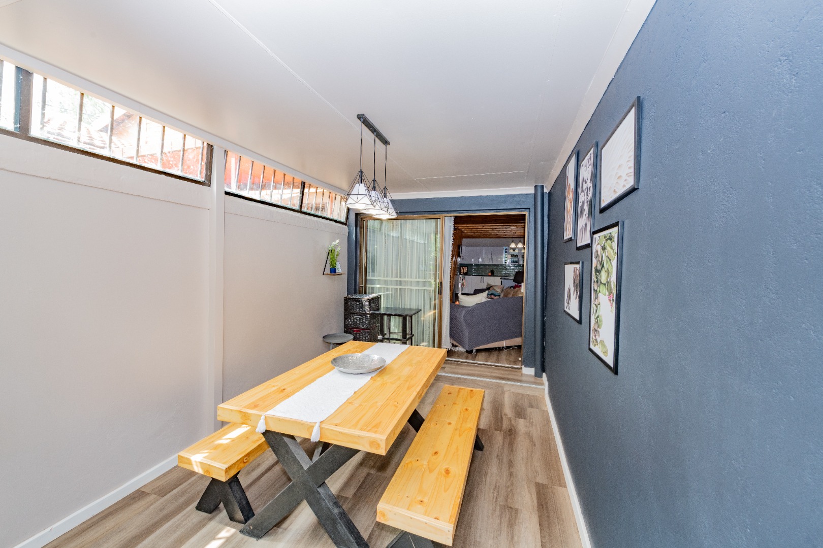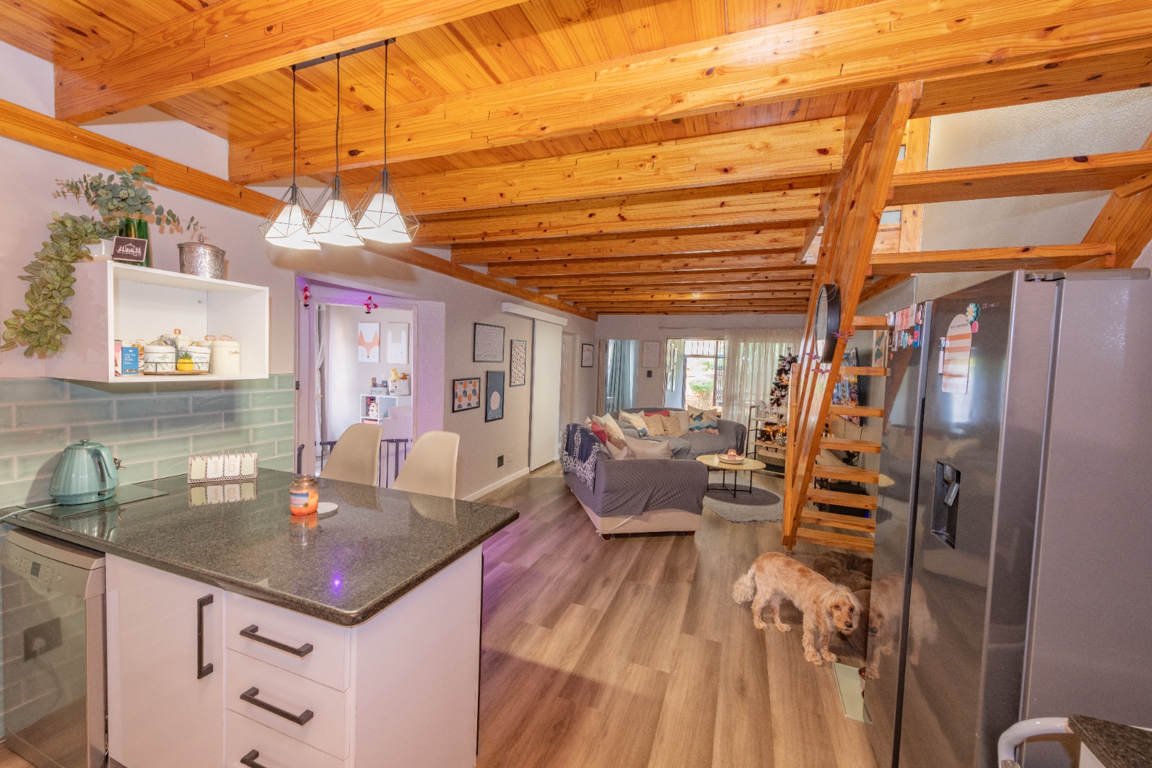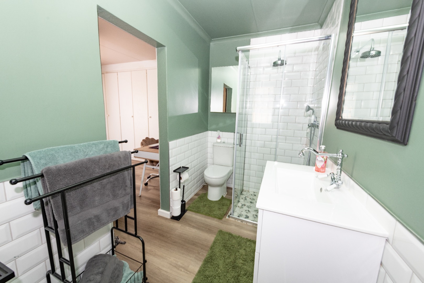 A newly renovated top-to-bottom 4 bedroom, 3 bathroom duplex with its vinyl flooring, and all bedrooms feature splendid ceiling fans. The 2 ultra modern full bathrooms (mes) are serviced by a gas geyser.