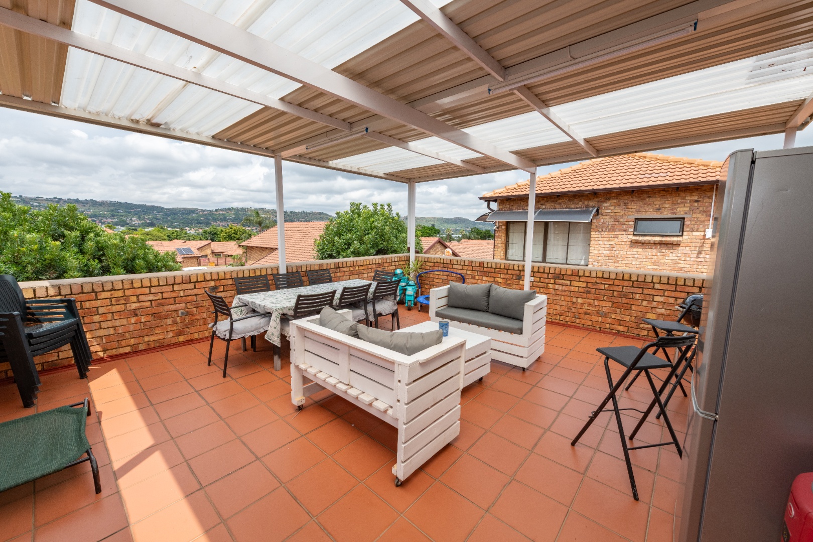 Upstairs: a bedroom and bathroom with adequate BICs, a study or family room and a huge roofed balcony above the double garage which offers spectacular views.
