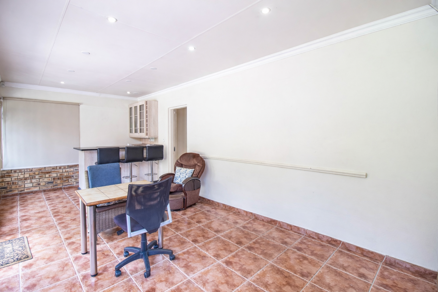 - Modern entertainment room with bar/coffee station, blinds, awnings, and security trellidors