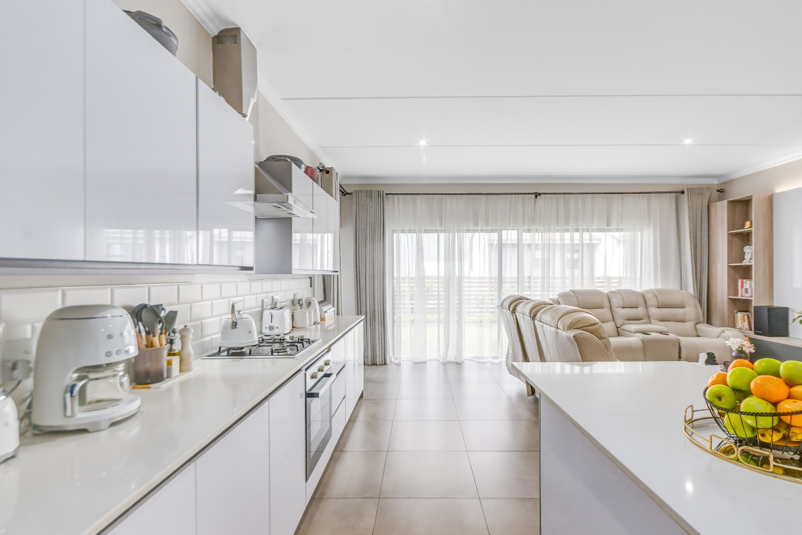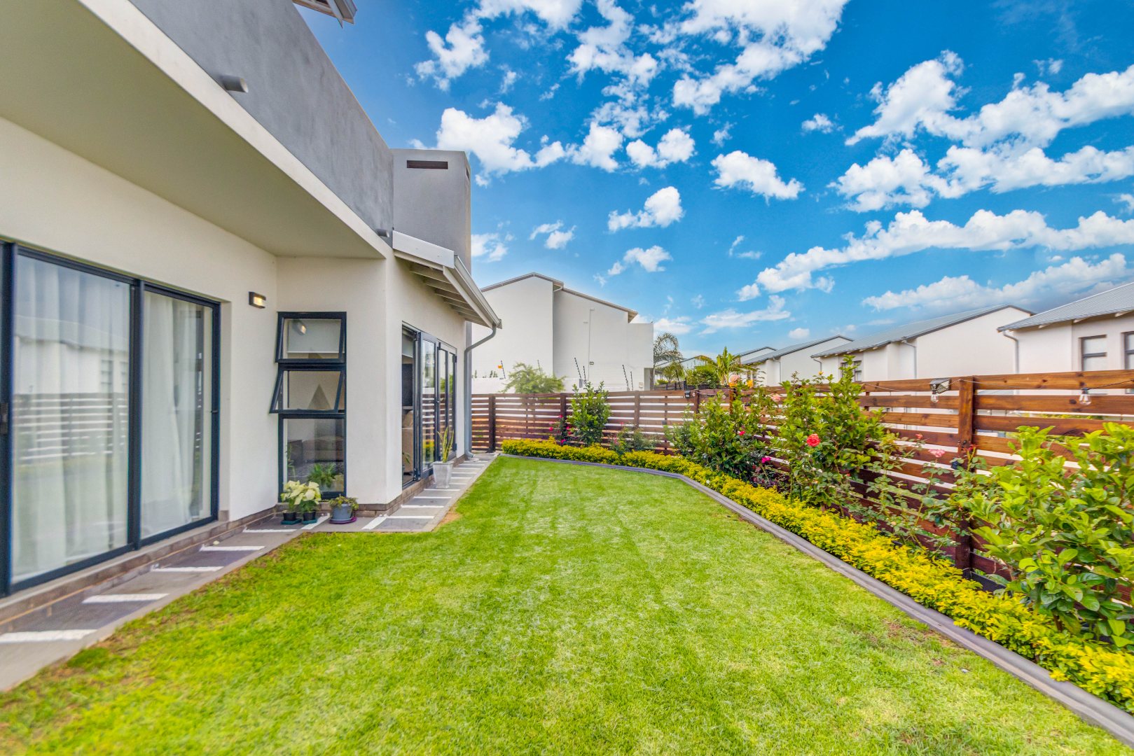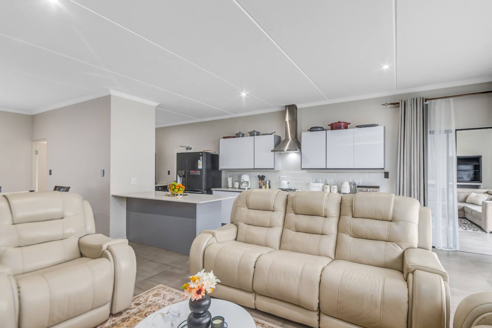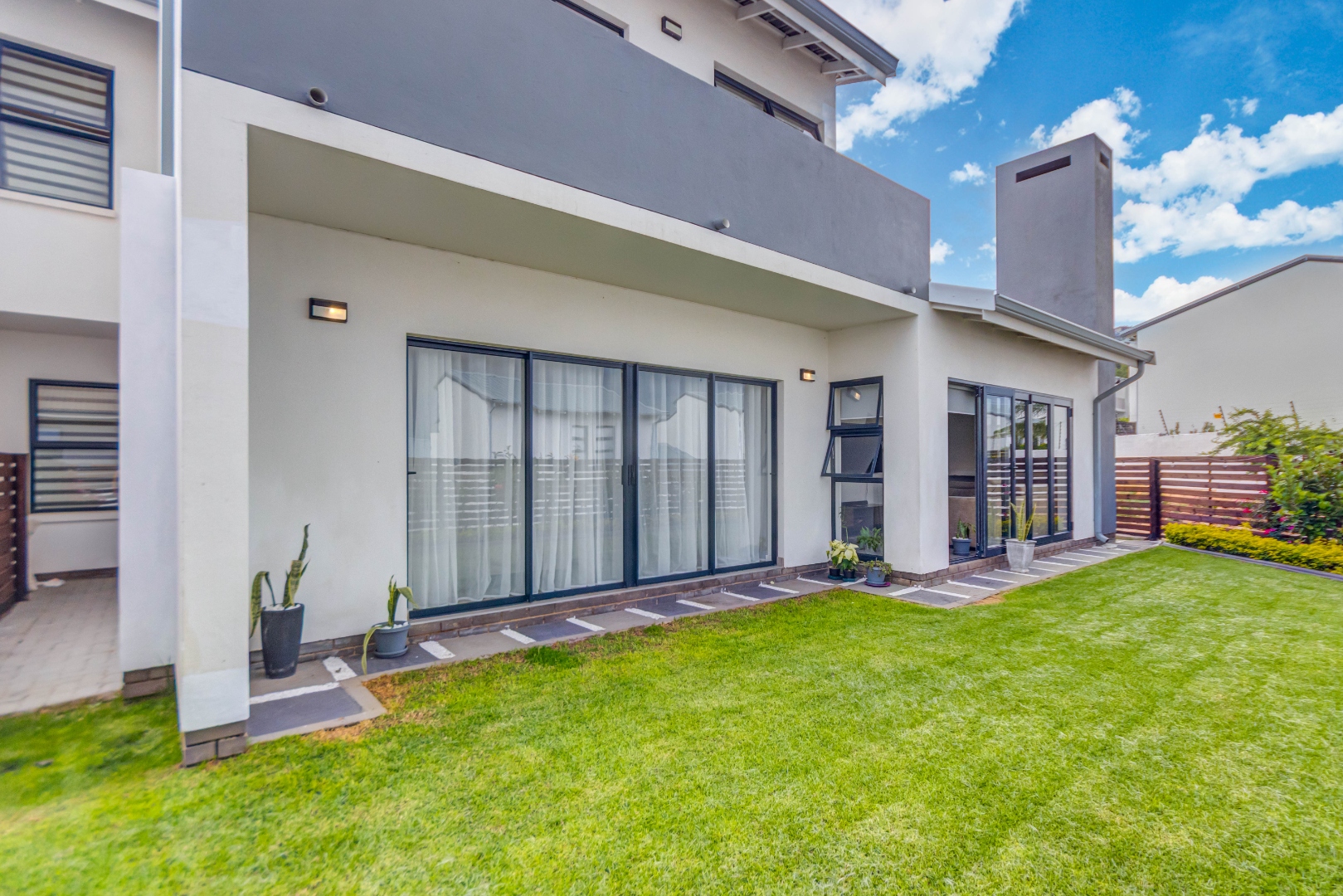 Downstairs features airy open-plan living, anchored by a modern, fully equipped kitchen with stone countertops, gas hob and ample cabinetry, flowing into a scullery with space for under-counter appliances. The dining and lounge areas link seamlessly to an indoor outdoor entertainment space that opens onto the garden via stacking doors, while large sliding doors lead to a private garden. A guest toilet adds everyday convenience.