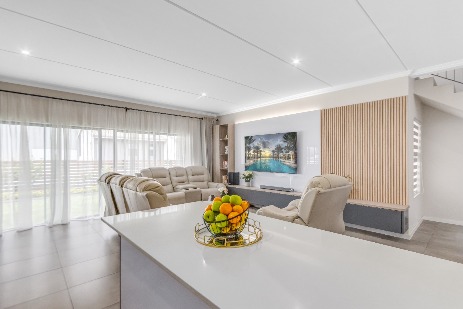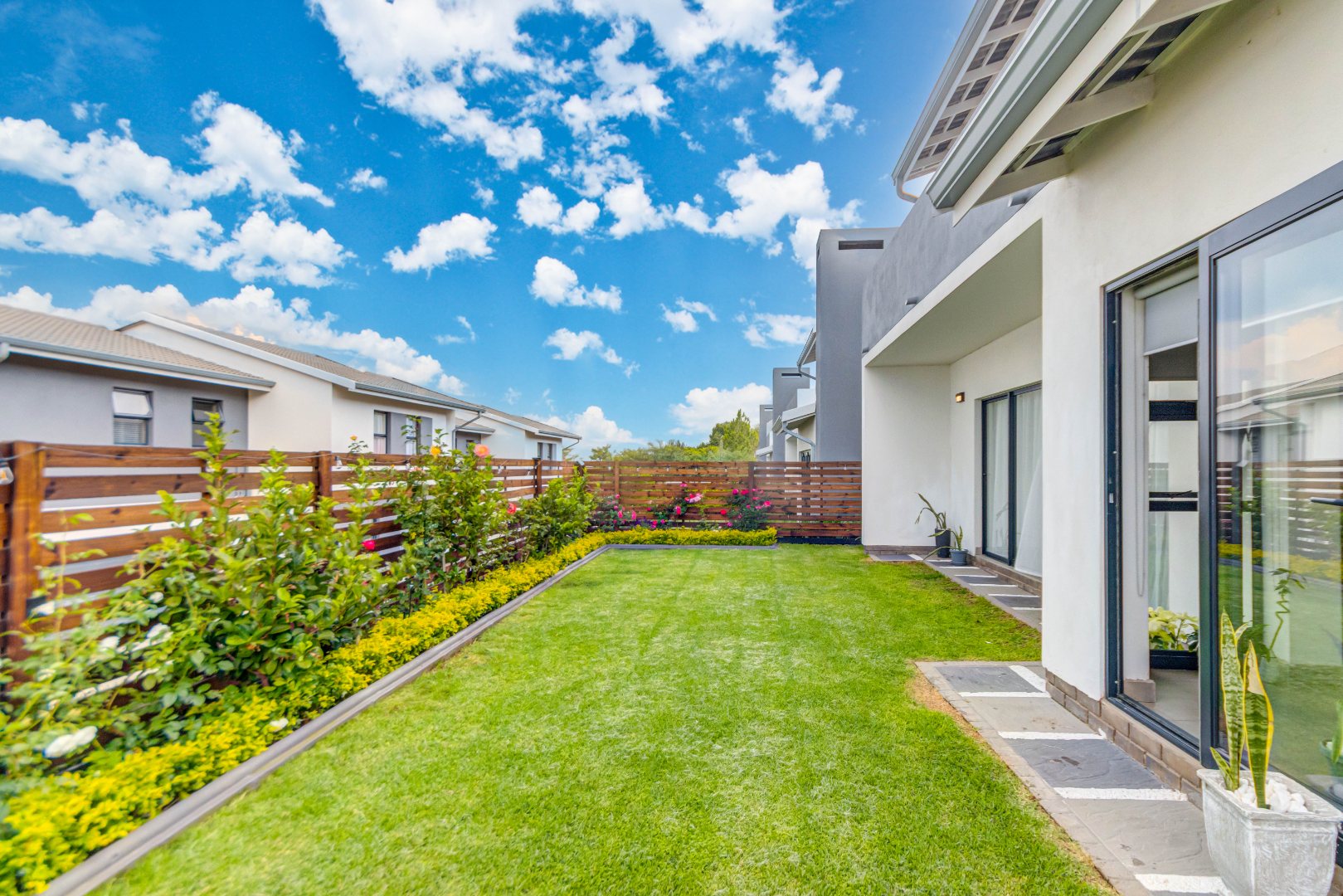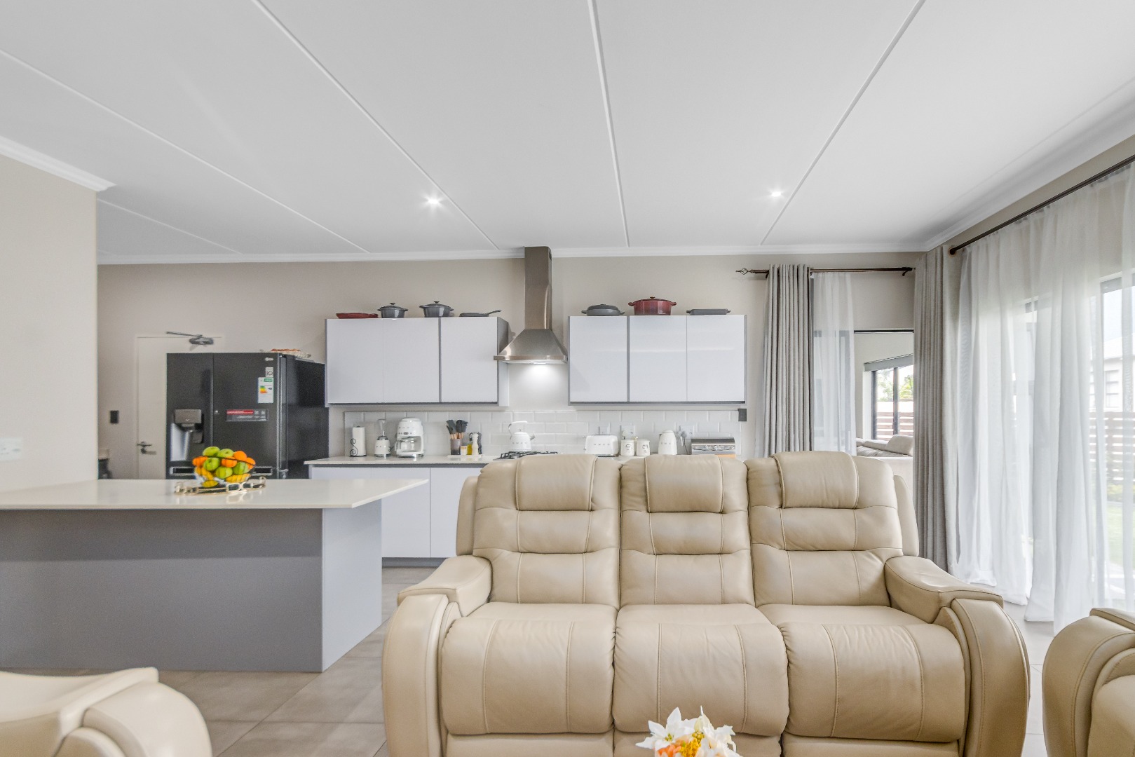 Downstairs features airy open-plan living, anchored by a modern, fully equipped kitchen with stone countertops, gas hob and ample cabinetry, flowing into a scullery with space for under-counter appliances. The dining and lounge areas link seamlessly to an indoor outdoor entertainment space that opens onto the garden via stacking doors, while large sliding doors lead to a private garden. A guest toilet adds everyday convenience.