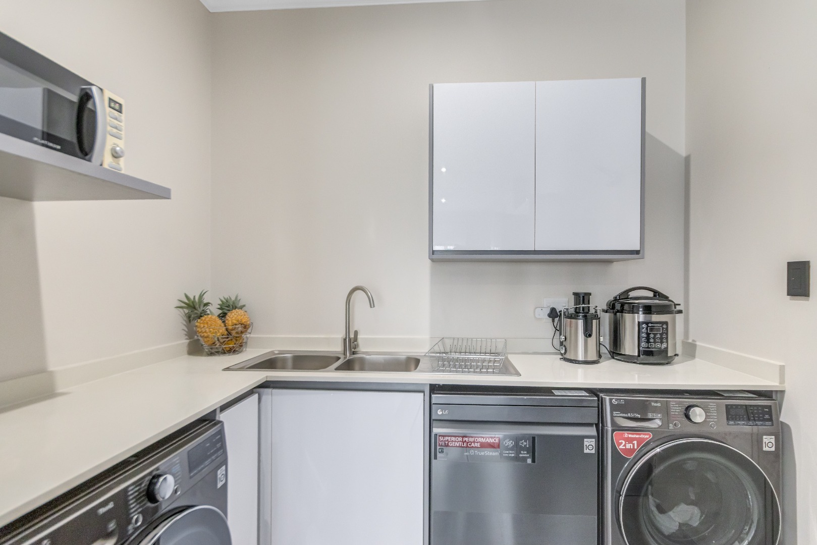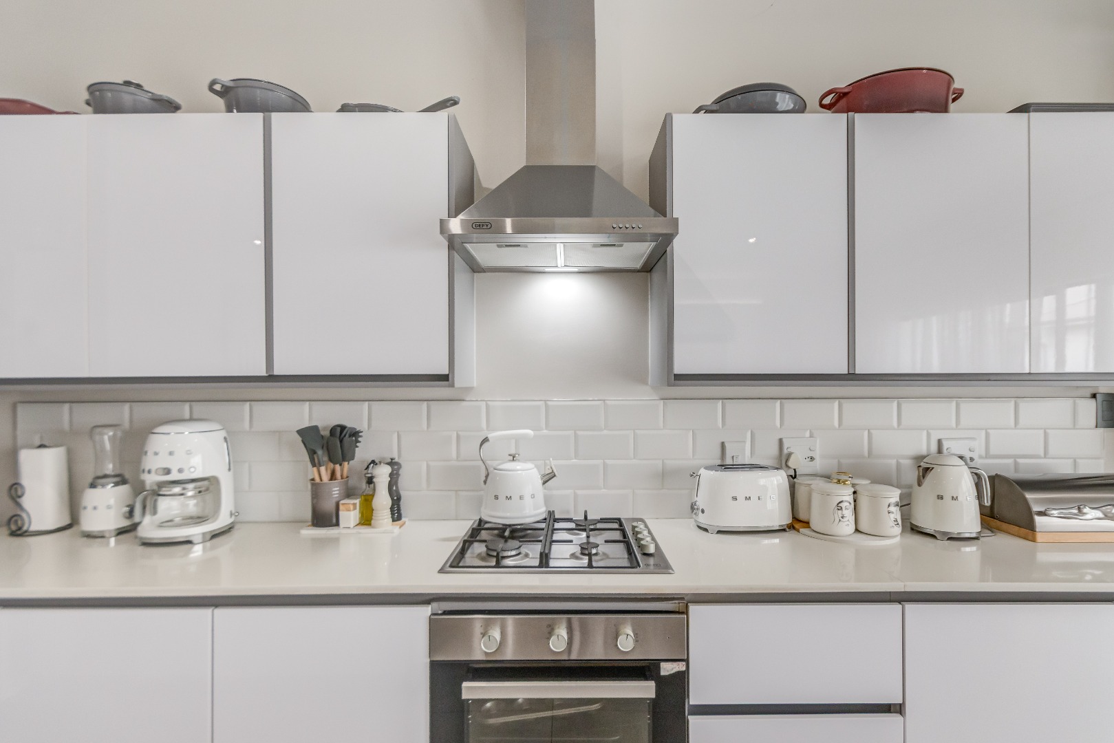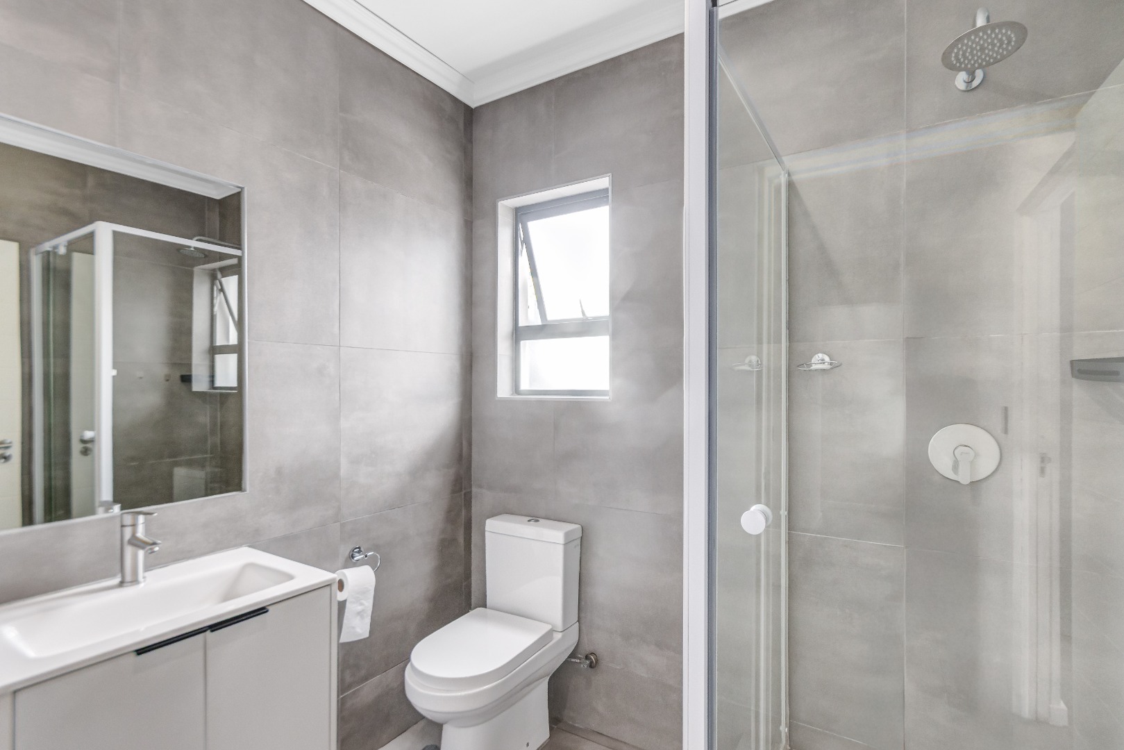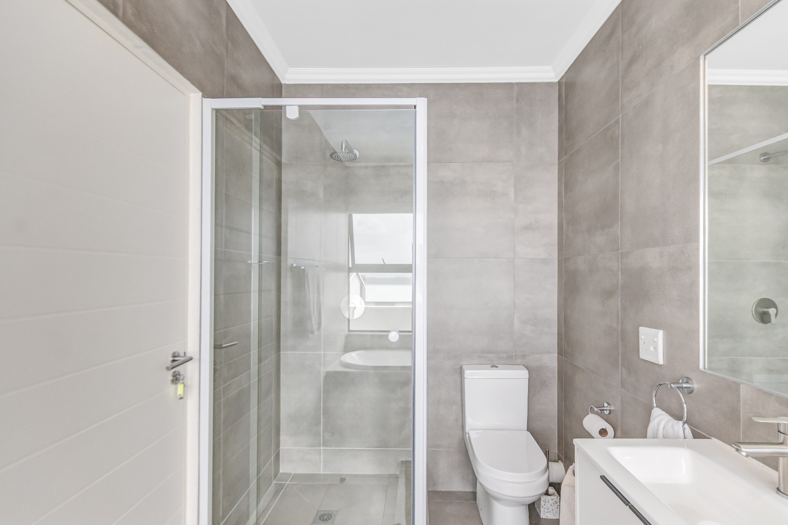 Downstairs features airy open-plan living, anchored by a modern, fully equipped kitchen with stone countertops, gas hob and ample cabinetry, flowing into a scullery with space for under-counter appliances. The dining and lounge areas link seamlessly to an indoor outdoor entertainment space that opens onto the garden via stacking doors, while large sliding doors lead to a private garden. A guest toilet adds everyday convenience.