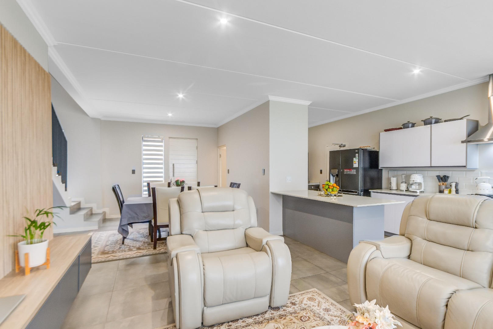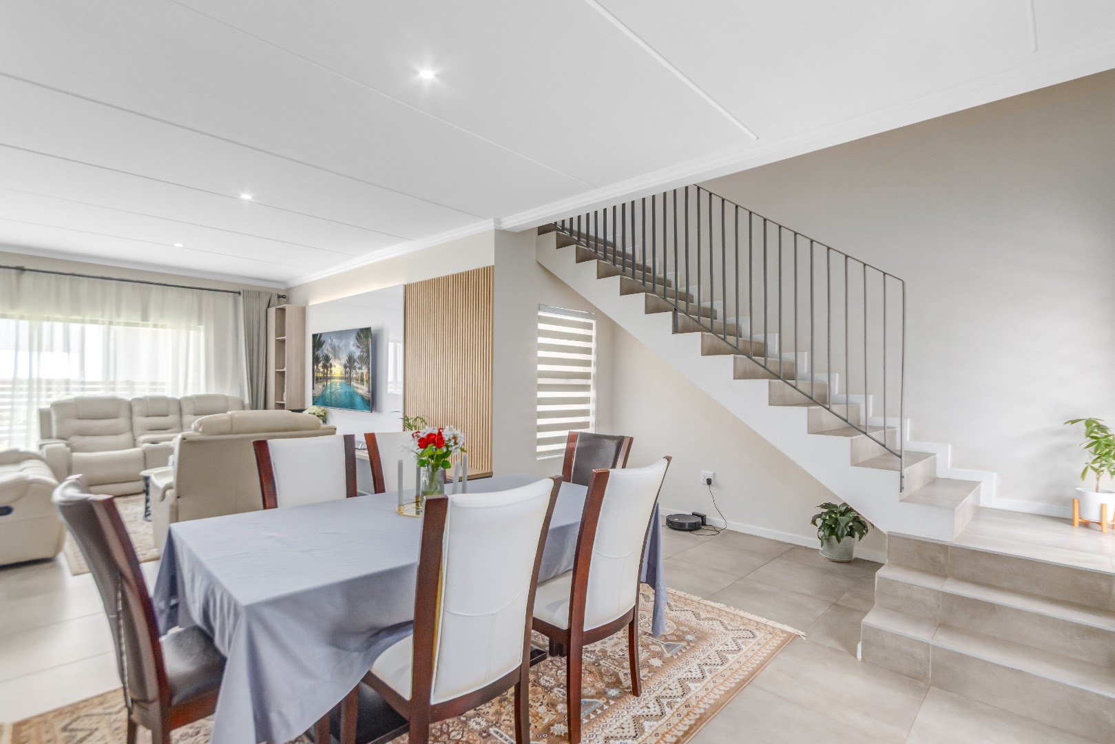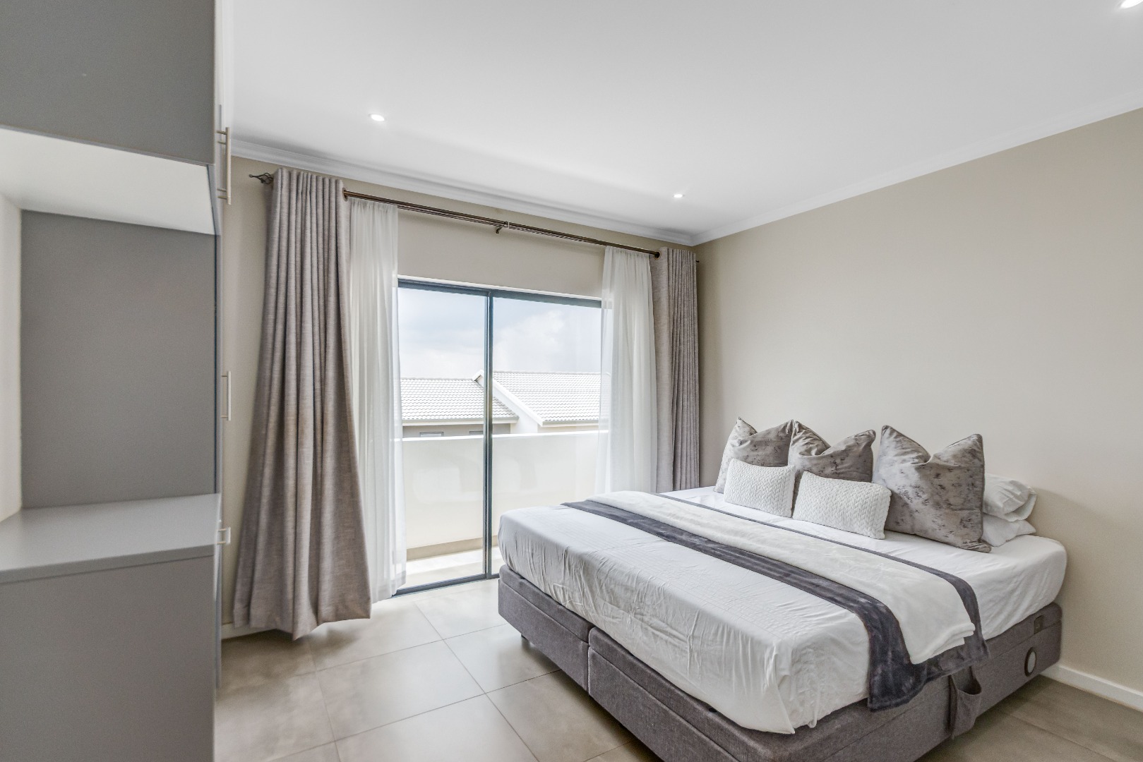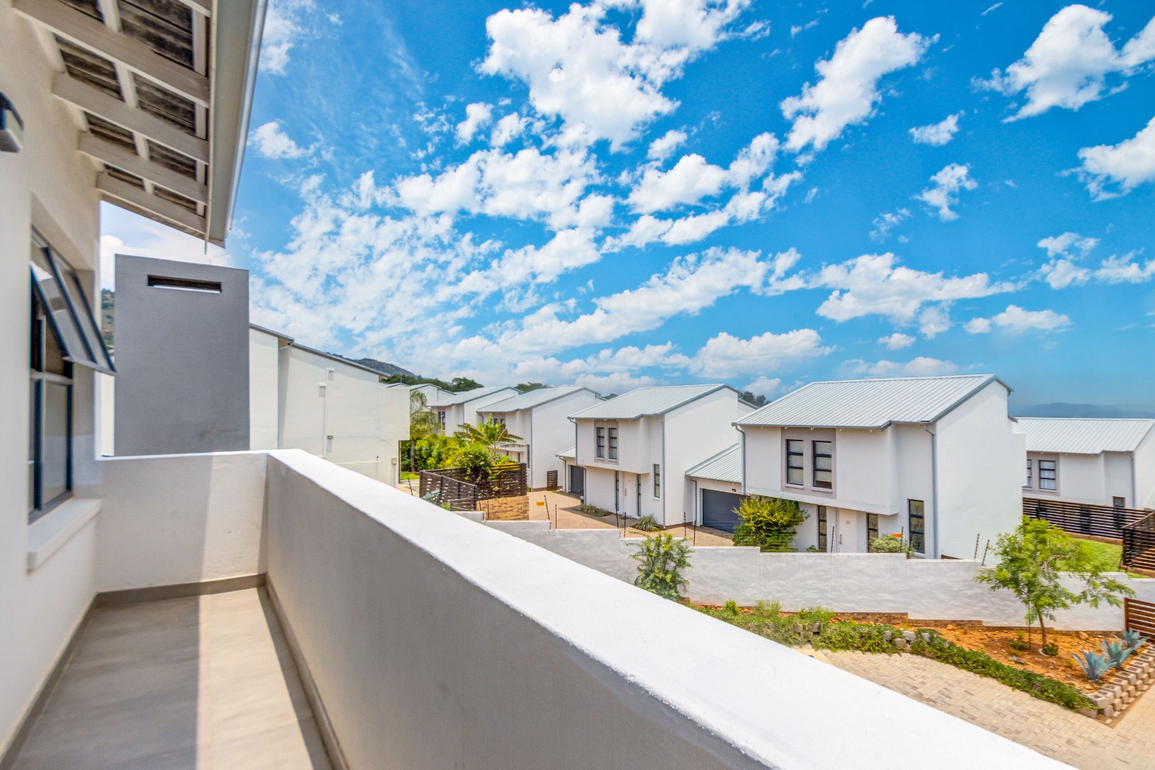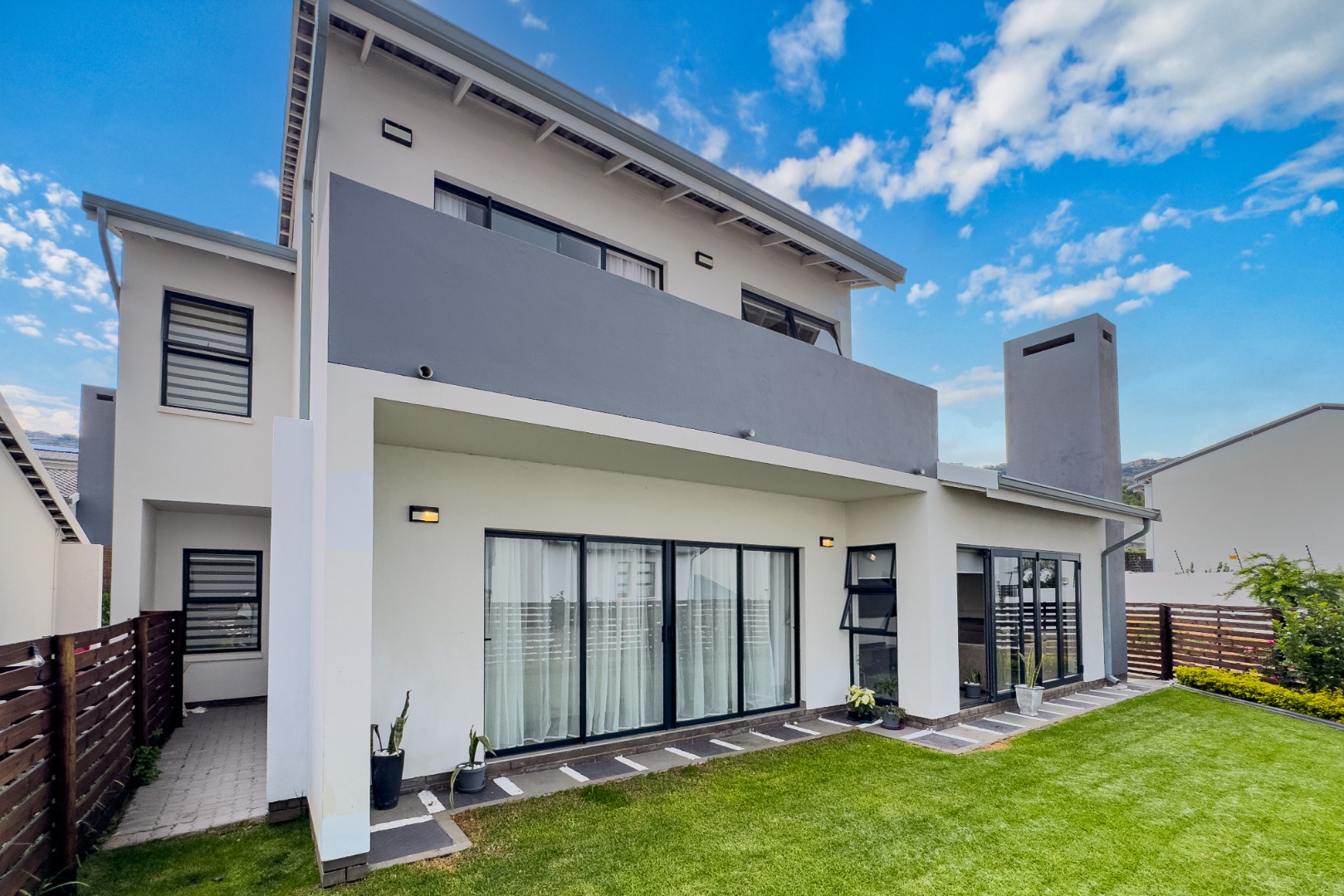 Upstairs, three spacious and well-lit bedrooms with built-in cupboards are complemented by two modern bathrooms, including a main en-suite with a bathtub. The main bedroom also enjoys a private balcony with distant views of the Magaliesberg mountains. Completing the home is a double automated garage, additional parking and modern touches throughout.