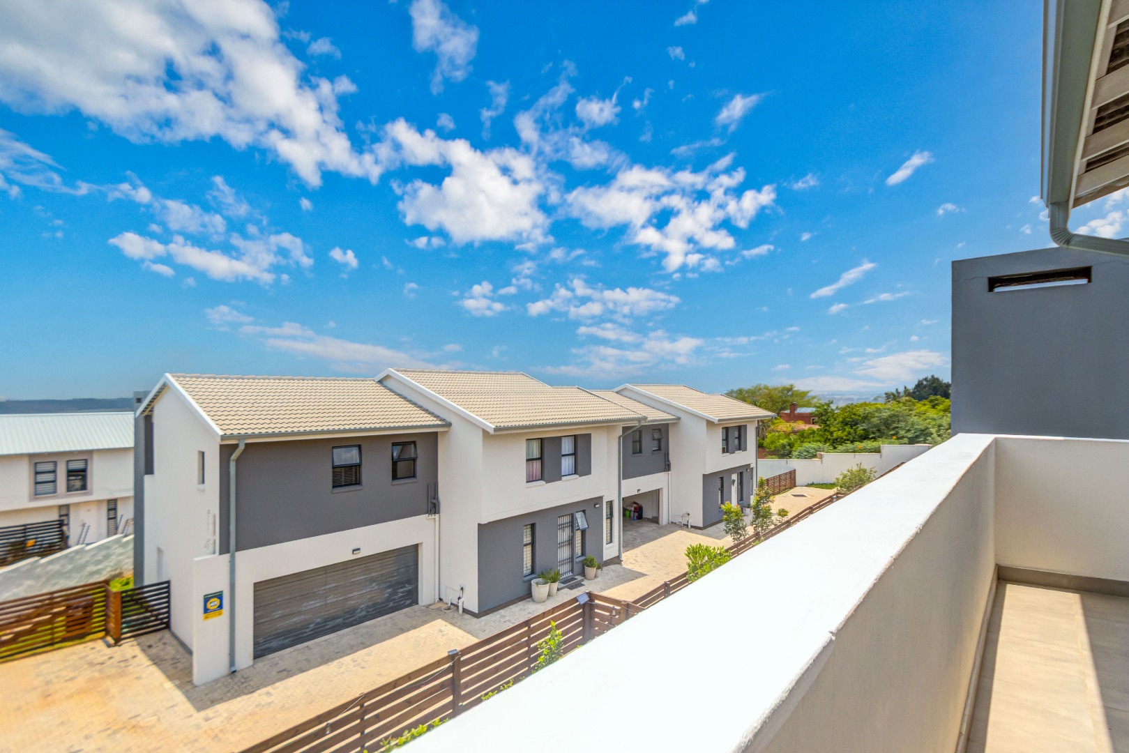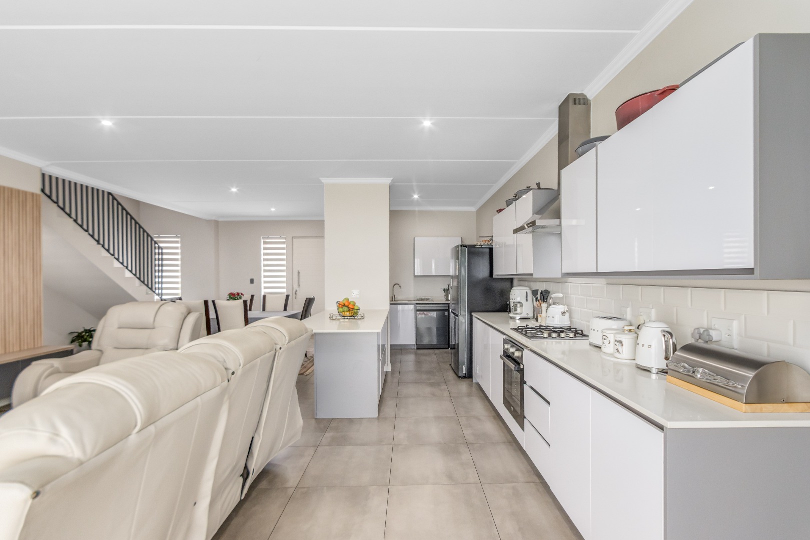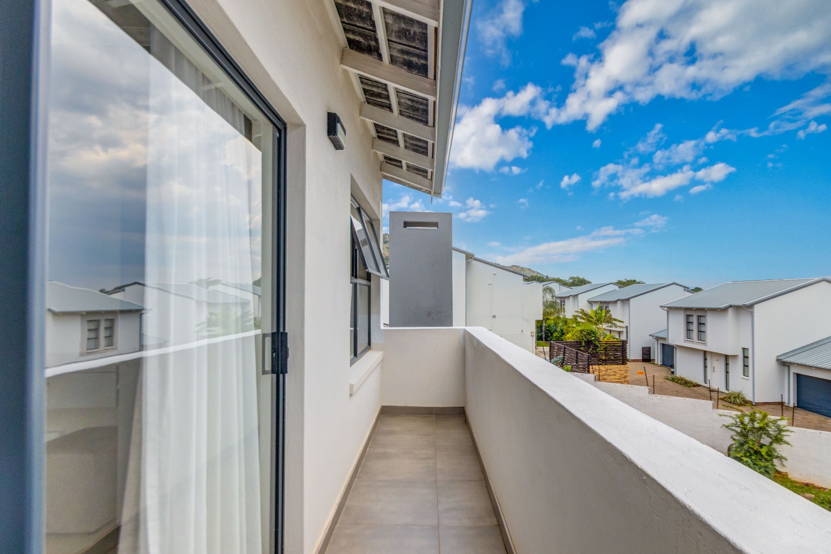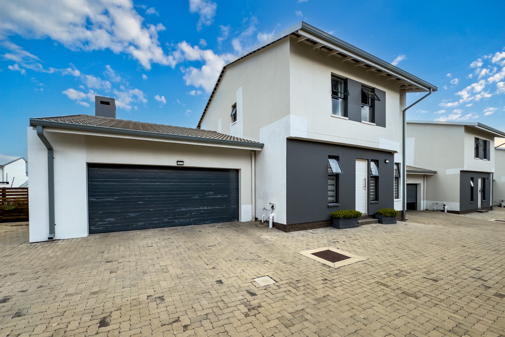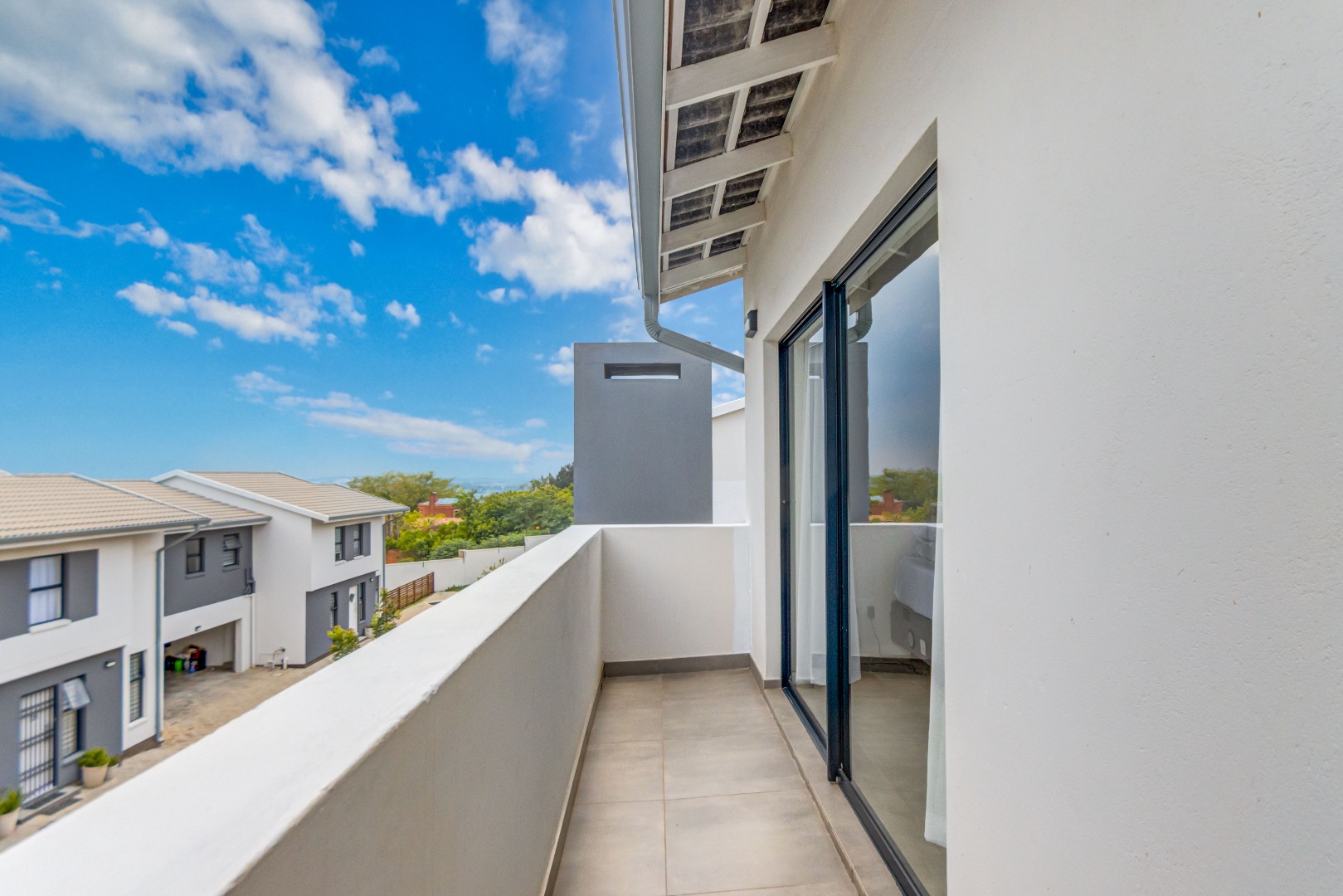 Upstairs, three spacious and well-lit bedrooms with built-in cupboards are complemented by two modern bathrooms, including a main en-suite with a bathtub. The main bedroom also enjoys a private balcony with distant views of the Magaliesberg mountains. Completing the home is a double automated garage, additional parking and modern touches throughout.