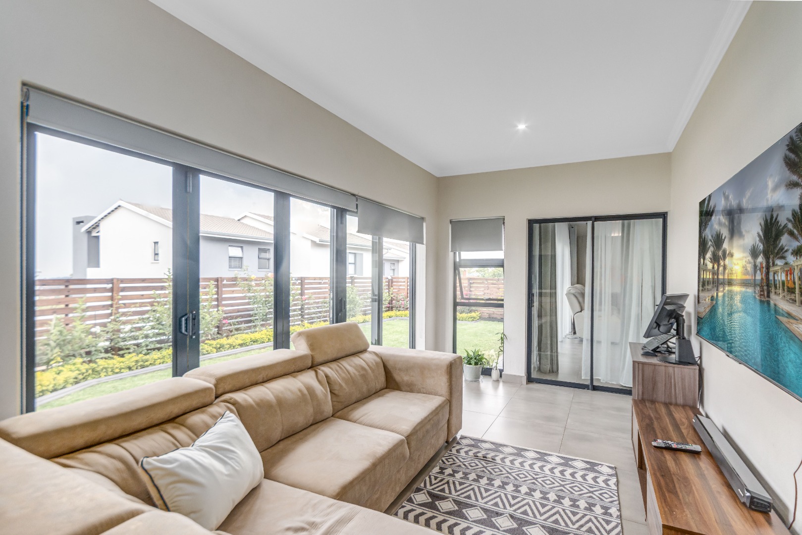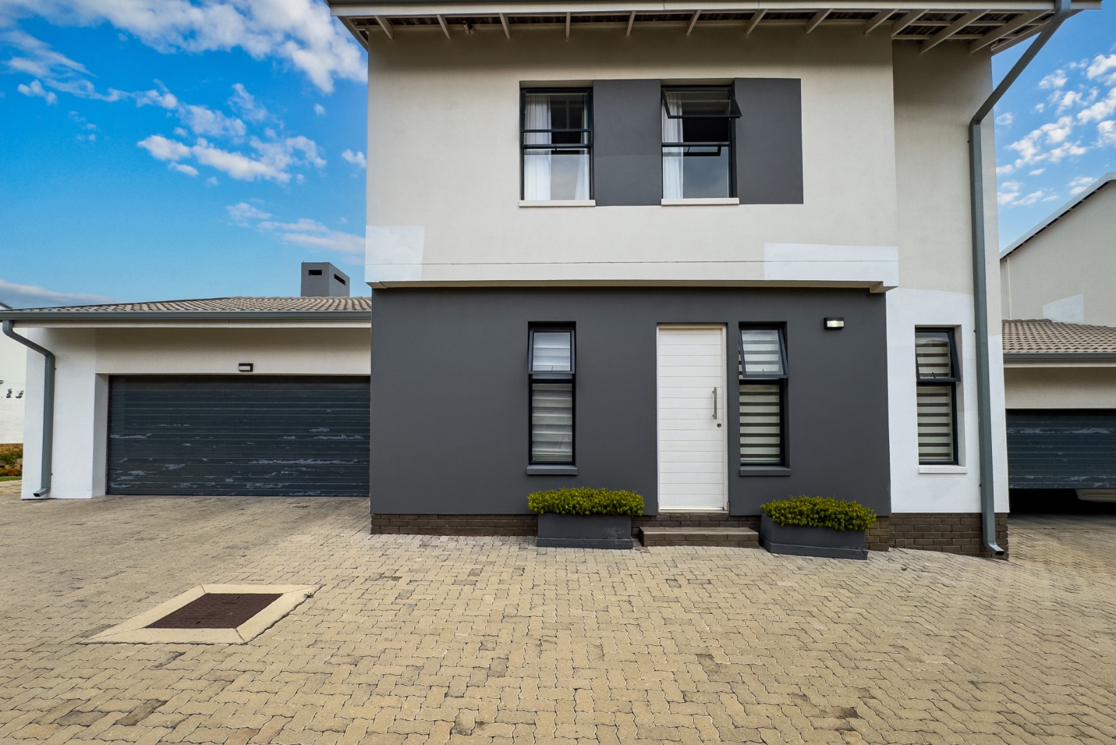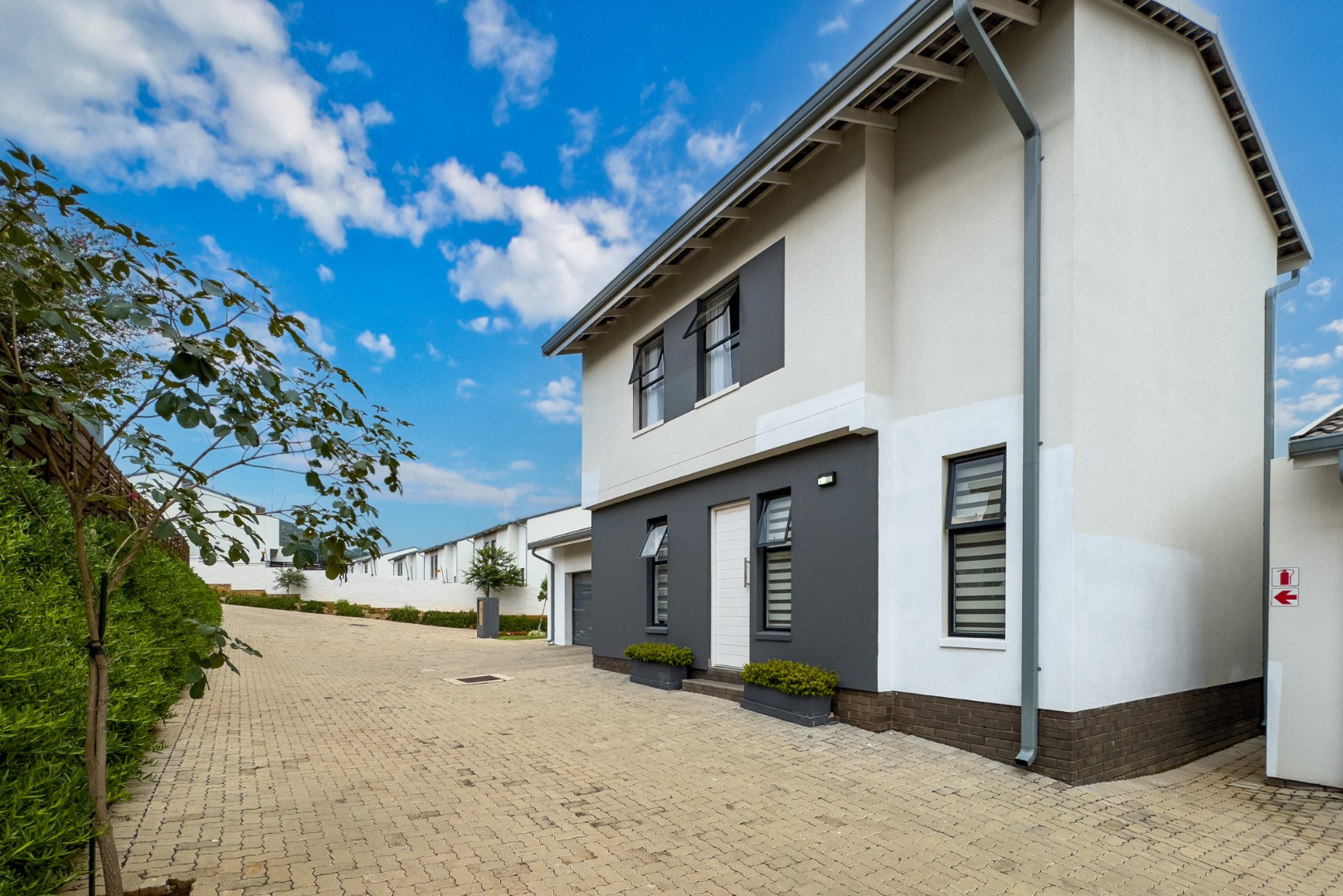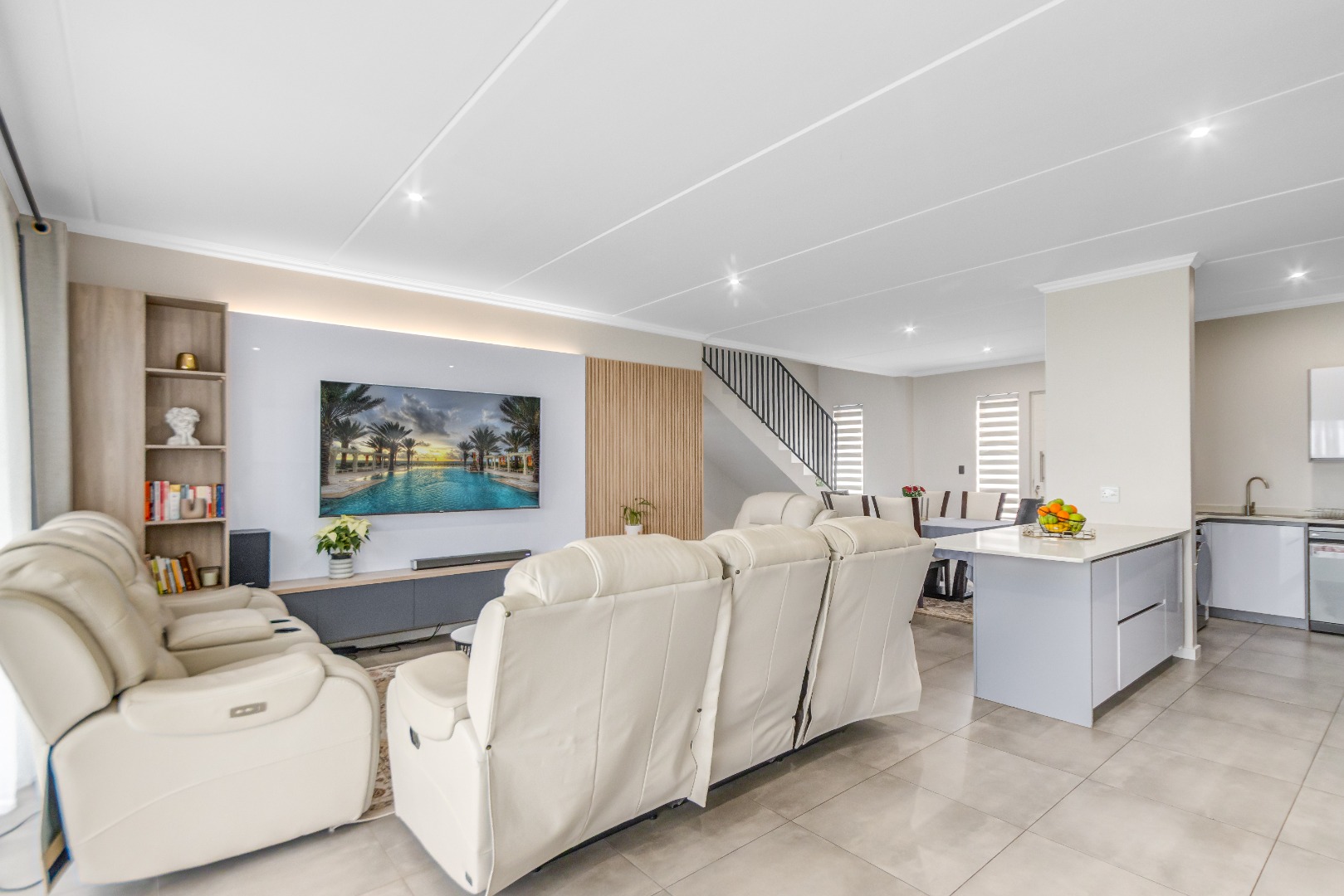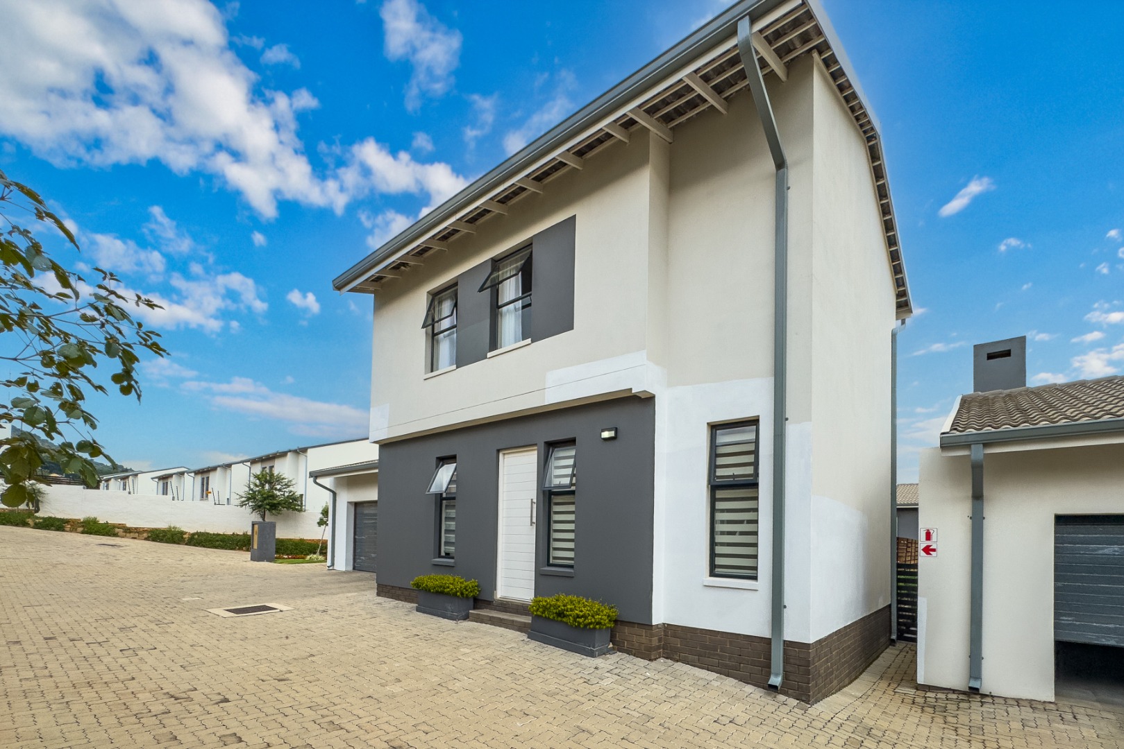 Upstairs, three spacious and well-lit bedrooms with built-in cupboards are complemented by two modern bathrooms, including a main en-suite with a bathtub. The main bedroom also enjoys a private balcony with distant views of the Magaliesberg mountains. Completing the home is a double automated garage, additional parking and modern touches throughout.