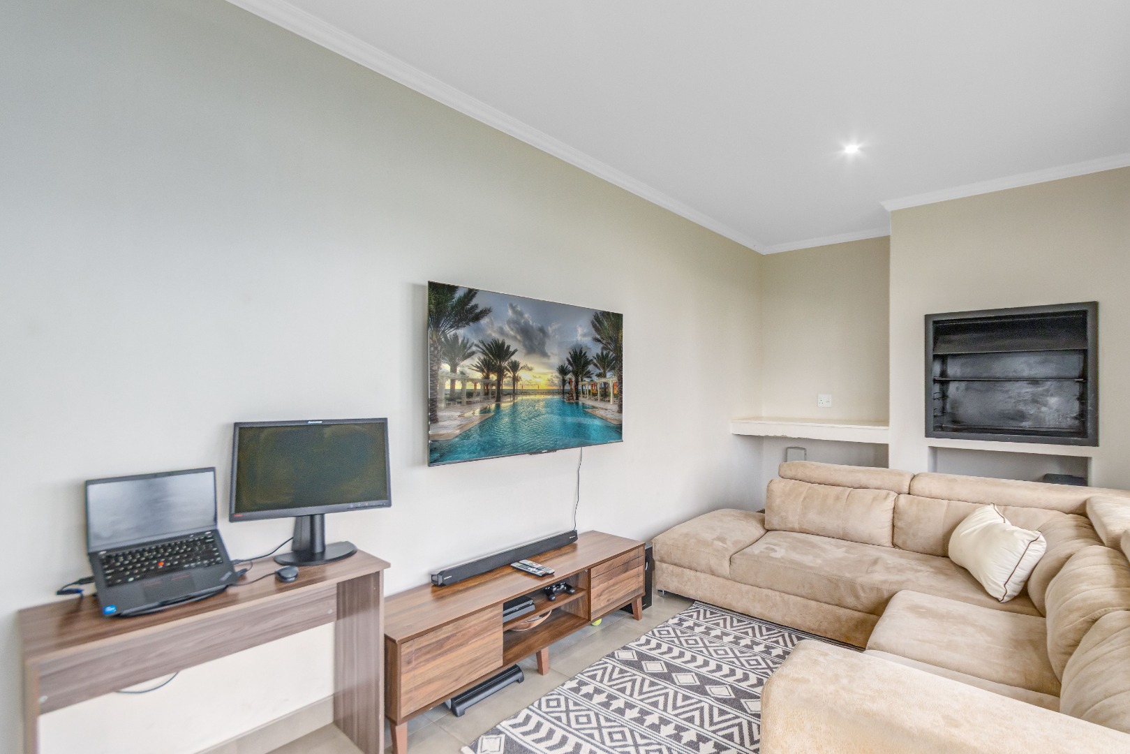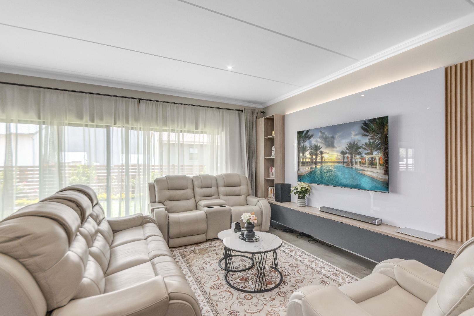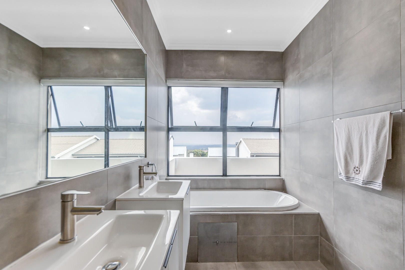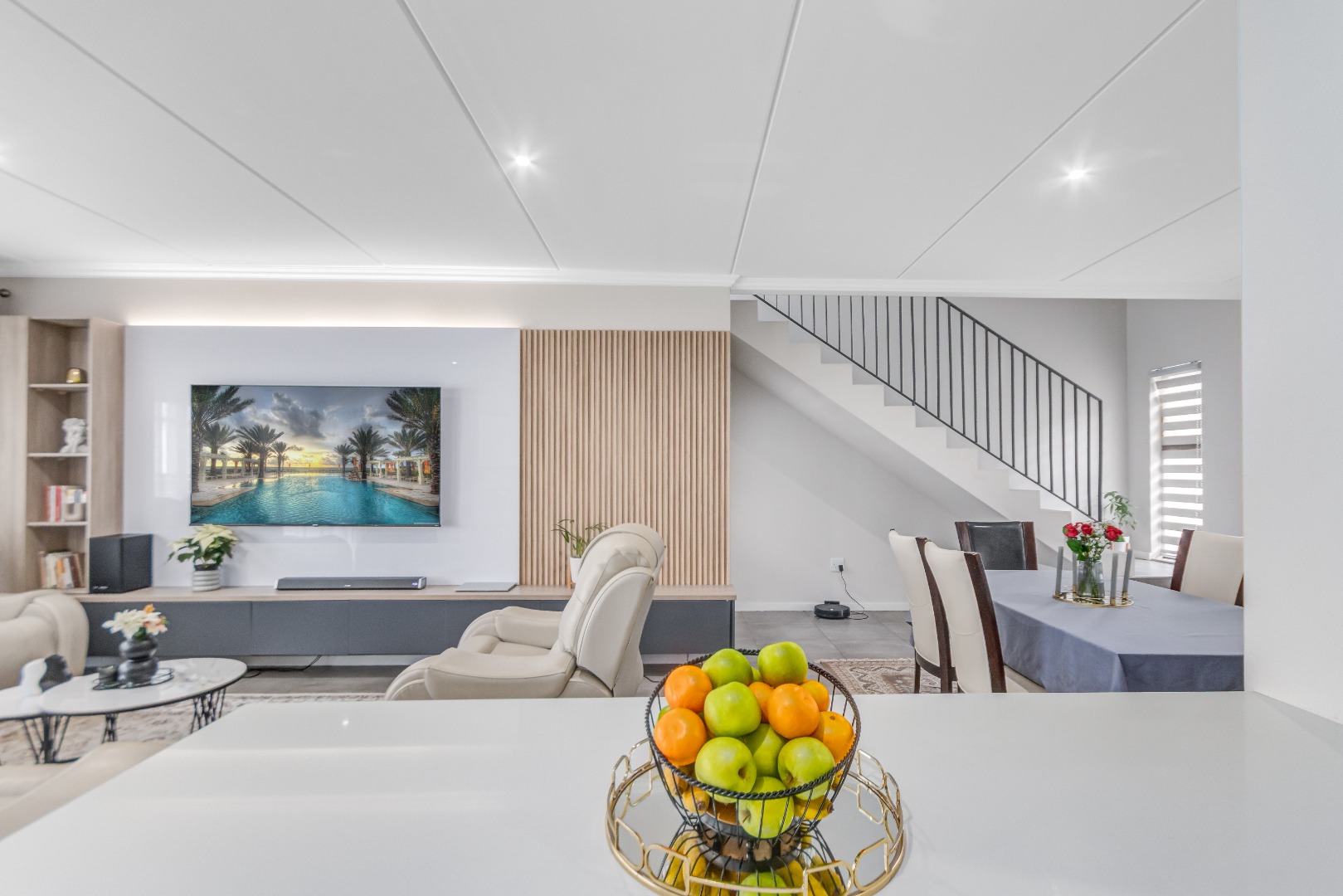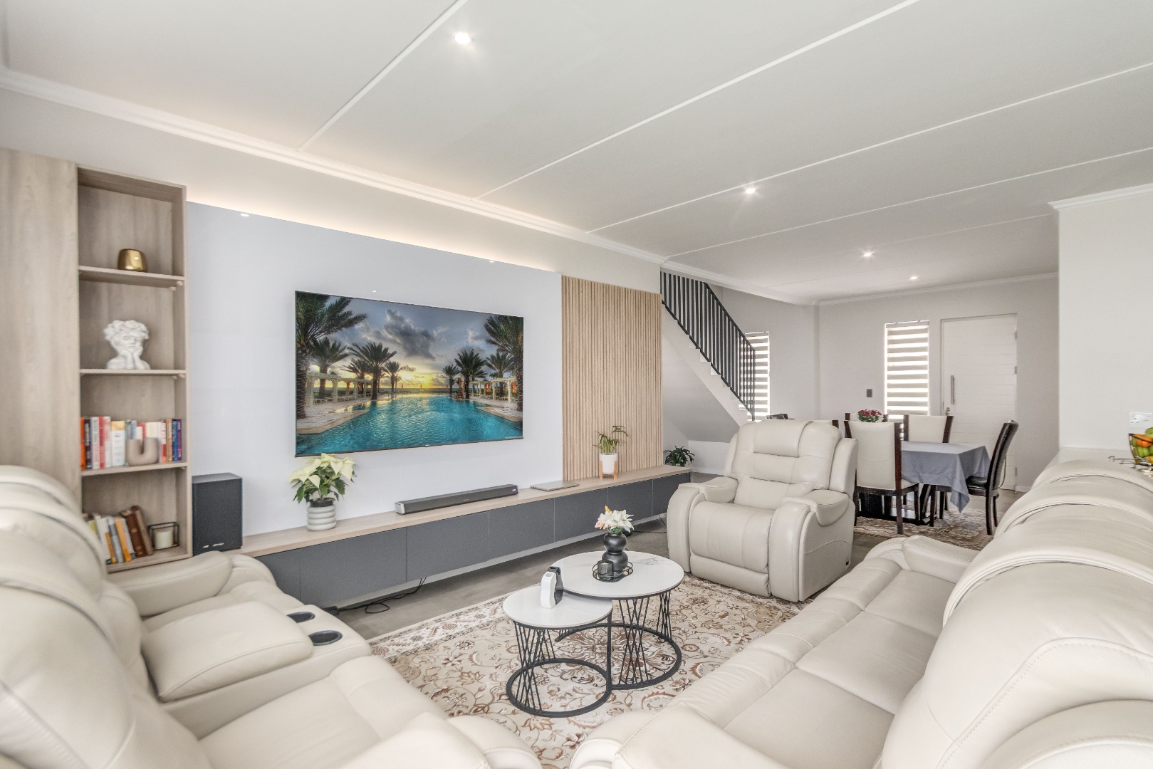 Upstairs, three spacious and well-lit bedrooms with built-in cupboards are complemented by two modern bathrooms, including a main en-suite with a bathtub. The main bedroom also enjoys a private balcony with distant views of the Magaliesberg mountains. Completing the home is a double automated garage, additional parking and modern touches throughout.
