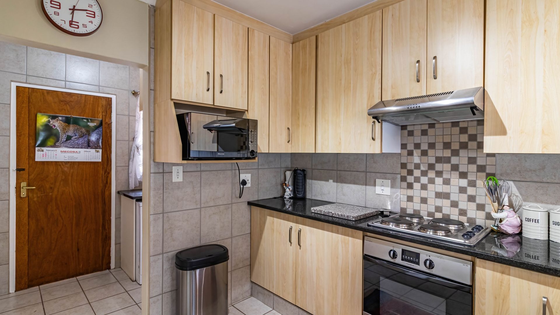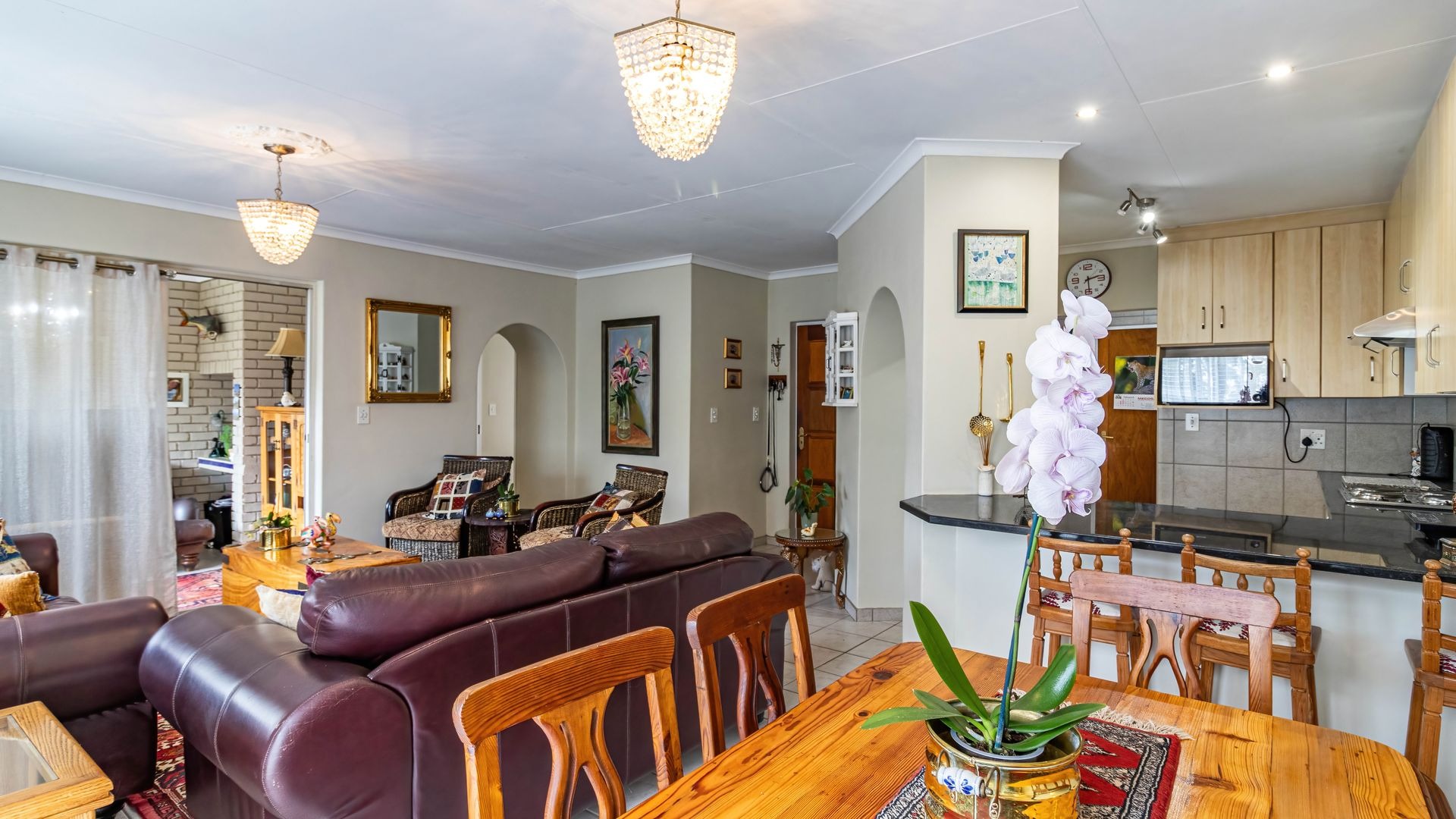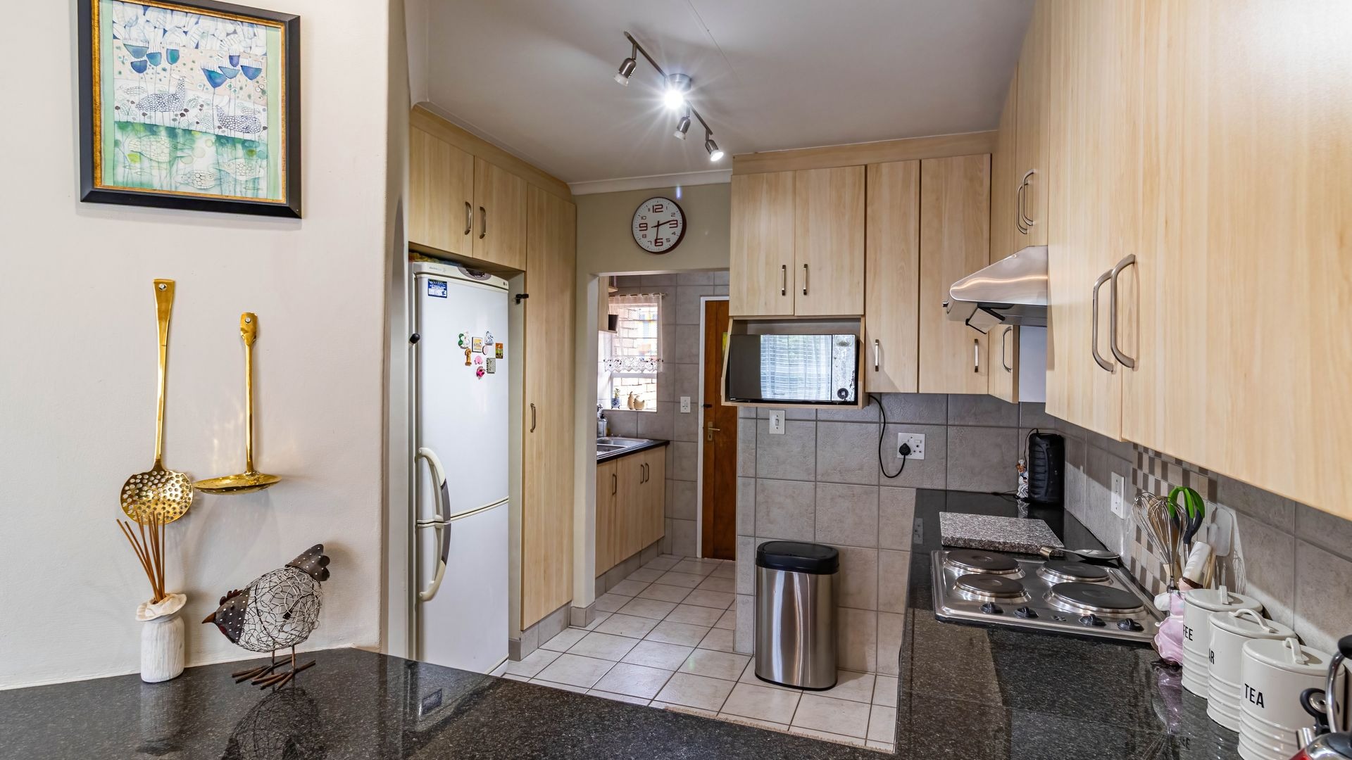 The living area flows seamlessly into a well designed kitchen fitted with granite countertops, a breakfast nook, electric four plate stove, oven, and extractor fan. A separate scullery and laundry area provides additional functionality with space for two appliances and direct access to a private courtyard, leading through to the garages.
