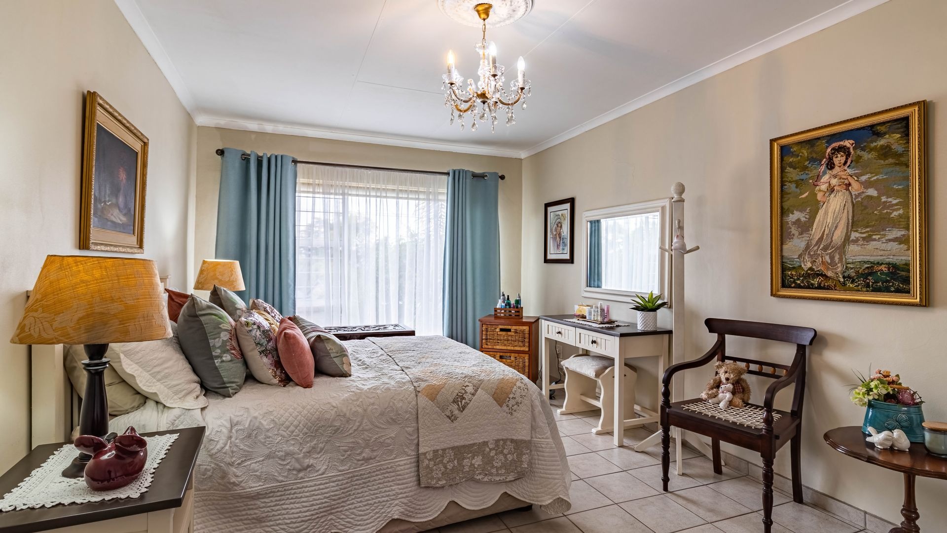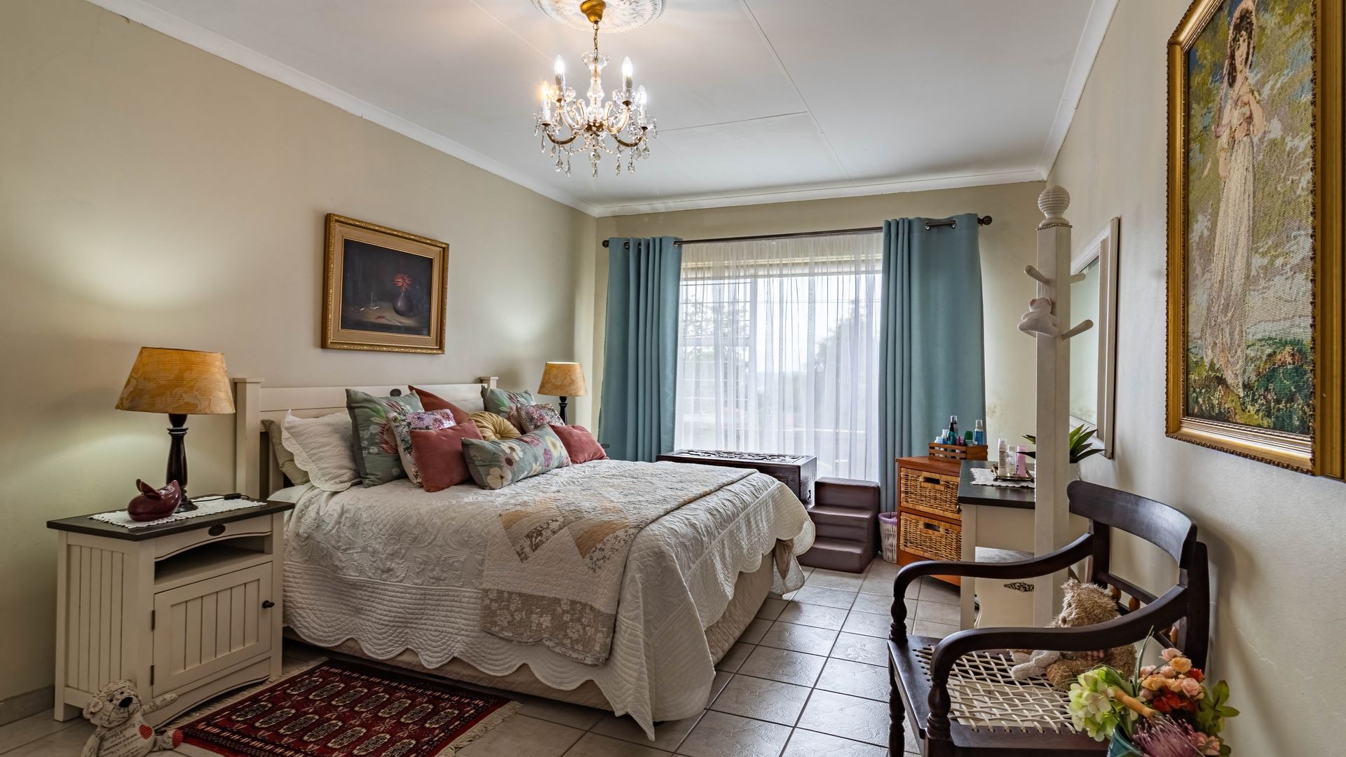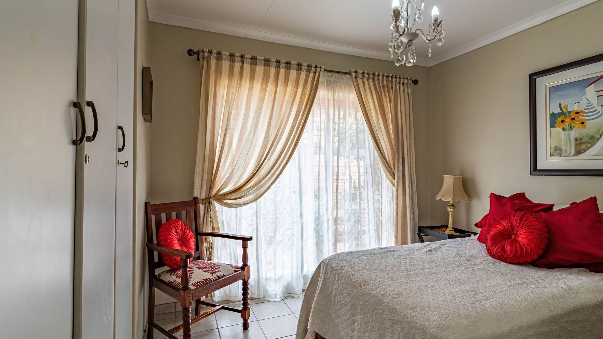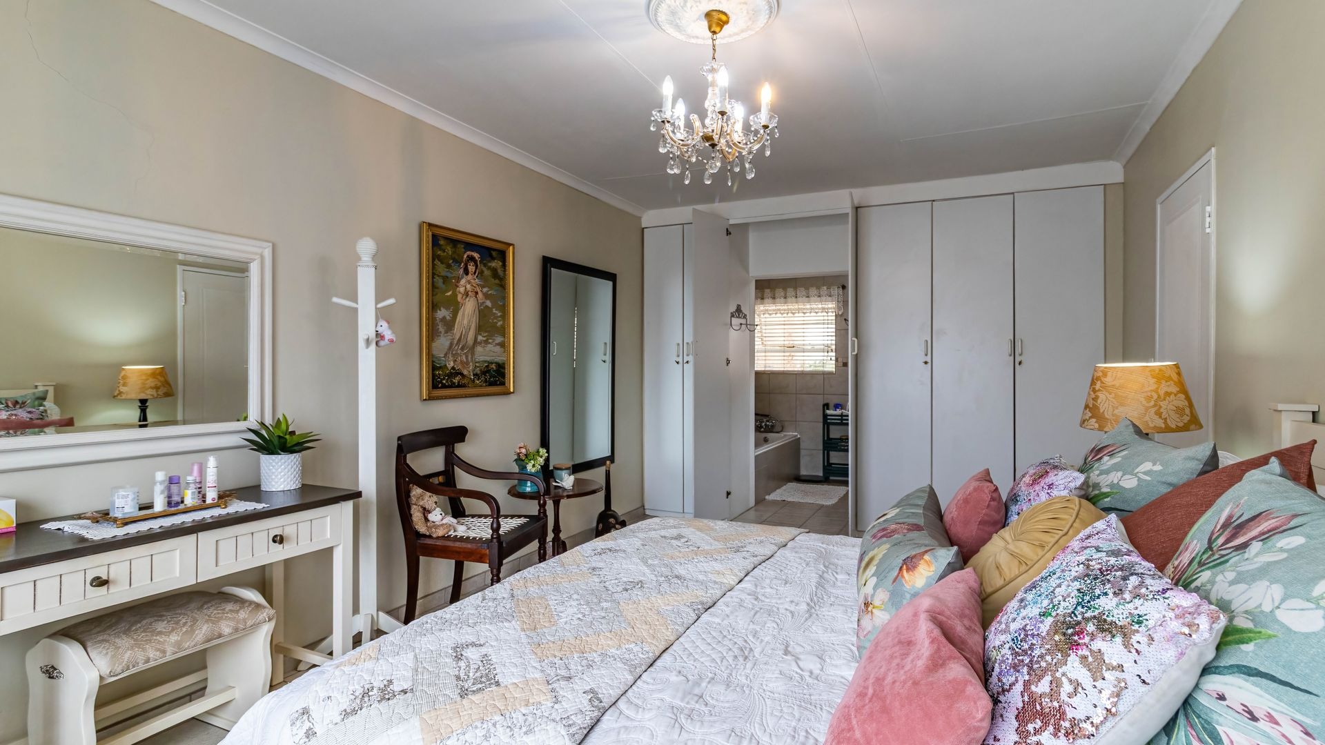 The main bedroom is spacious and filled with natural light, comfortably accommodating a king size bed. It offers ample cupboard space and a private en suite bathroom with bath, basin, and toilet.