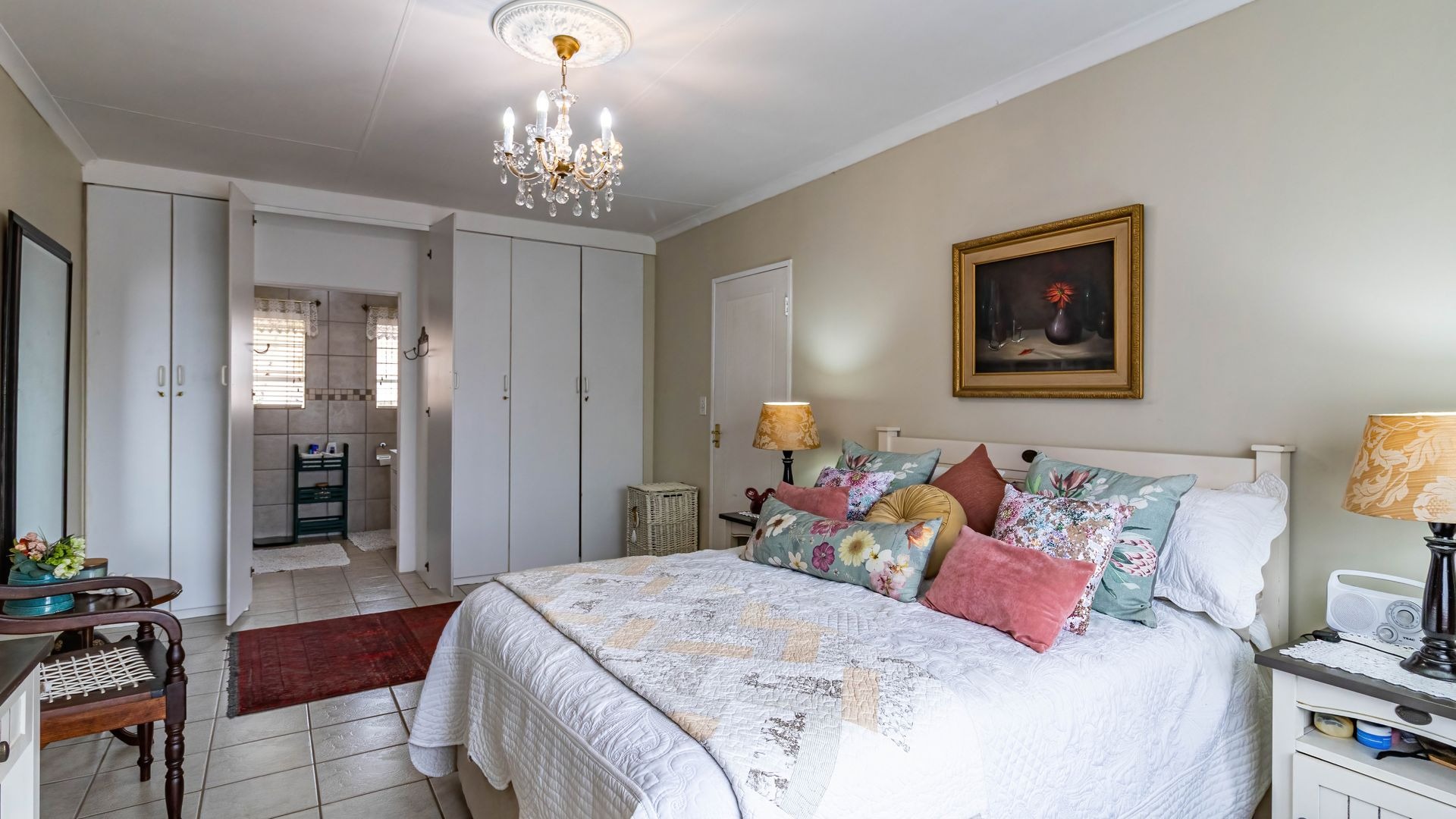 The main bedroom is spacious and filled with natural light, comfortably accommodating a king size bed. It offers ample cupboard space and a private en suite bathroom with bath, basin, and toilet.
