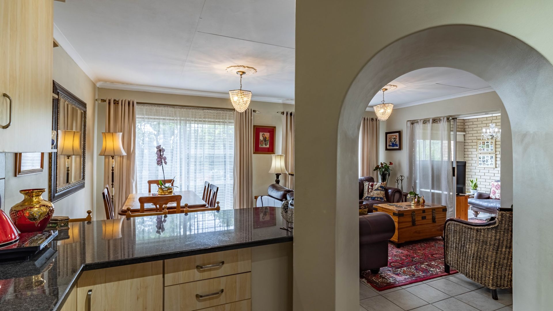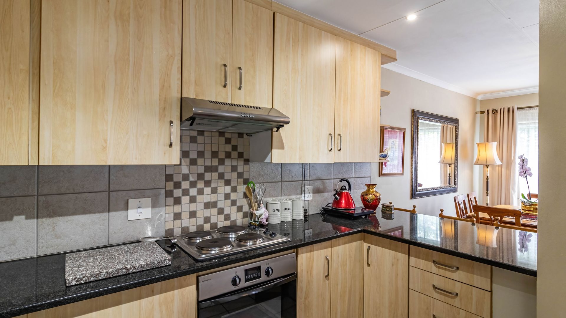 The living area flows seamlessly into a well designed kitchen fitted with granite countertops, a breakfast nook, electric four plate stove, oven, and extractor fan. A separate scullery and laundry area provides additional functionality with space for two appliances and direct access to a private courtyard, leading through to the garages.