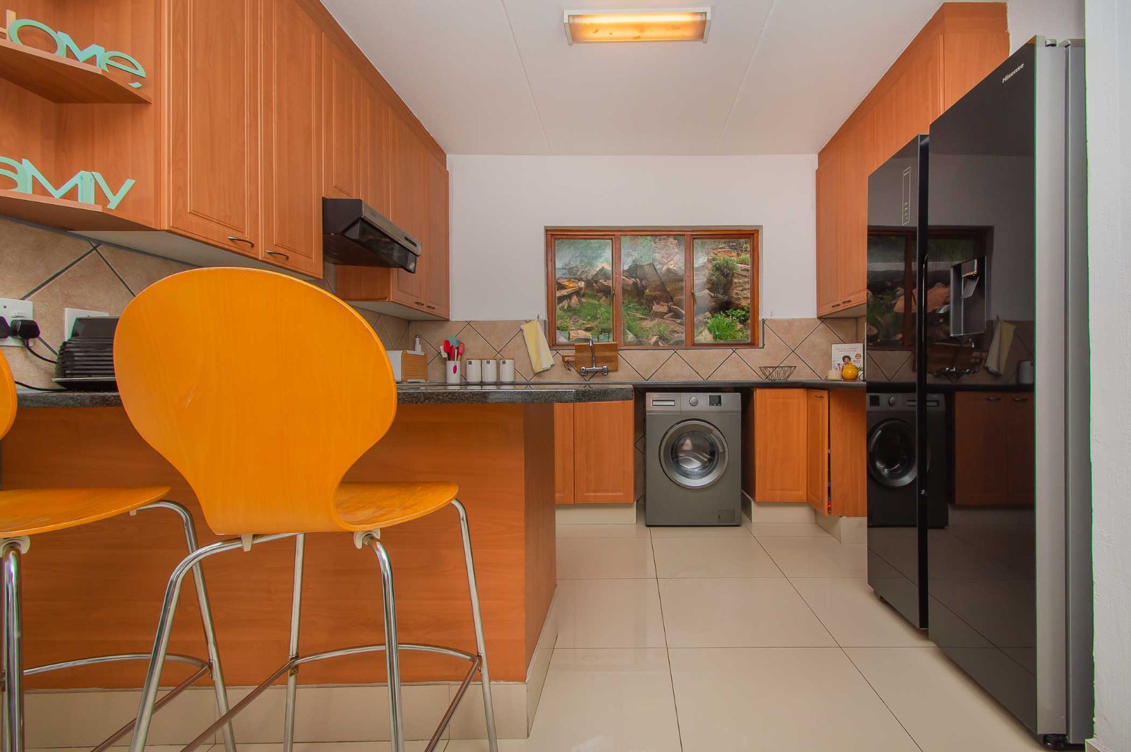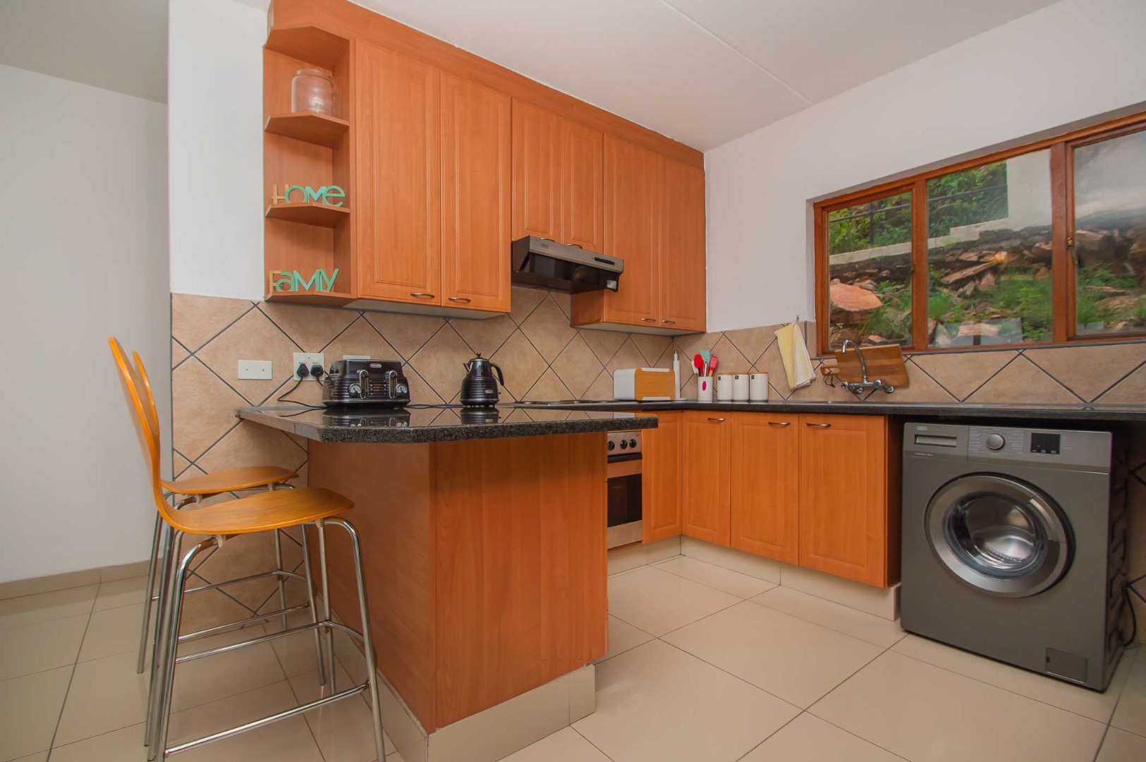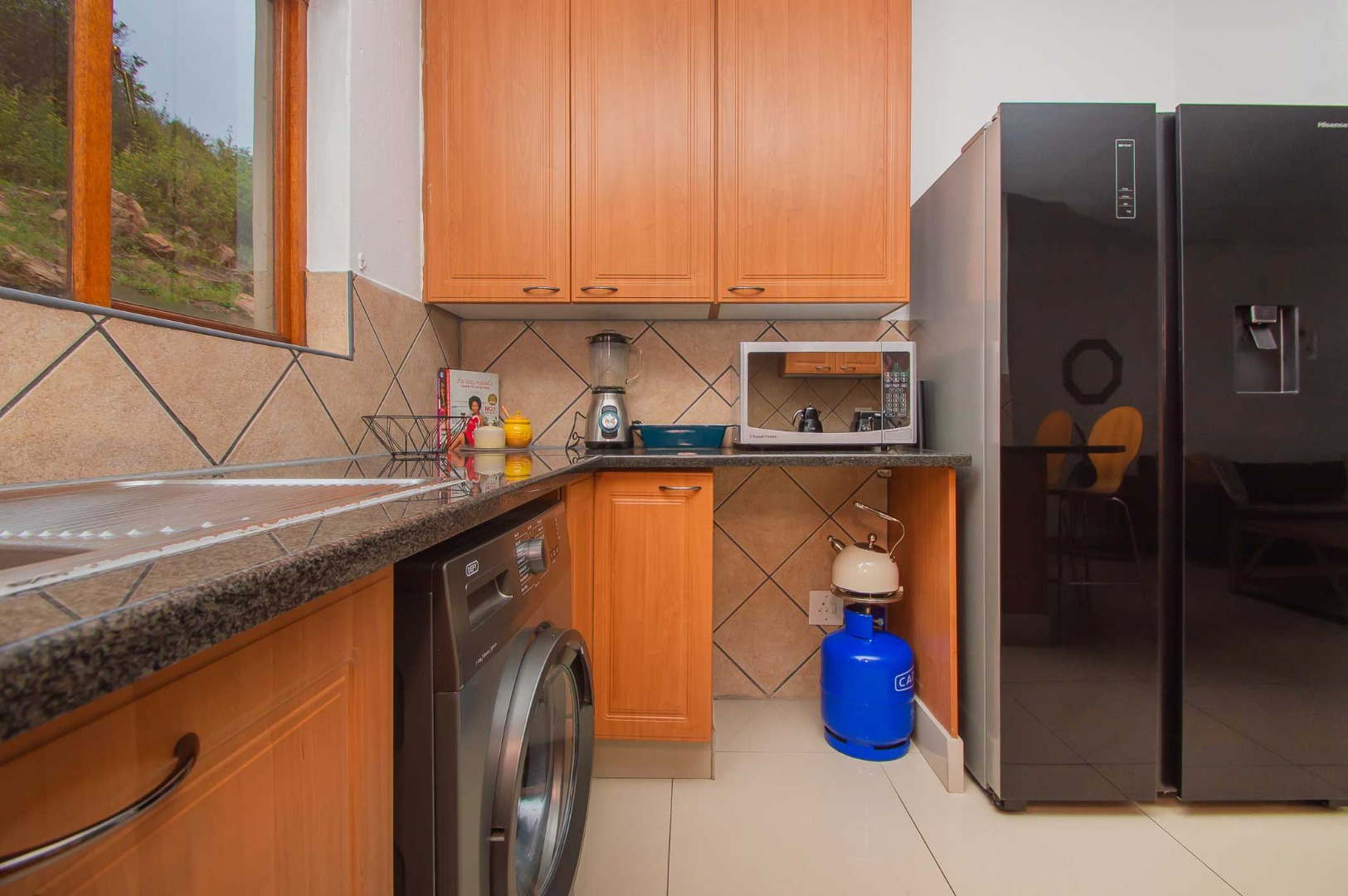 The kitchen is a chef's delight, offering ample cupboard space and finished with sleek granite countertops. There is also room for a double door fridge, ensuring you have all the space you need for culinary adventures.