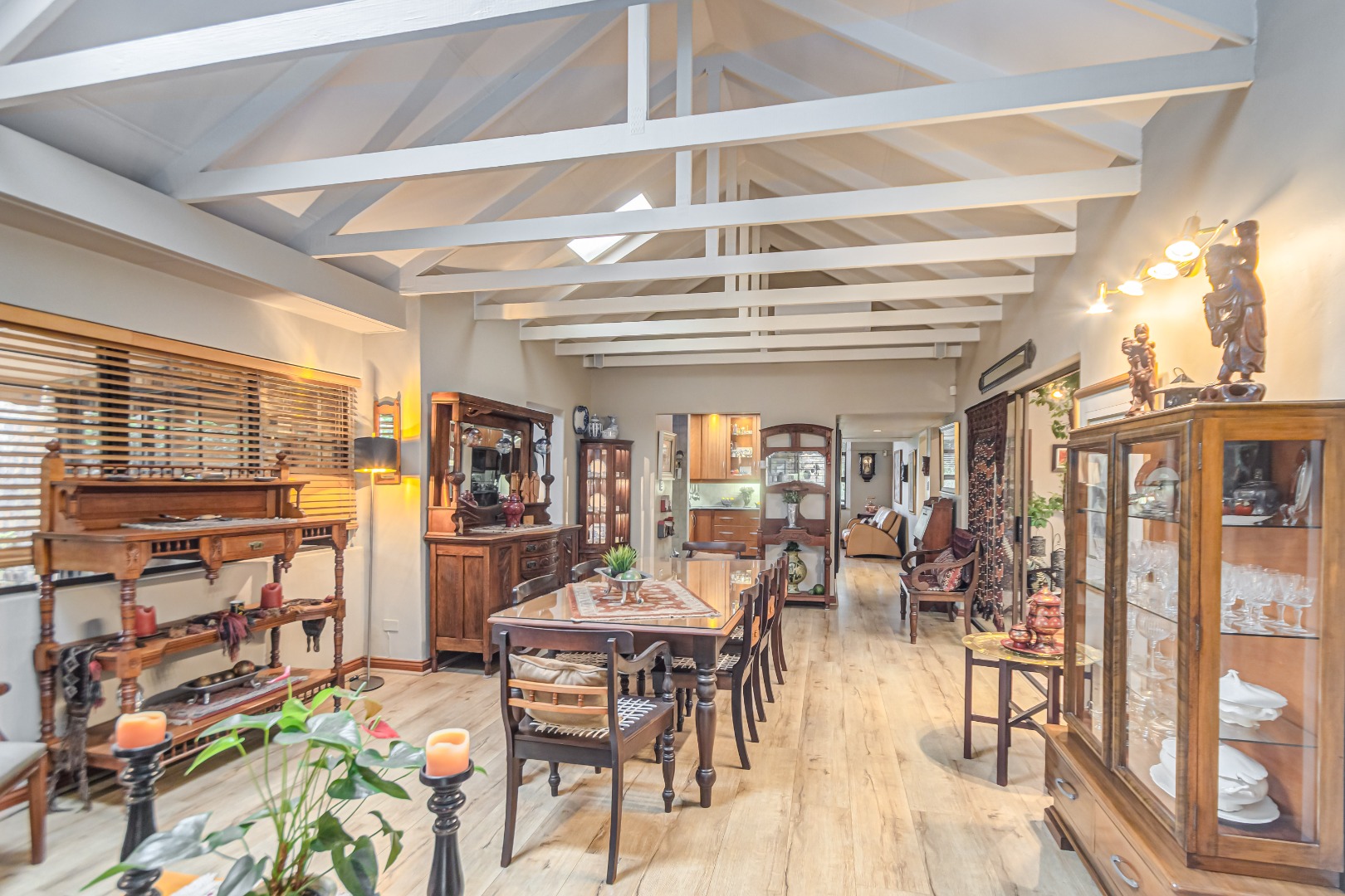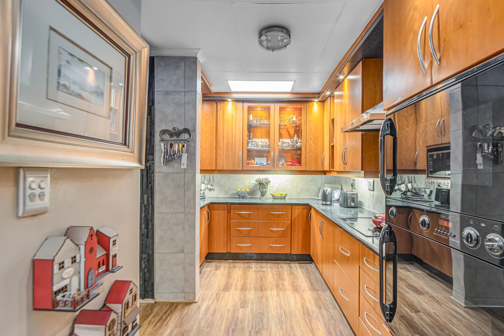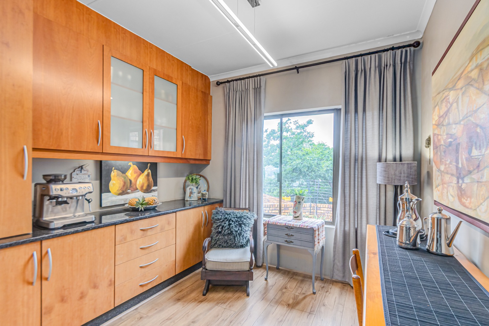 A chef’s delight, the kitchen is fitted with state-of-the-art appliances, sleek cabinetry, a separate scullery, and a dedicated laundry area. The adjoining breakfast nook is ideal for relaxed family meals.
