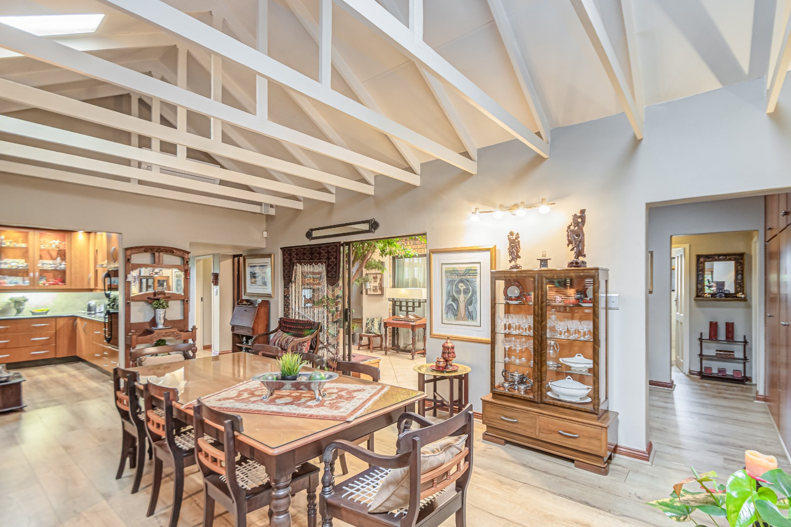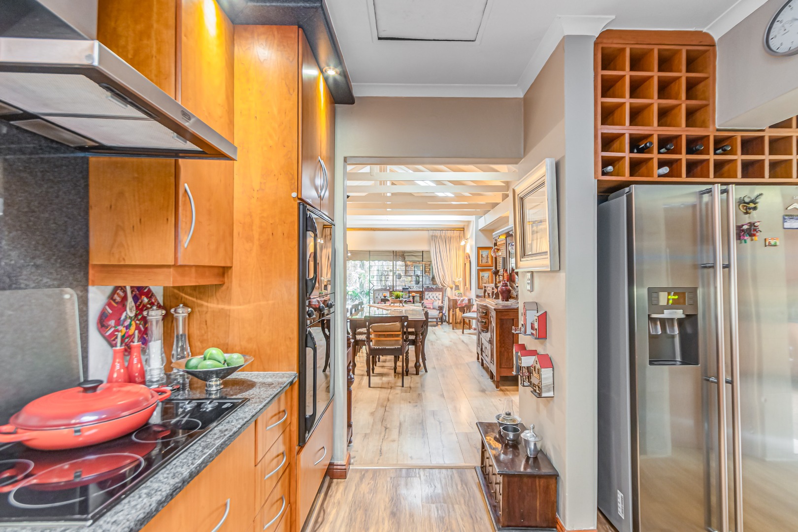 A chef’s delight, the kitchen is fitted with state-of-the-art appliances, sleek cabinetry, a separate scullery, and a dedicated laundry area. The adjoining breakfast nook is ideal for relaxed family meals.