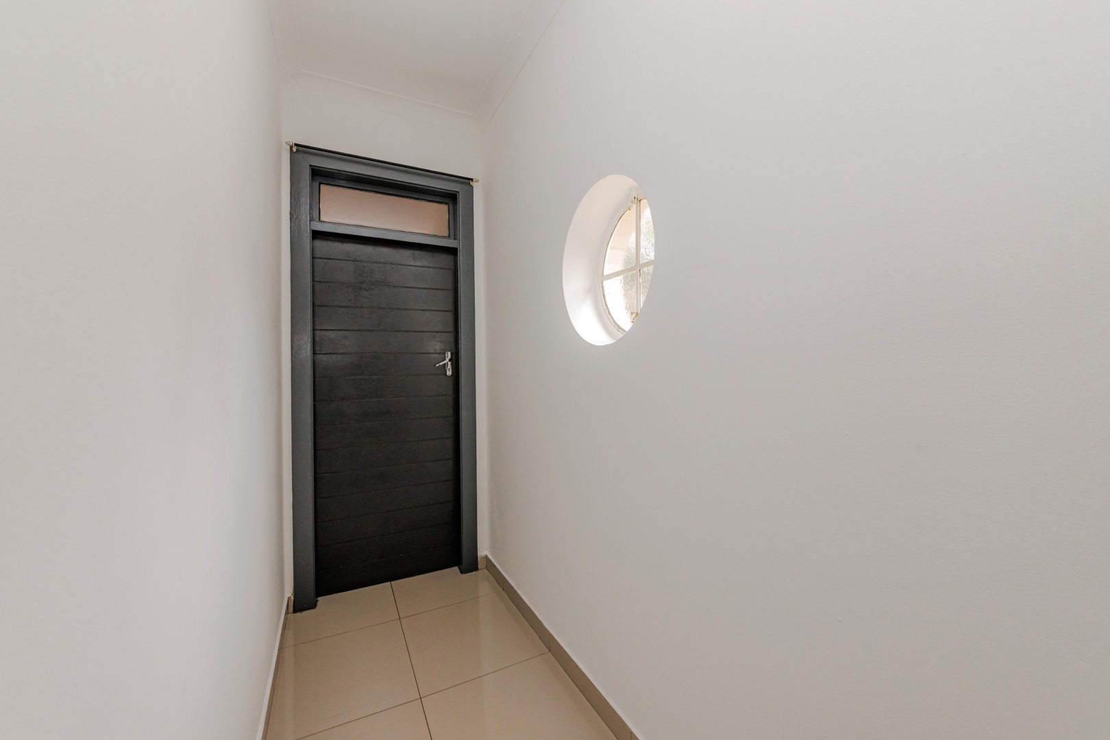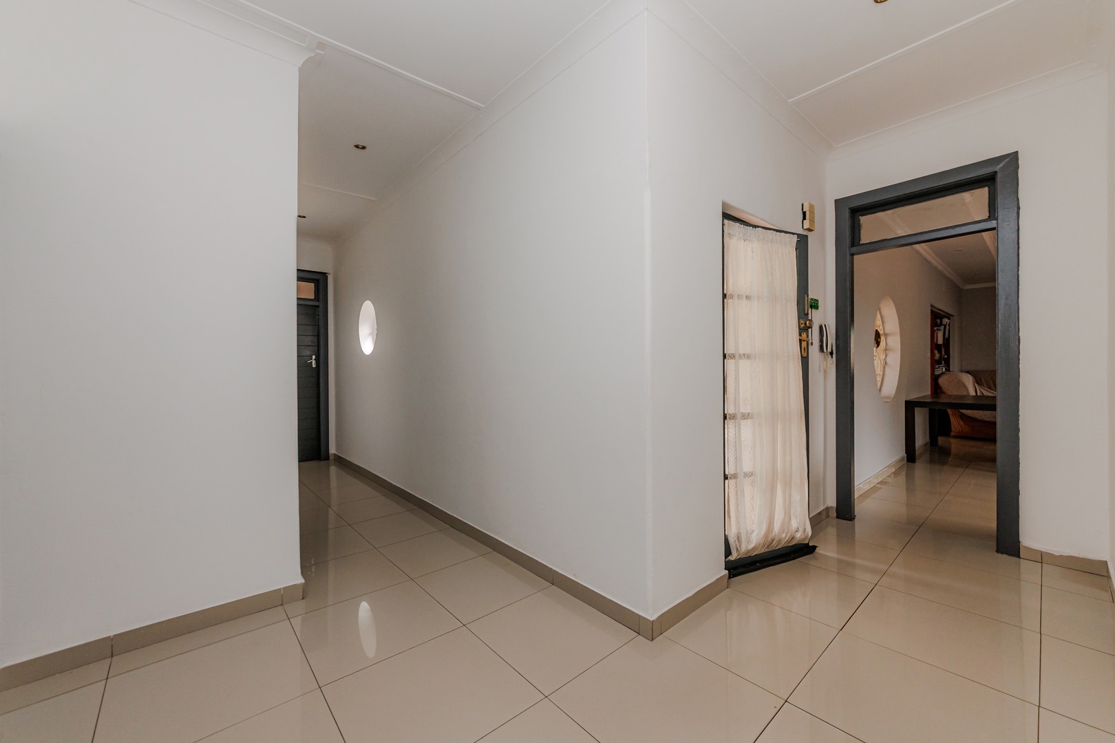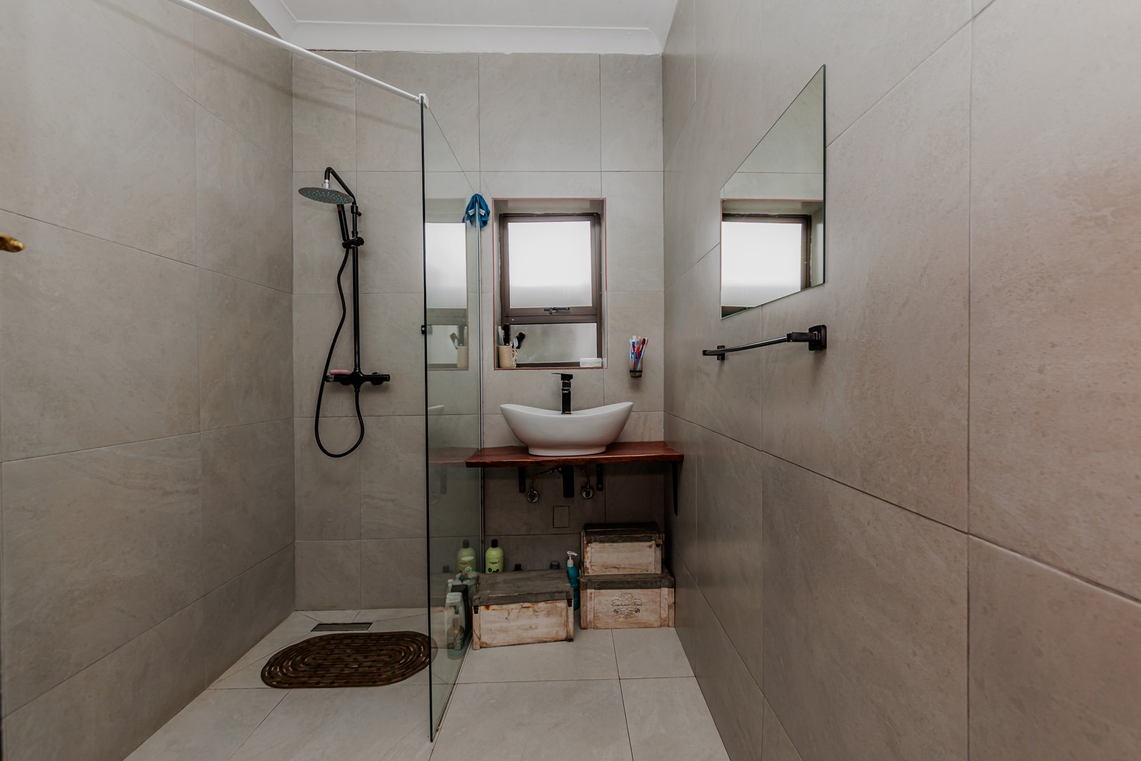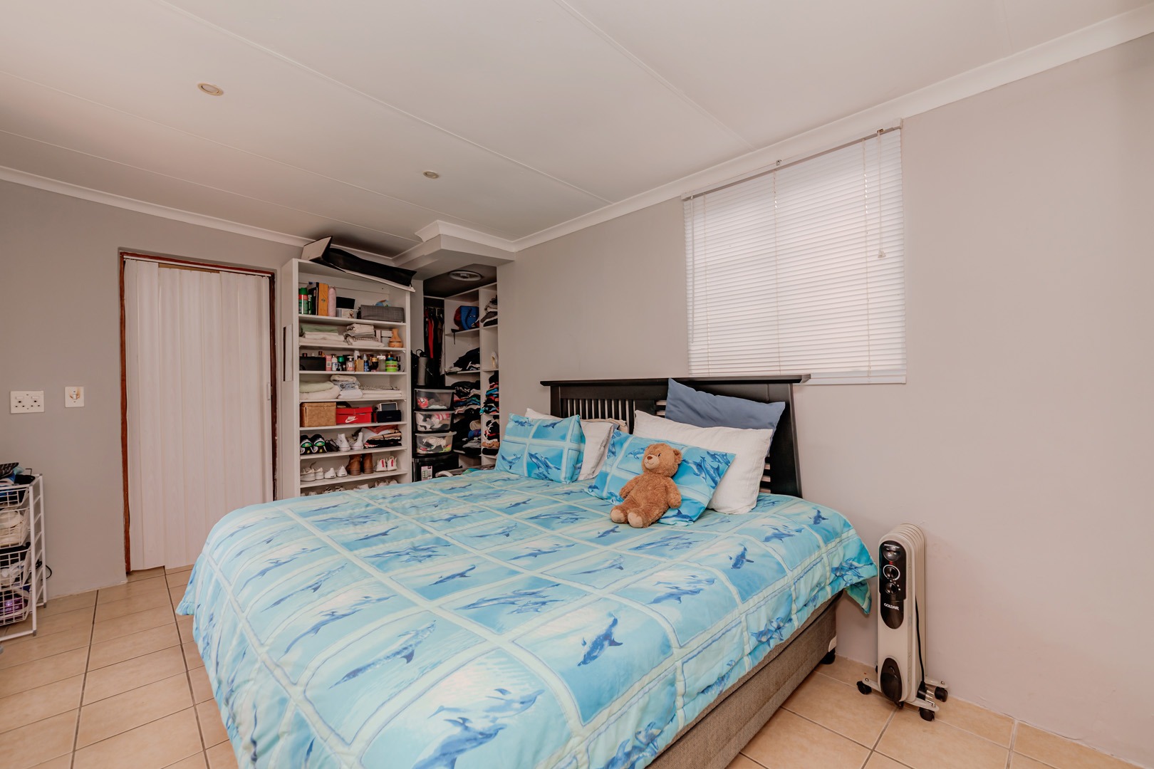 Down the passage are three well-sized bedrooms, all with porcelain tiled floors. Two bedrooms are fitted with built-in cupboards. A modern bathroom with a shower and basin complements the home, along with a separate toilet for added convenience.