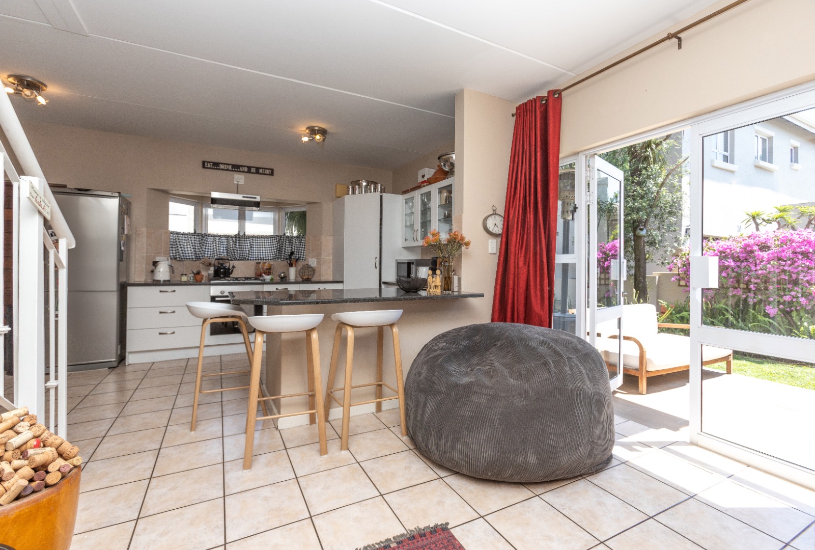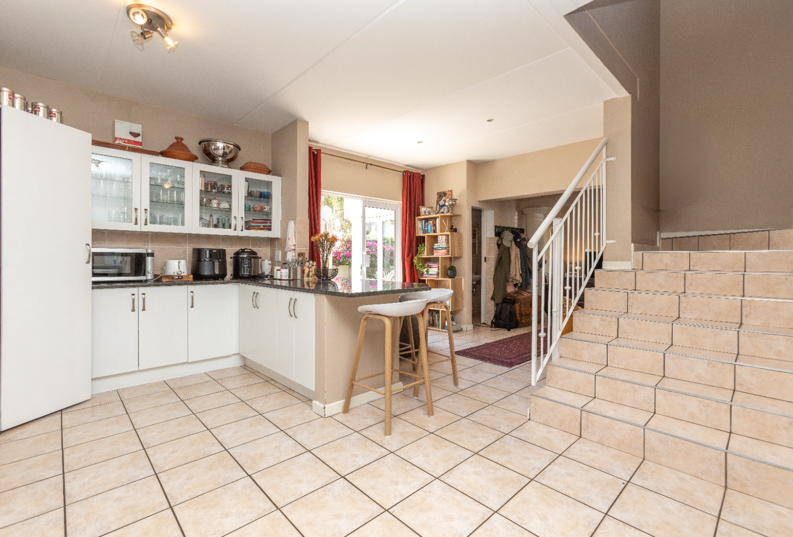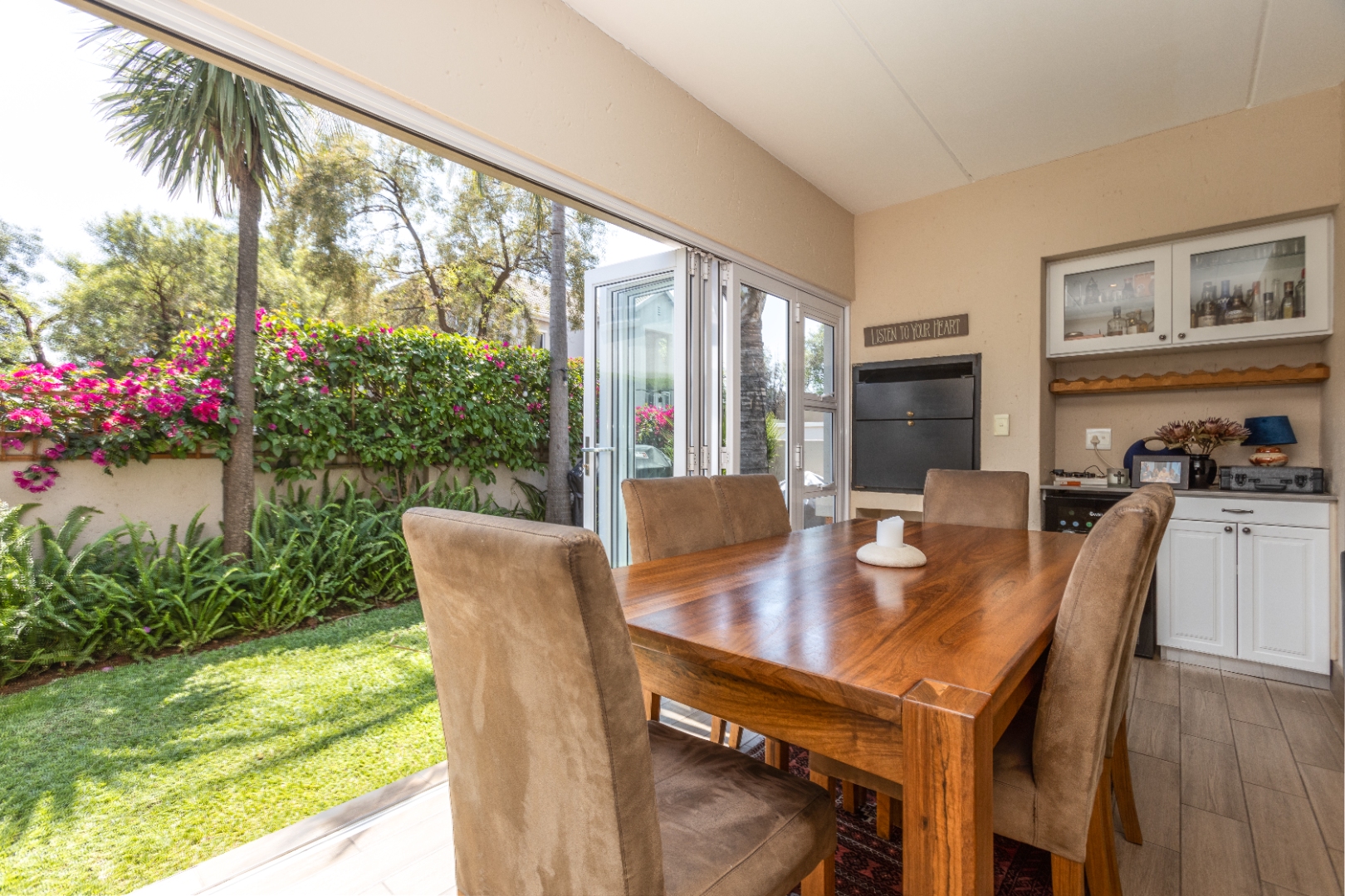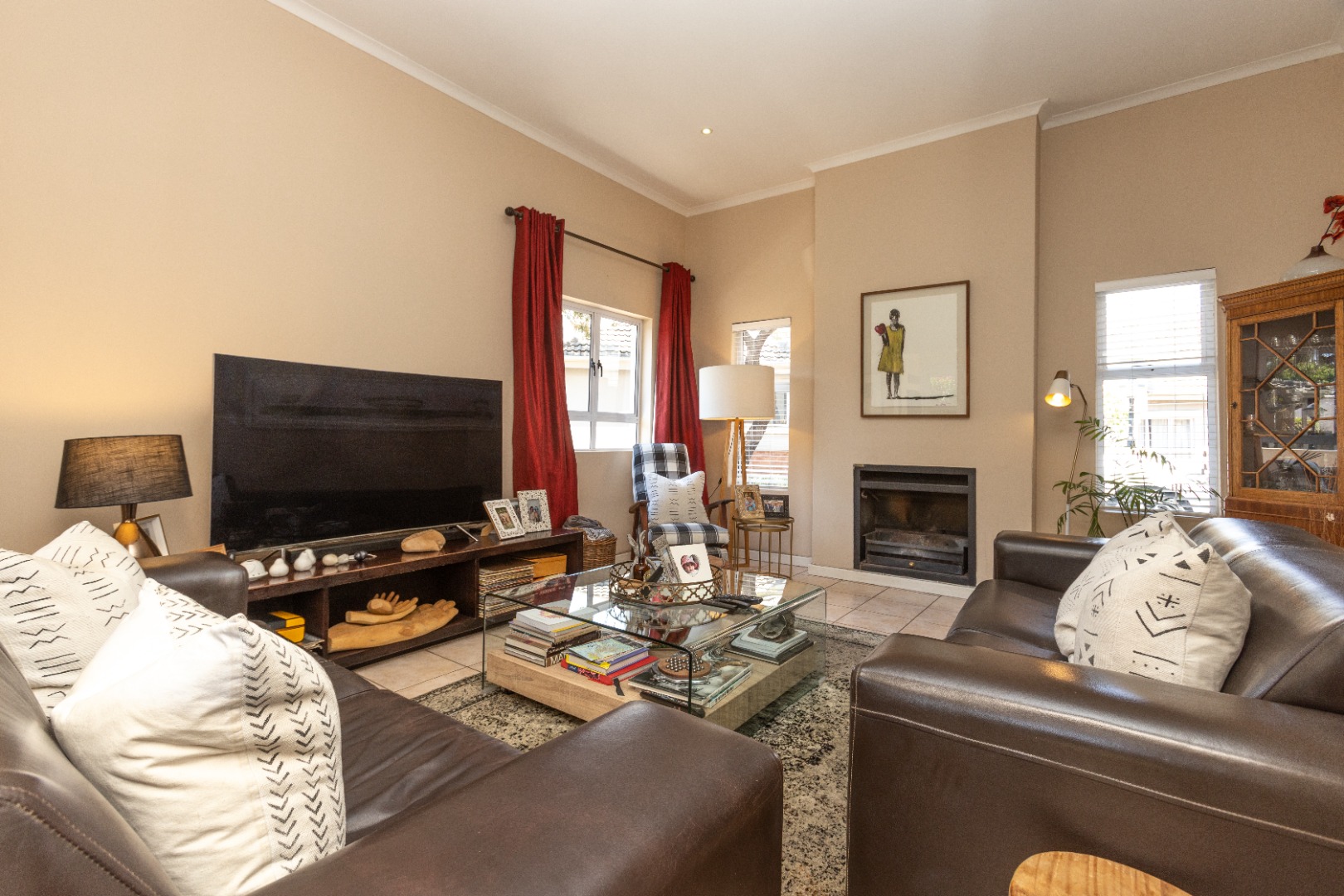 The cozy lounge, complete with a charming fireplace, seamlessly extends to the patio. Here, you'll find a built-in braai and elegant stack doors that open to your private garden. An additional open patio offers the perfect setting for alfresco dining, making entertaining a delight. The home is thoughtfully designed with the convenience of a guest loo.