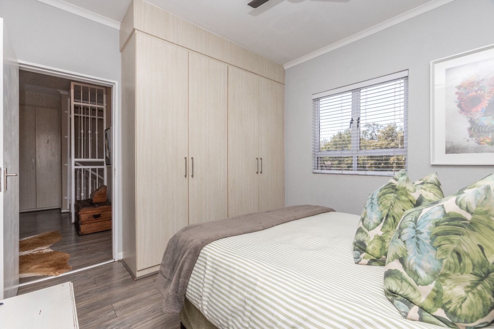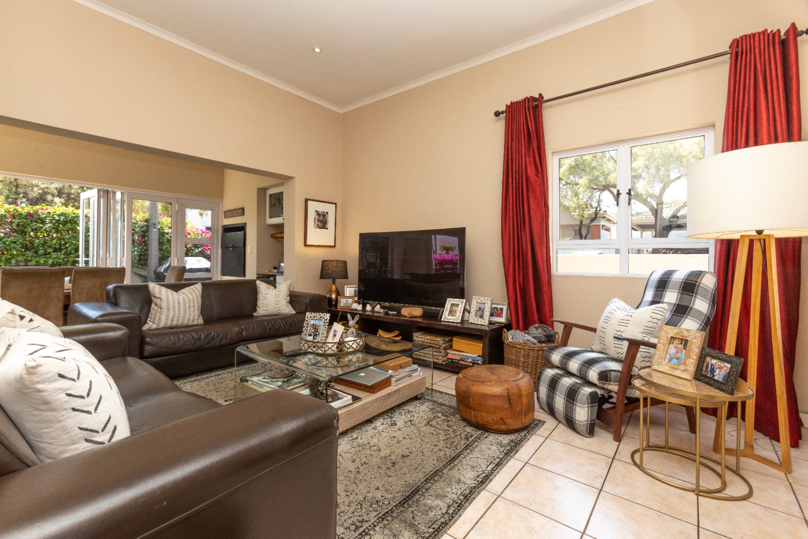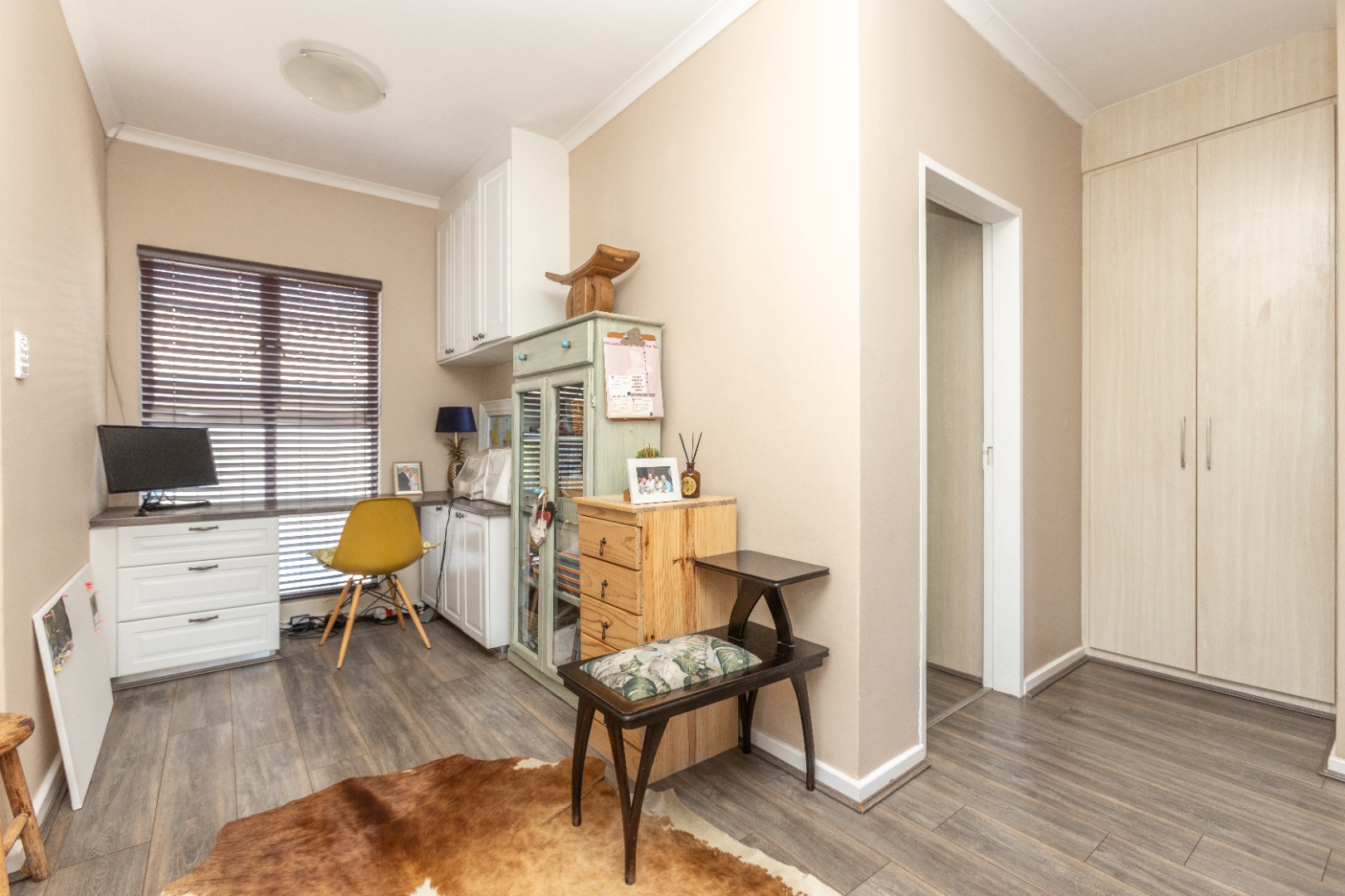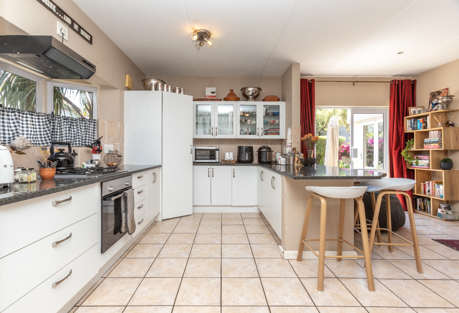 The cozy lounge, complete with a charming fireplace, seamlessly extends to the patio. Here, you'll find a built-in braai and elegant stack doors that open to your private garden. An additional open patio offers the perfect setting for alfresco dining, making entertaining a delight. The home is thoughtfully designed with the convenience of a guest loo.