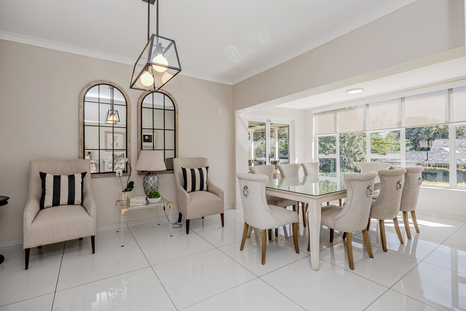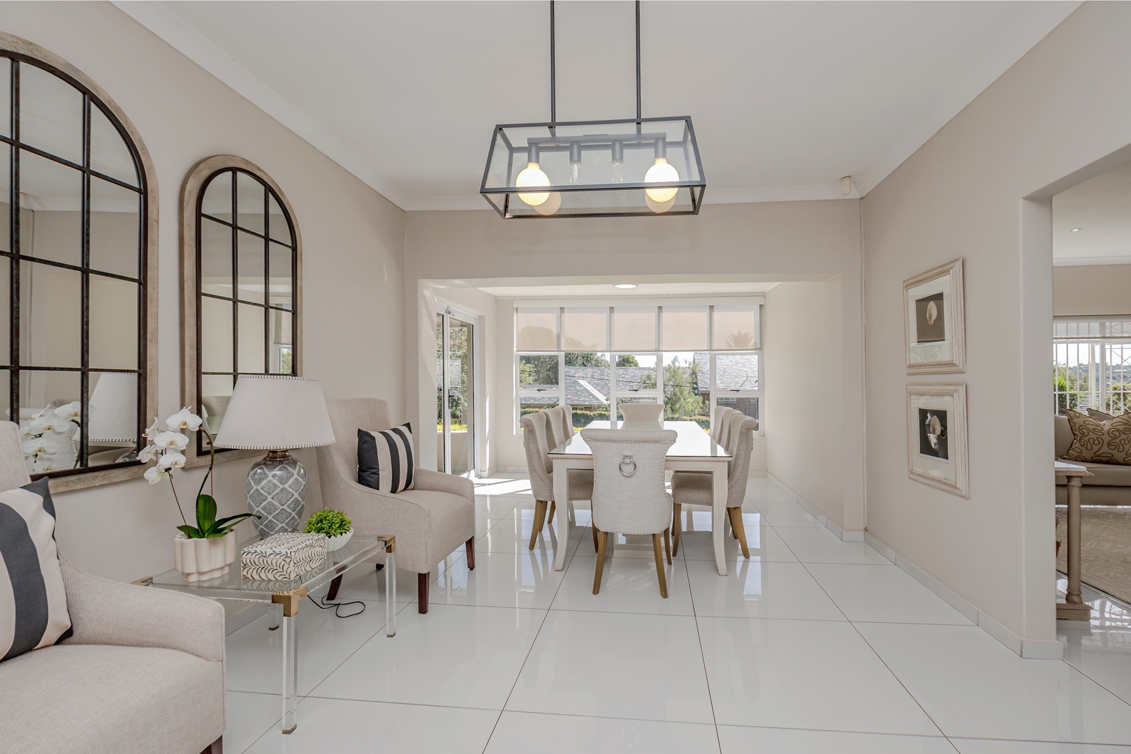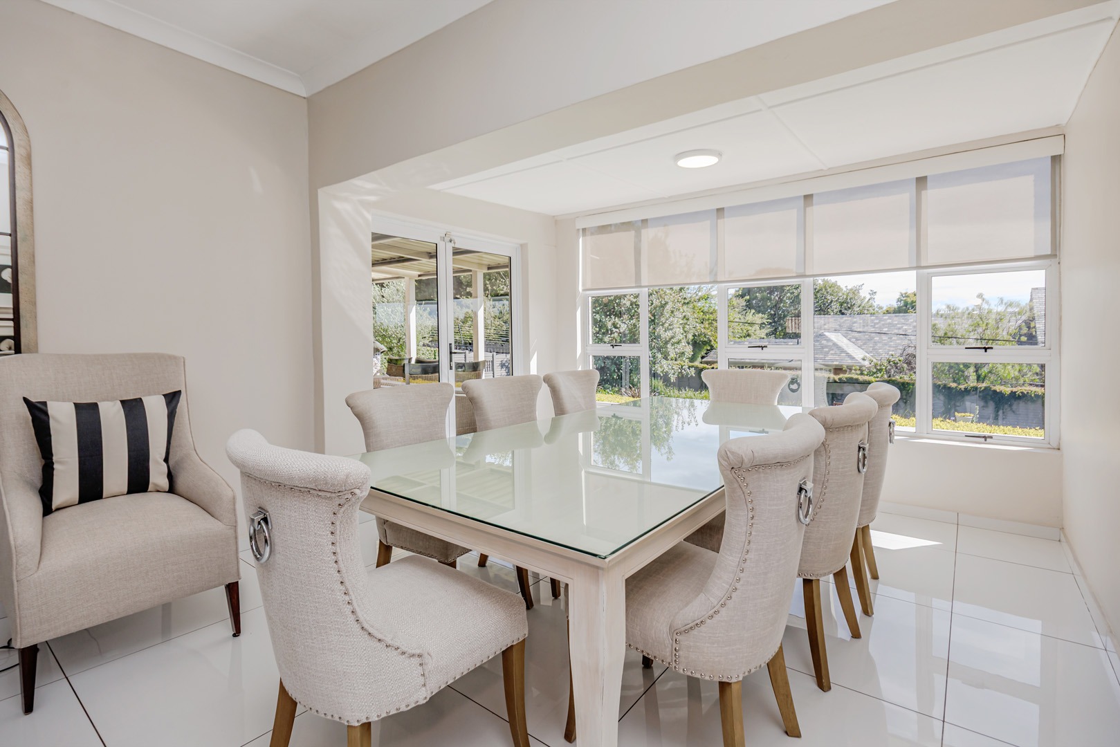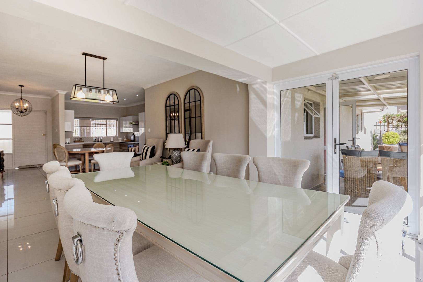 The kitchen is both elegant and practical, complete with a separate scullery and pantry, ensuring functionality while maintaining a sleek and uncluttered aesthetic. The dining area opens onto a large patio that overlooks a beautifully maintained garden — perfect for entertaining guests, hosting meetings, or simply enjoying peaceful outdoor moments.
