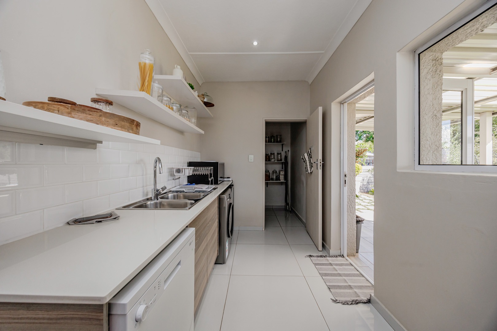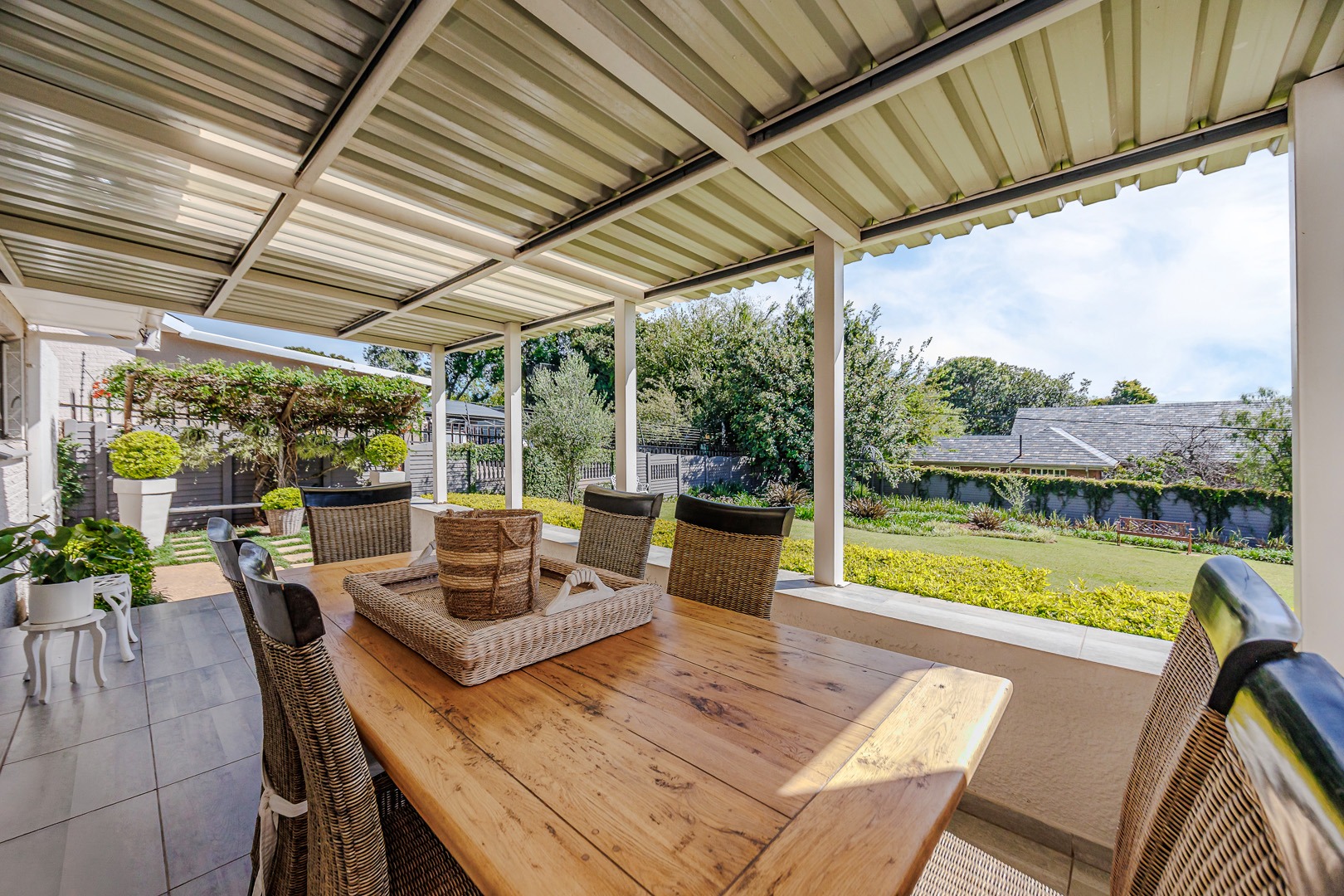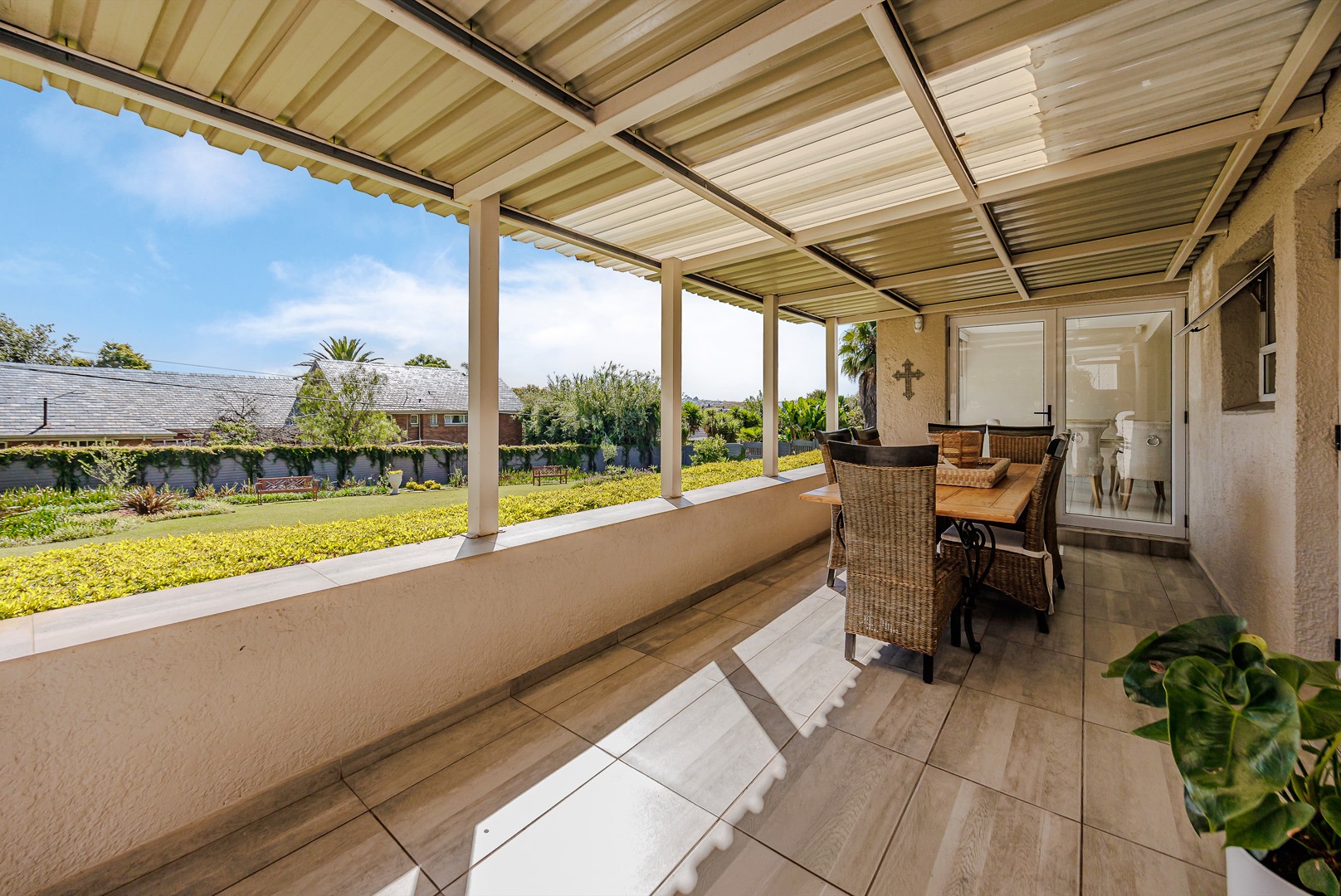 The kitchen is both elegant and practical, complete with a separate scullery and pantry, ensuring functionality while maintaining a sleek and uncluttered aesthetic. The dining area opens onto a large patio that overlooks a beautifully maintained garden — perfect for entertaining guests, hosting meetings, or simply enjoying peaceful outdoor moments.