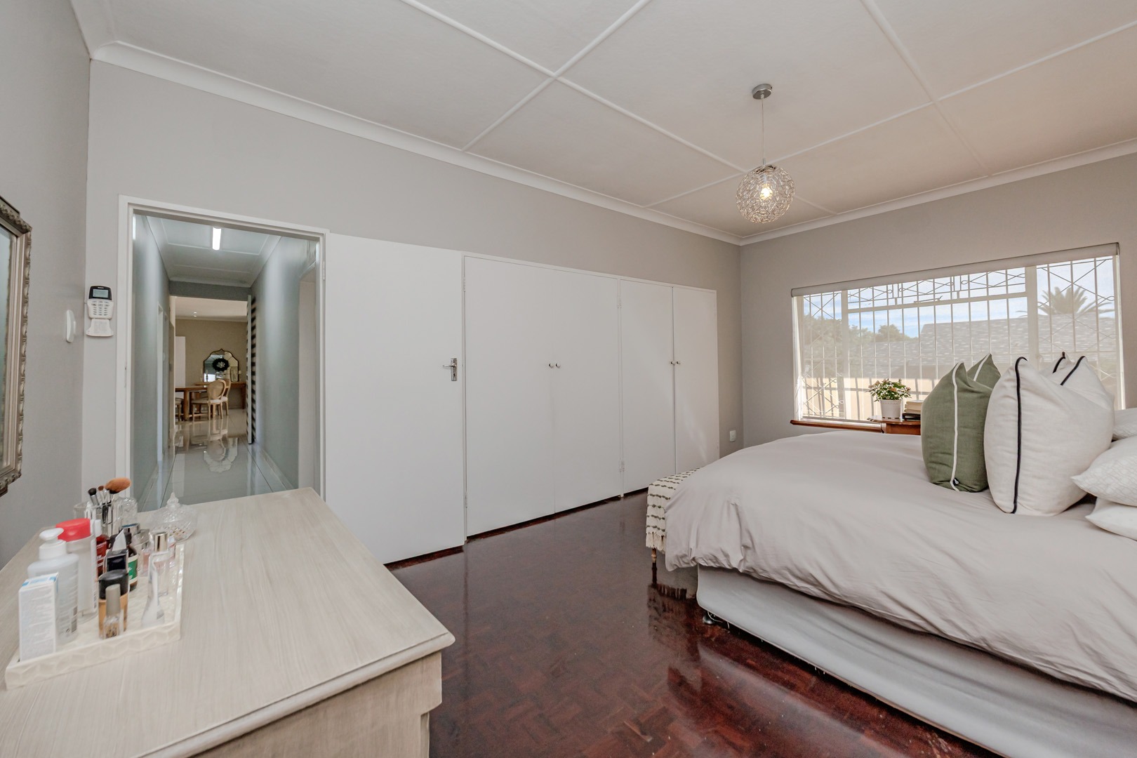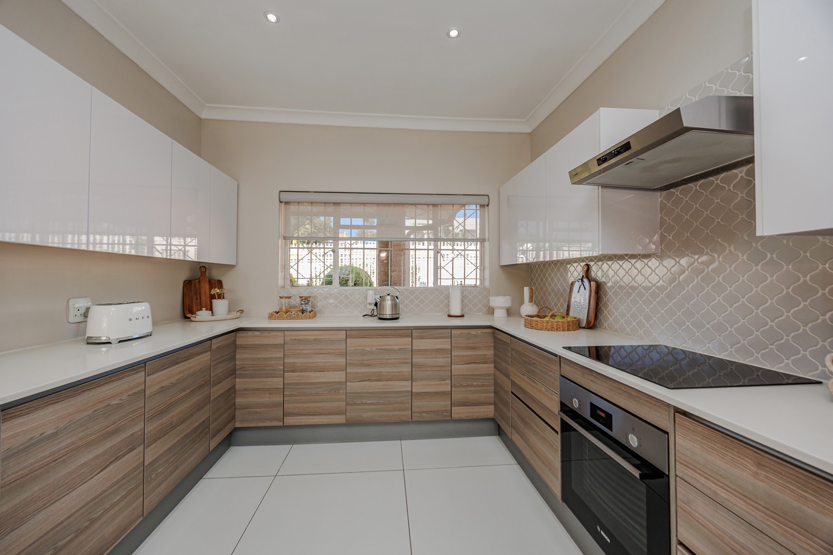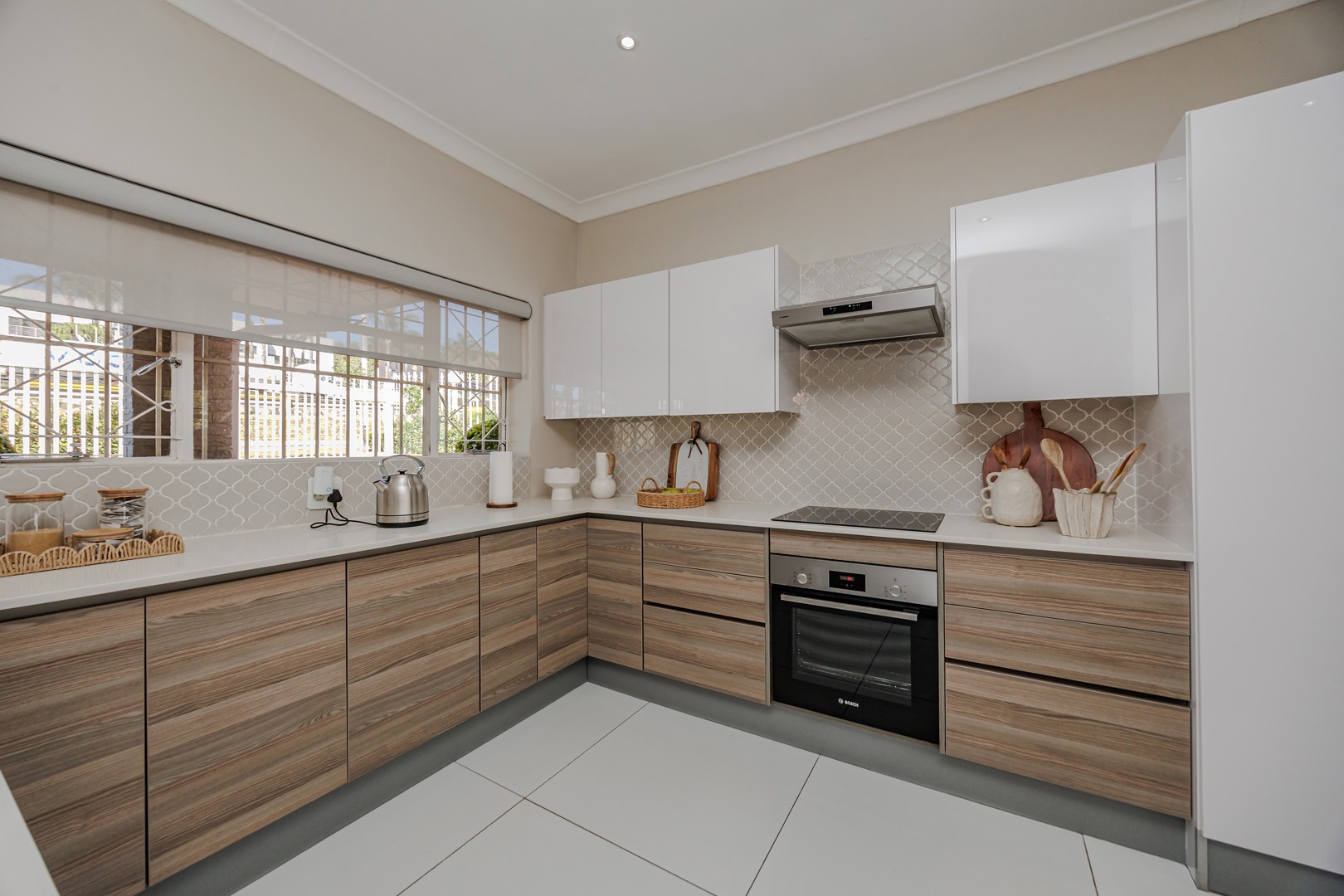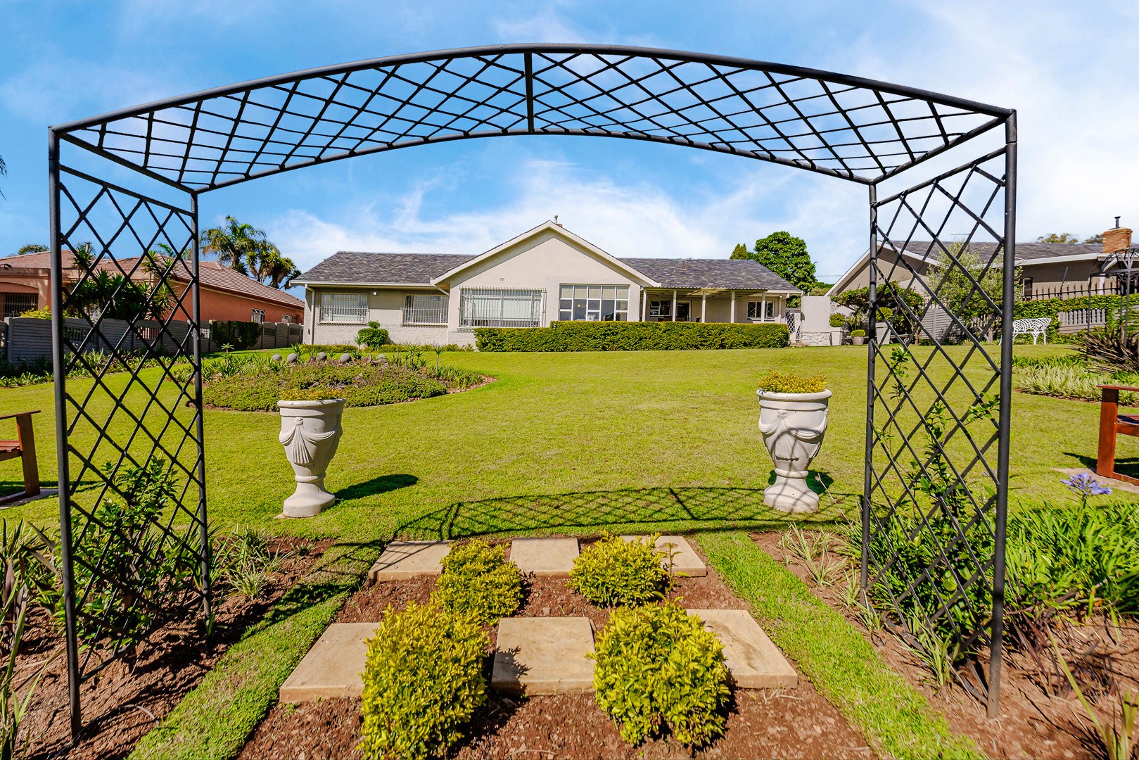 The kitchen is both elegant and practical, complete with a separate scullery and pantry, ensuring functionality while maintaining a sleek and uncluttered aesthetic. The dining area opens onto a large patio that overlooks a beautifully maintained garden — perfect for entertaining guests, hosting meetings, or simply enjoying peaceful outdoor moments.