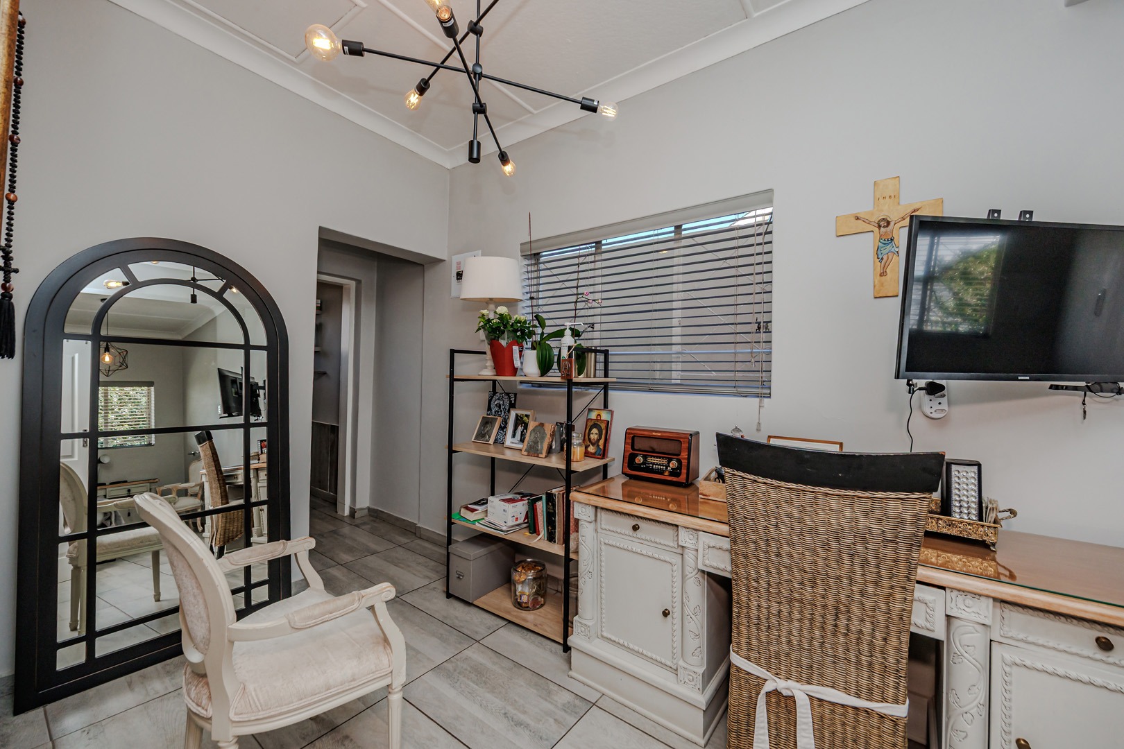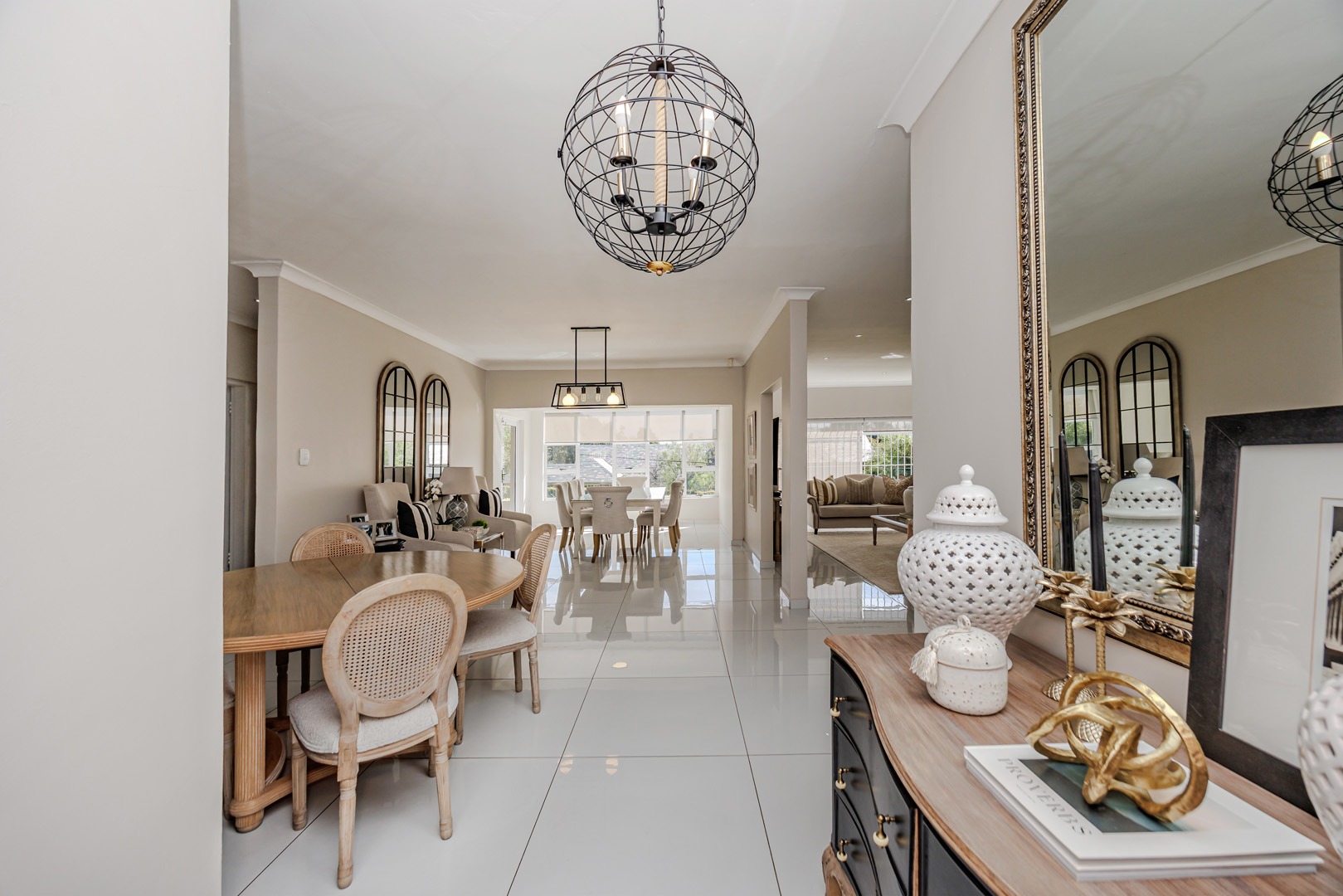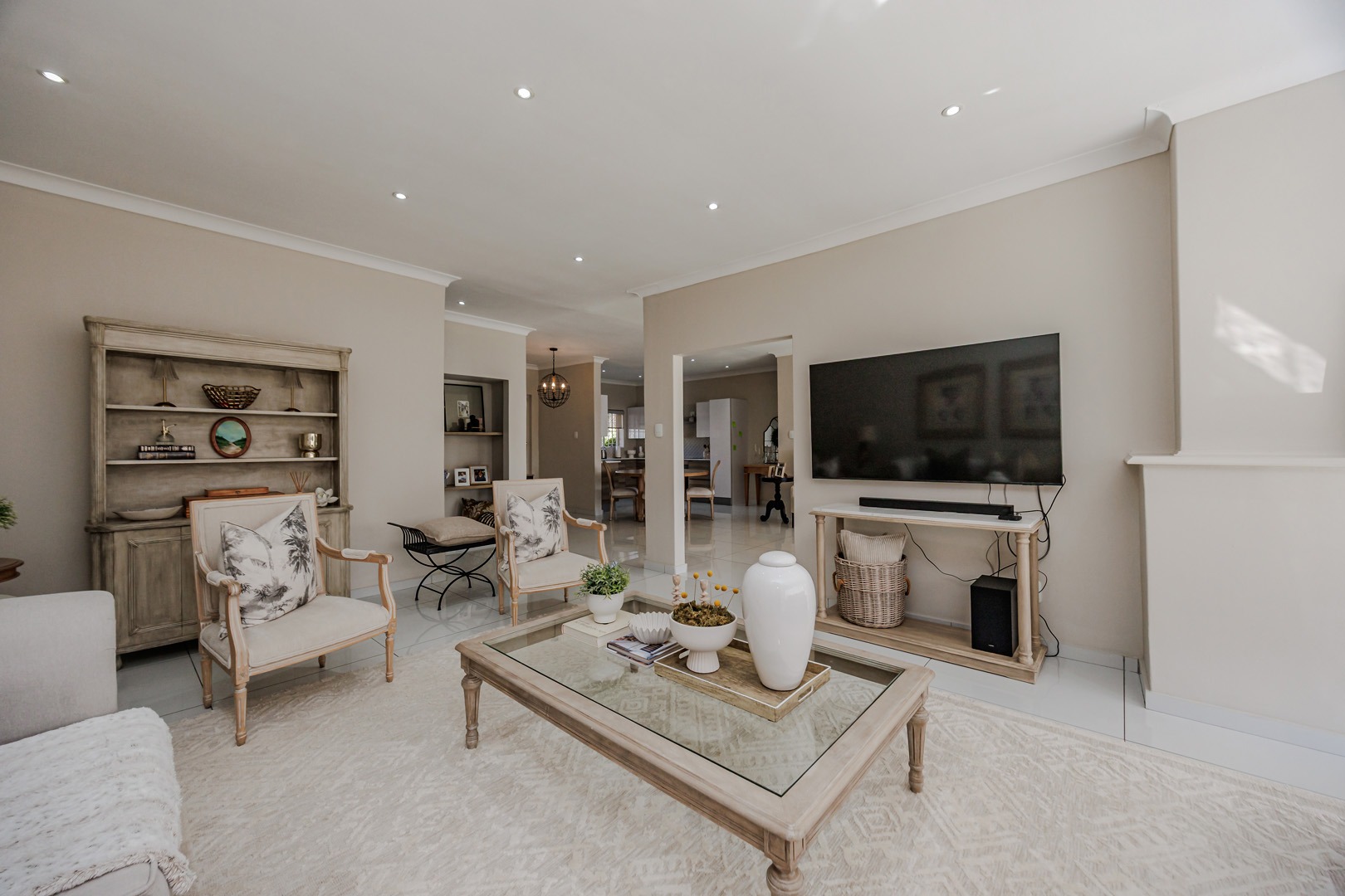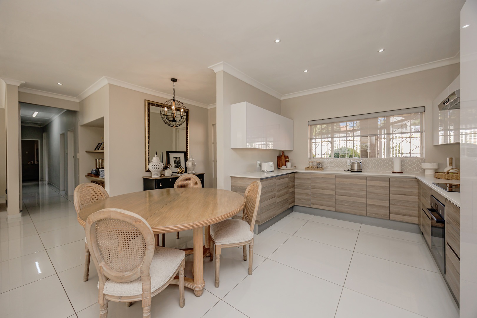 The home features a stunning open-plan living area that seamlessly combines the lounge, dining room, and modern kitchen. Clean lines, generous space, and natural light create an inviting atmosphere that works equally well for family living or a professional business environment.