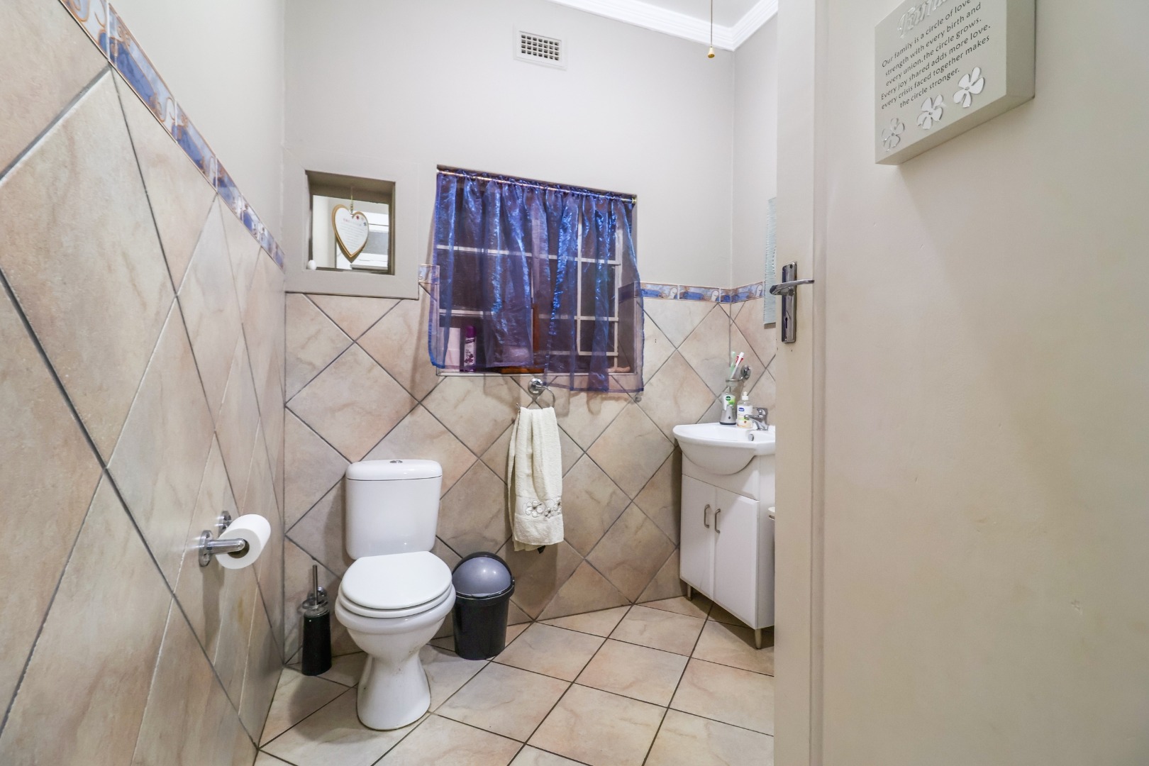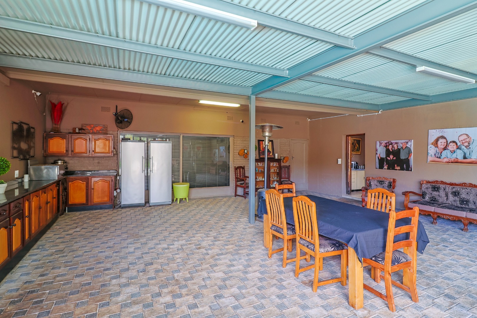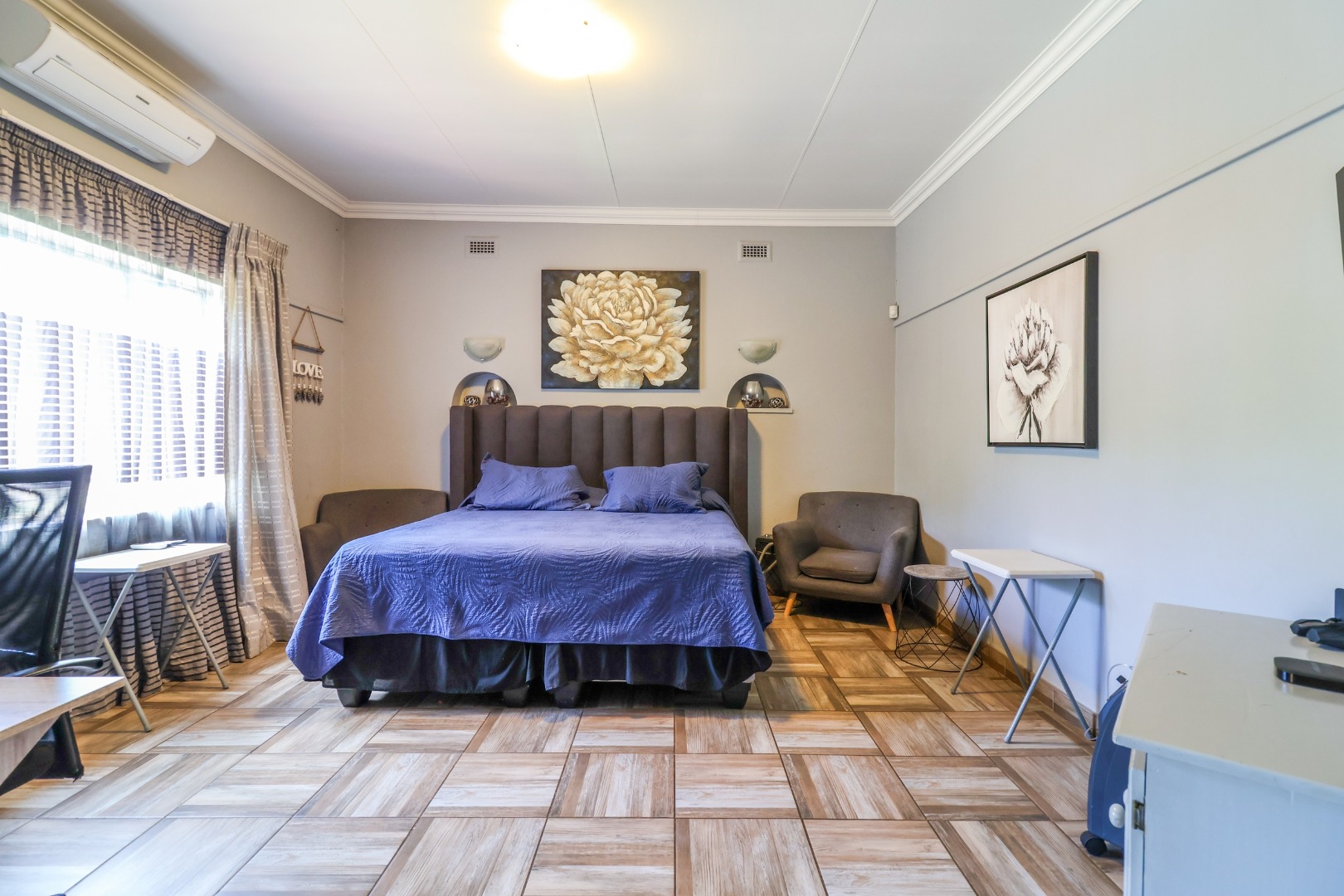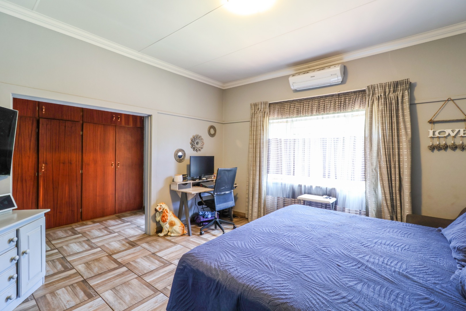 These include an electric fence, automated main gates, a comprehensive alarm system with perimeter beams, and a CCTV system. The main bedroom is equipped with an air conditioning unit for year-round comfort. An outside toilet adds