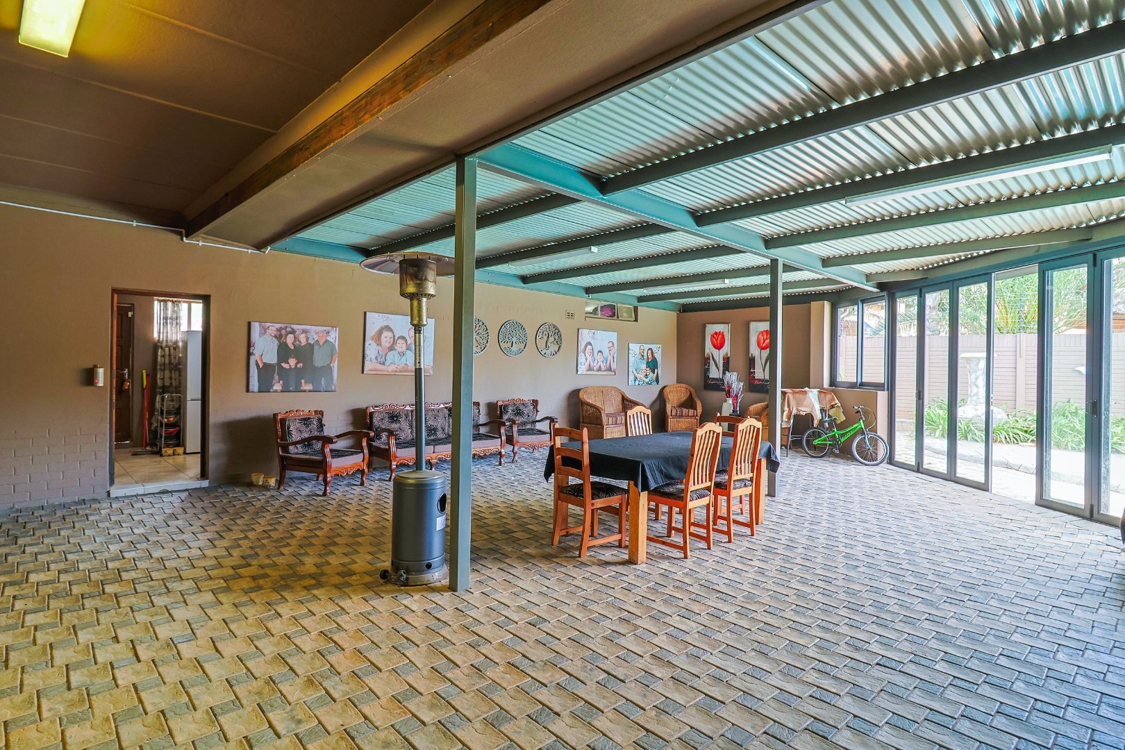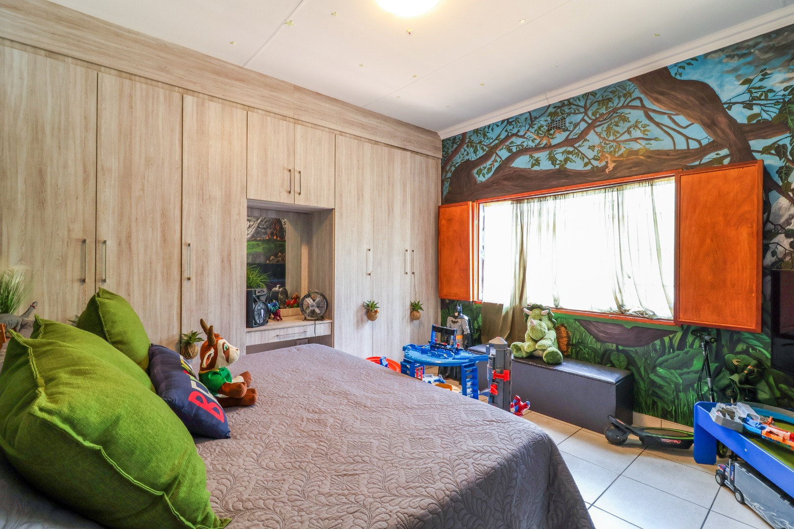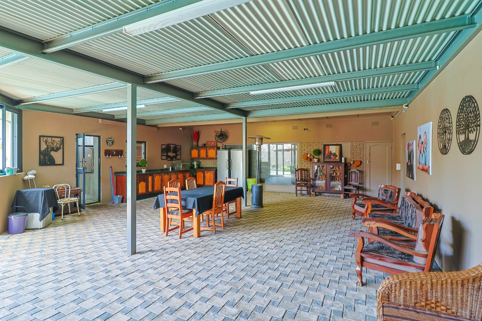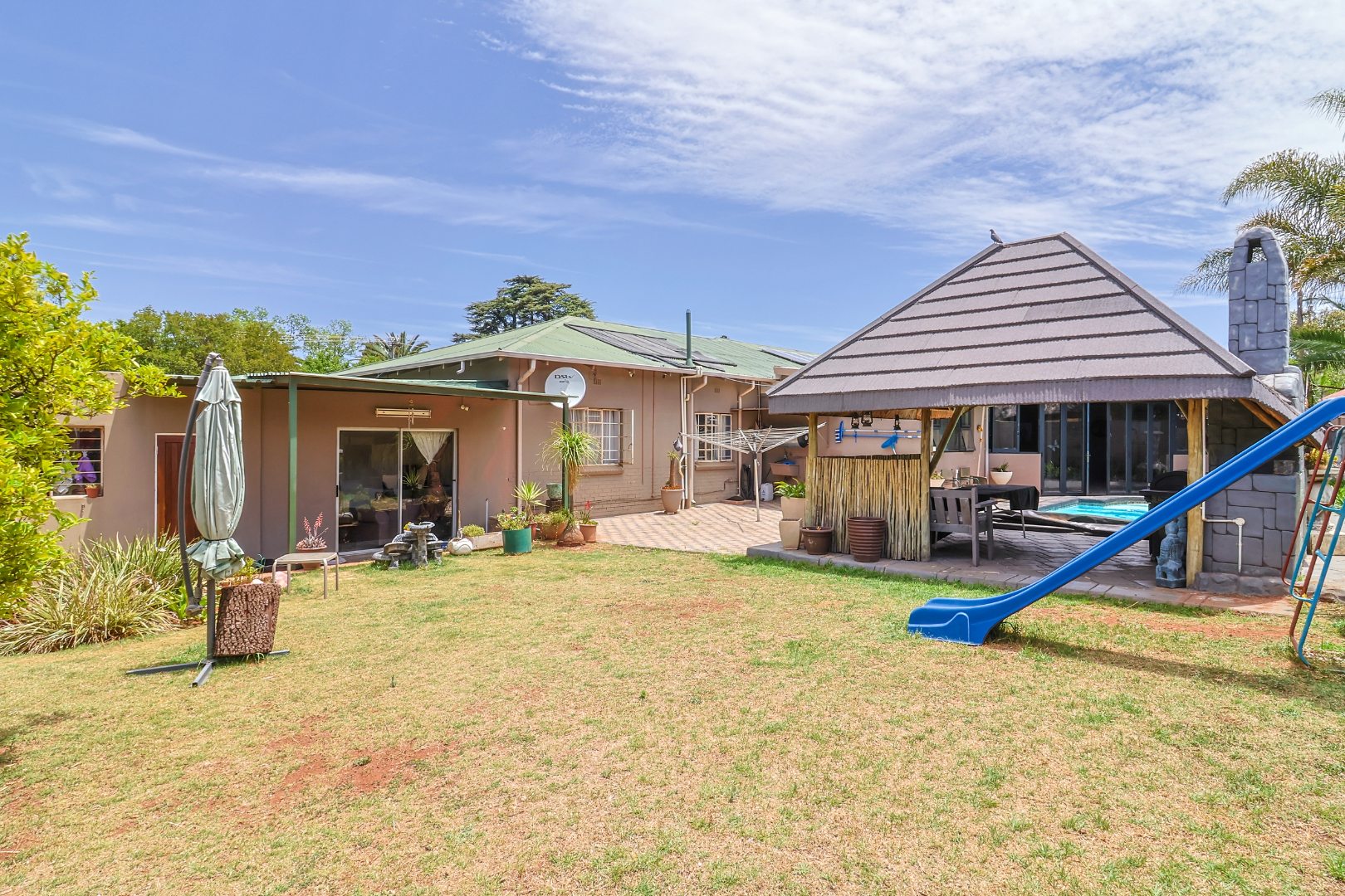 These include an electric fence, automated main gates, a comprehensive alarm system with perimeter beams, and a CCTV system. The main bedroom is equipped with an air conditioning unit for year-round comfort. An outside toilet adds