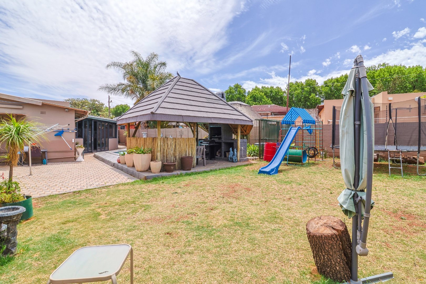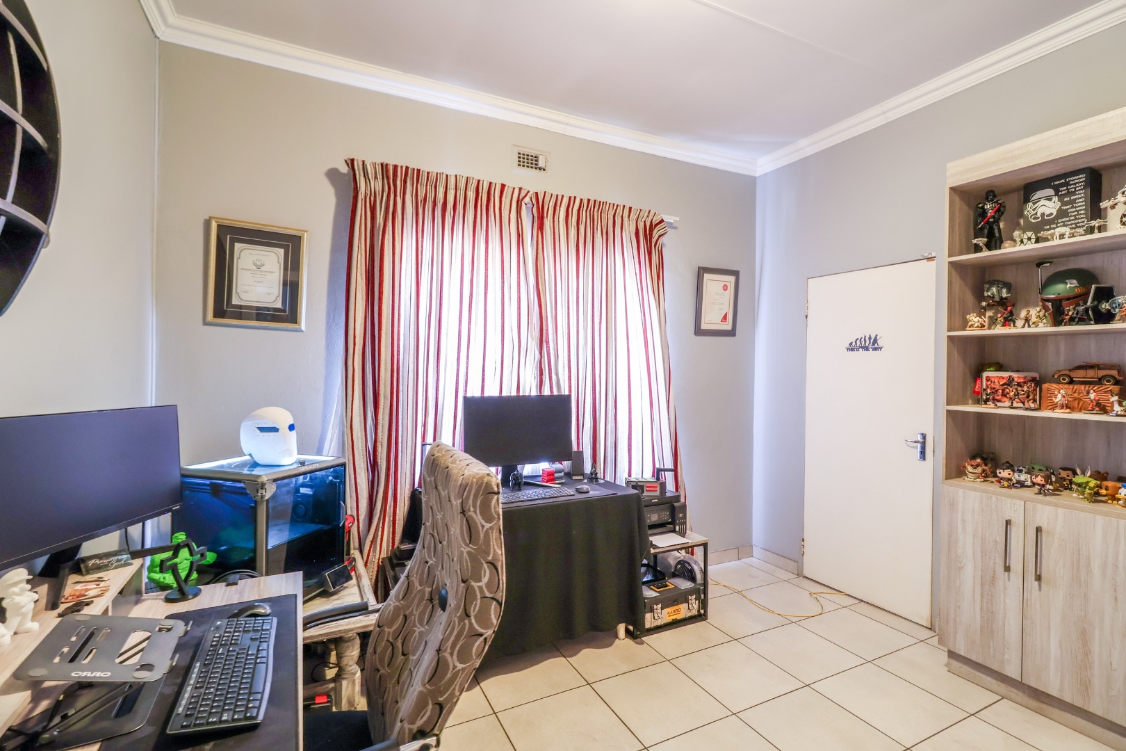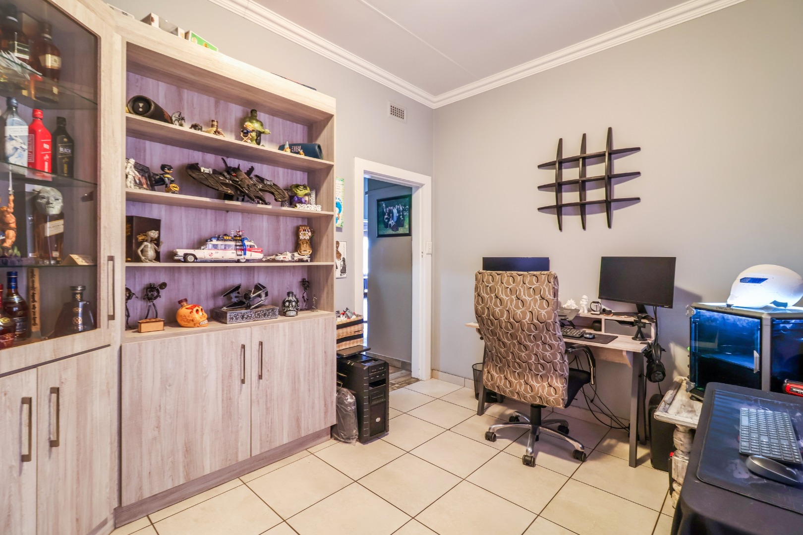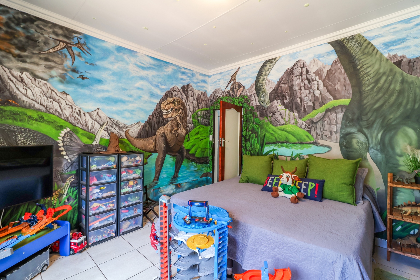 These include an electric fence, automated main gates, a comprehensive alarm system with perimeter beams, and a CCTV system. The main bedroom is equipped with an air conditioning unit for year-round comfort. An outside toilet adds