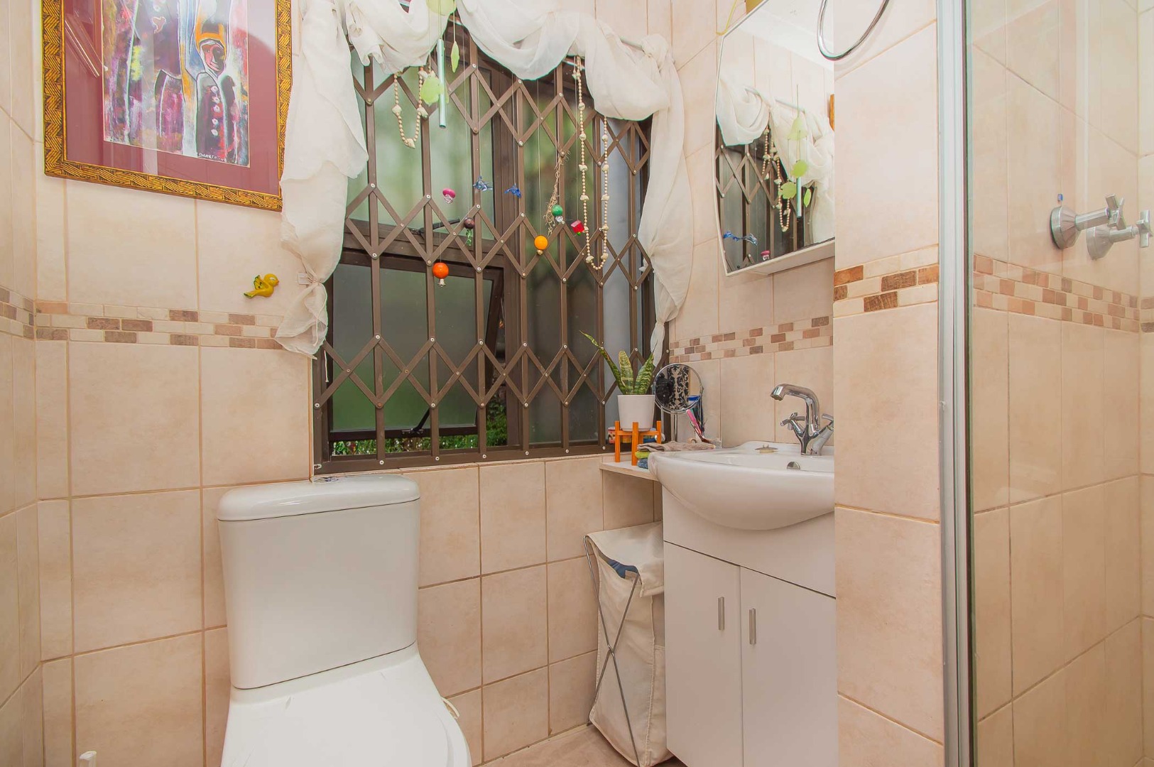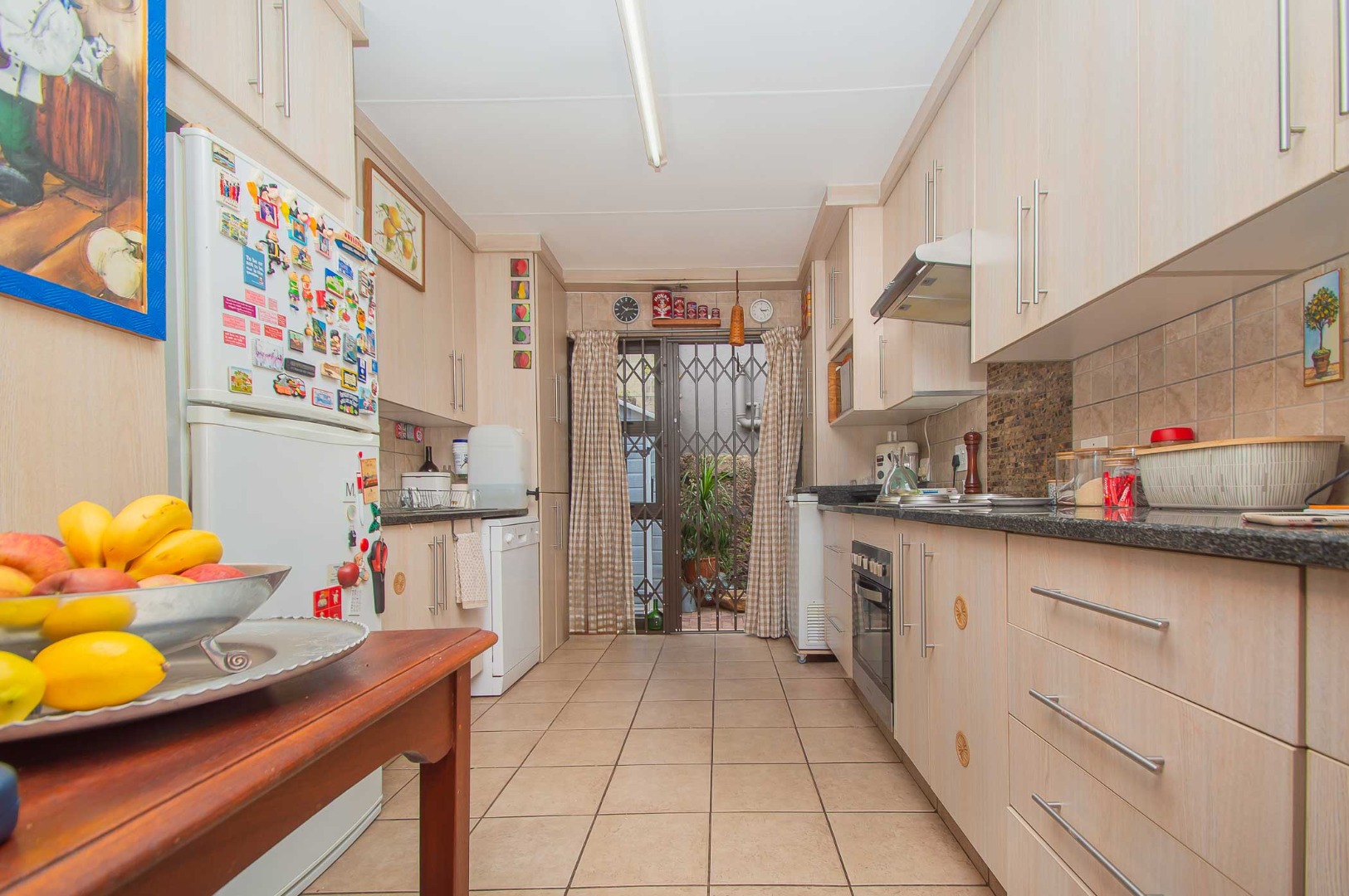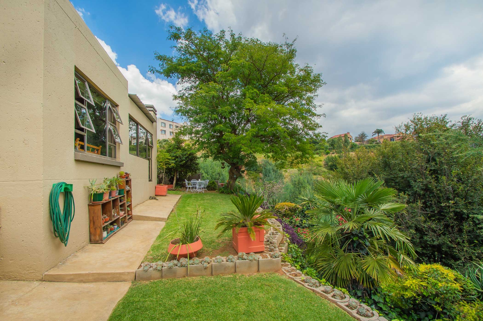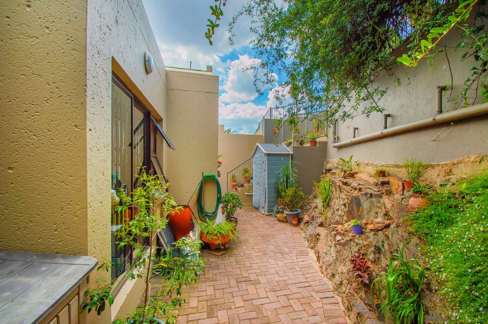 The main bedroom is double volume in size, is filled with natural light, has built-in cupboards, laminate flooring and an en-suite bathroom that has a bathtub, toilet, b-day and a vanity – the bathroom is tiled to the roof. The second bedroom has built-in cupboards, and third bedroom is spacious and used as an office. The second and third bedrooms are complimented by the second bathroom that has a toilet basin and shower and is tiled to the roof.