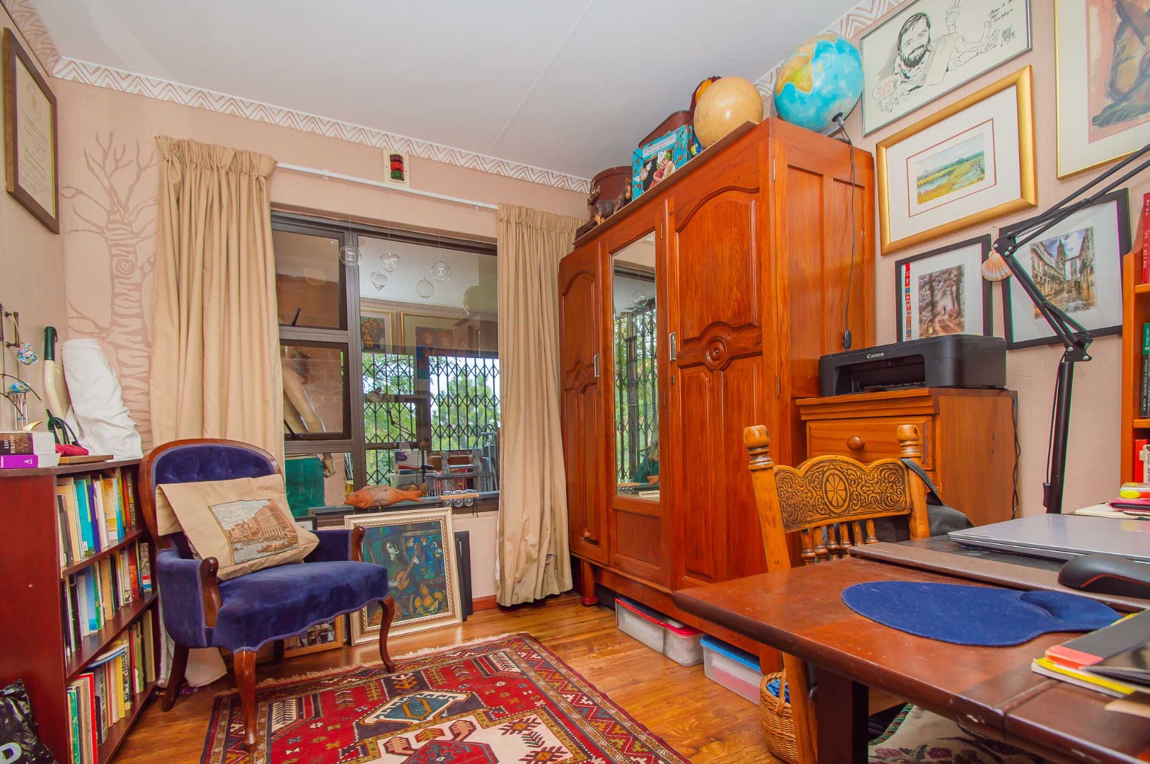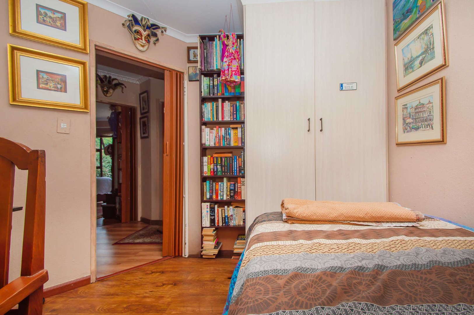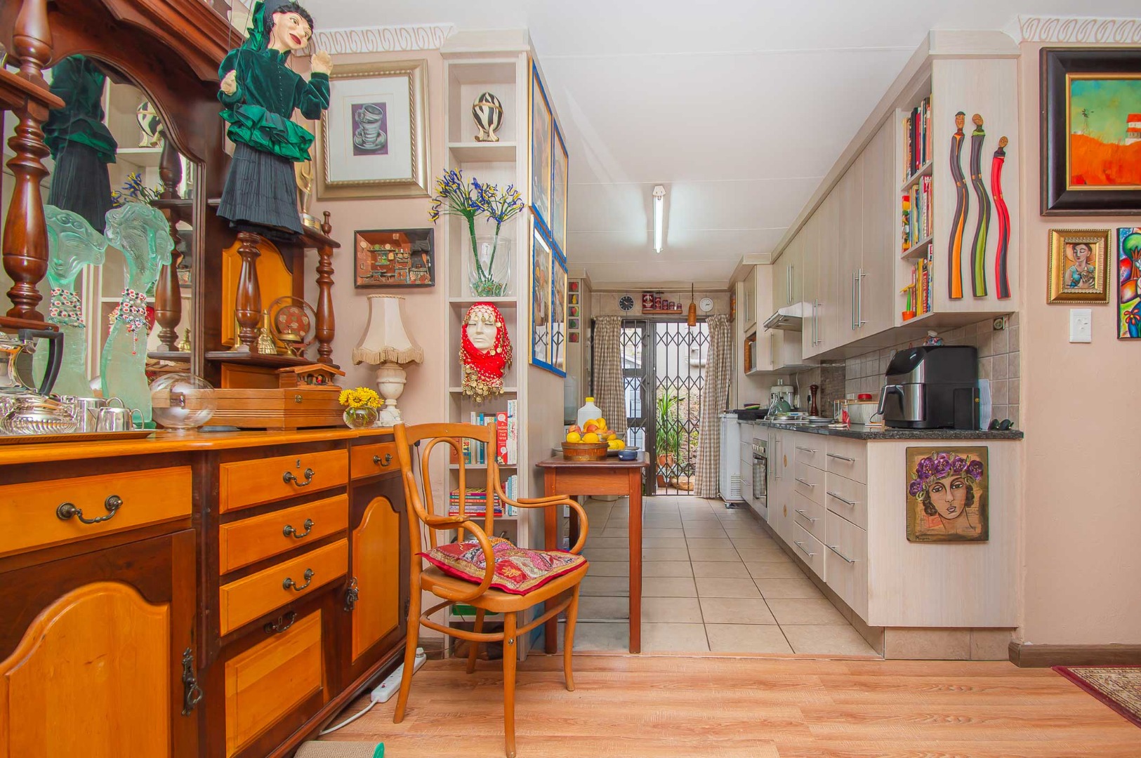 The main bedroom is double volume in size, is filled with natural light, has built-in cupboards, laminate flooring and an en-suite bathroom that has a bathtub, toilet, b-day and a vanity – the bathroom is tiled to the roof. The second bedroom has built-in cupboards, and third bedroom is spacious and used as an office. The second and third bedrooms are complimented by the second bathroom that has a toilet basin and shower and is tiled to the roof.