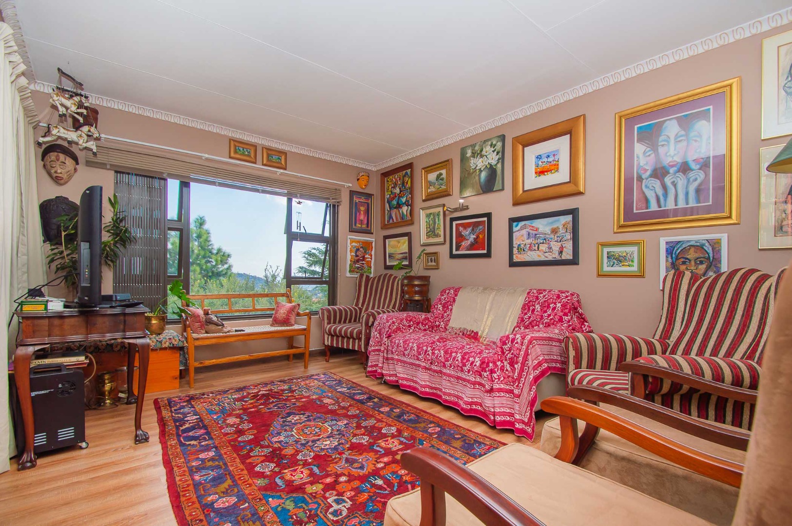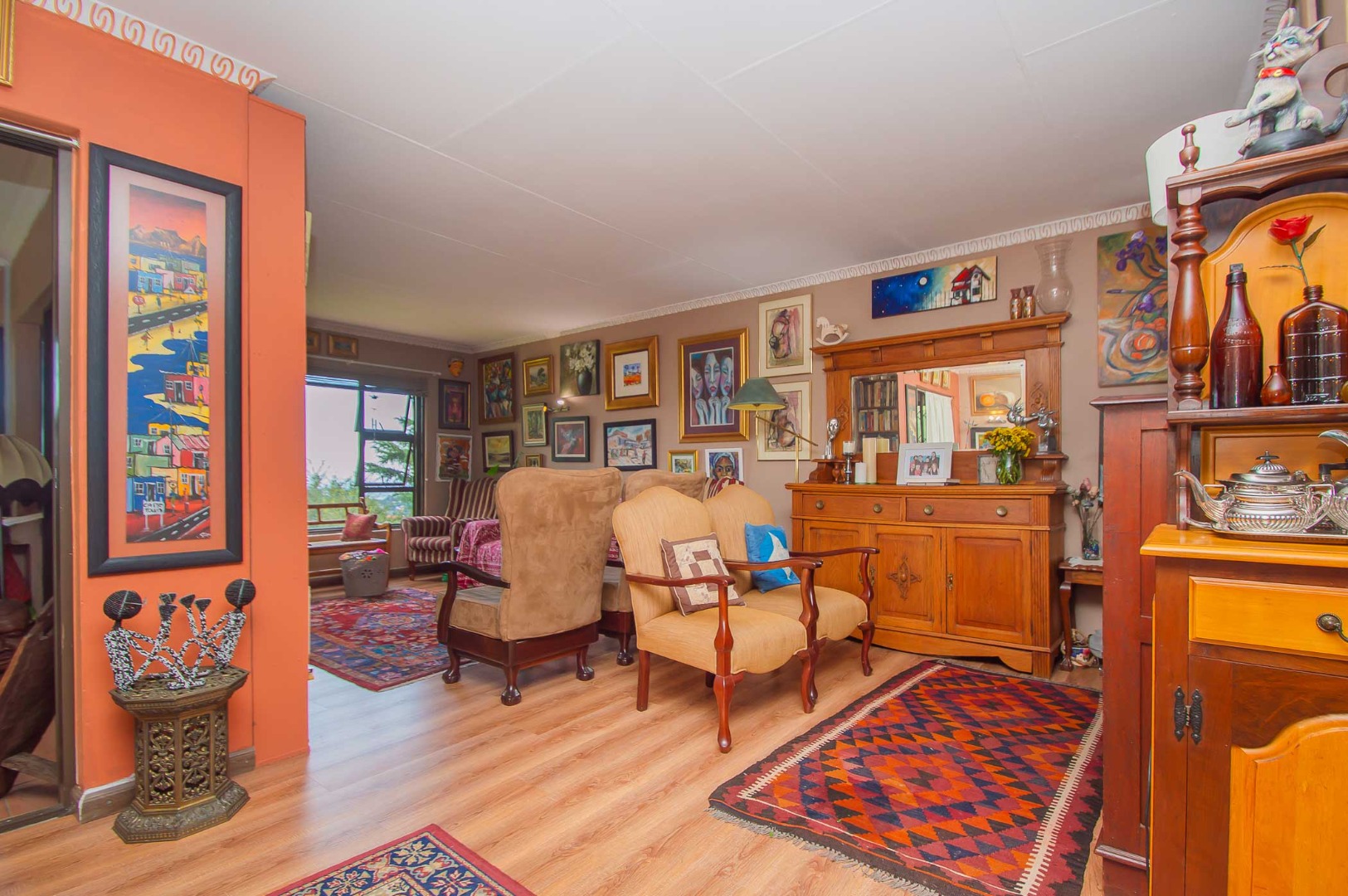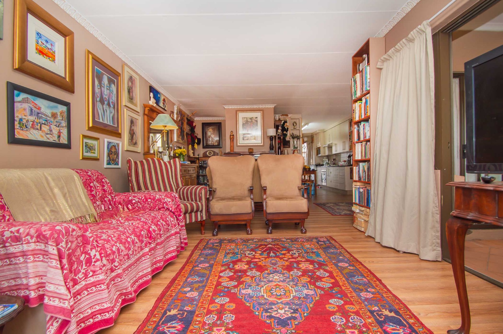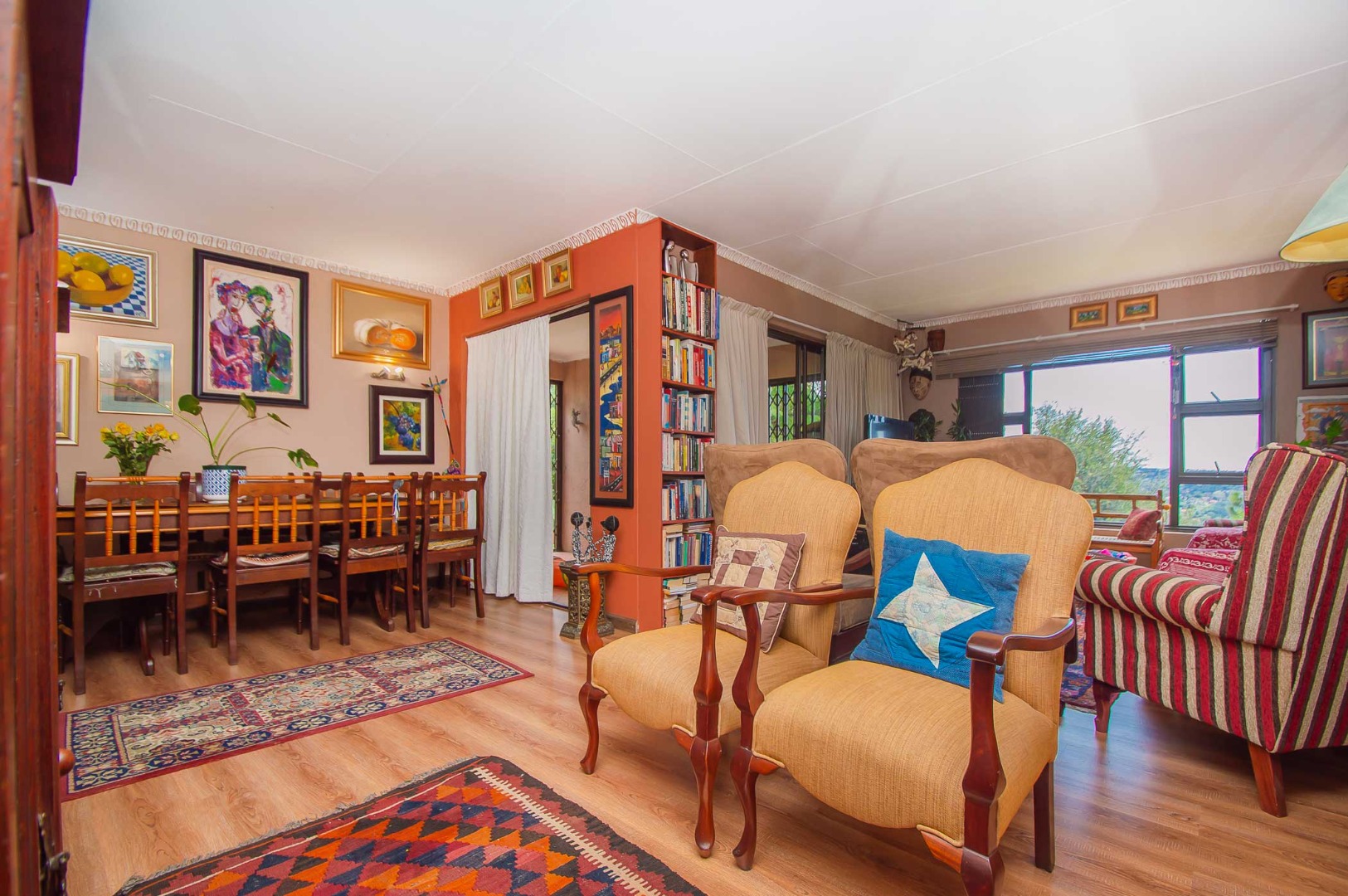 The main bedroom is double volume in size, is filled with natural light, has built-in cupboards, laminate flooring and an en-suite bathroom that has a bathtub, toilet, b-day and a vanity – the bathroom is tiled to the roof. The second bedroom has built-in cupboards, and third bedroom is spacious and used as an office. The second and third bedrooms are complimented by the second bathroom that has a toilet basin and shower and is tiled to the roof.