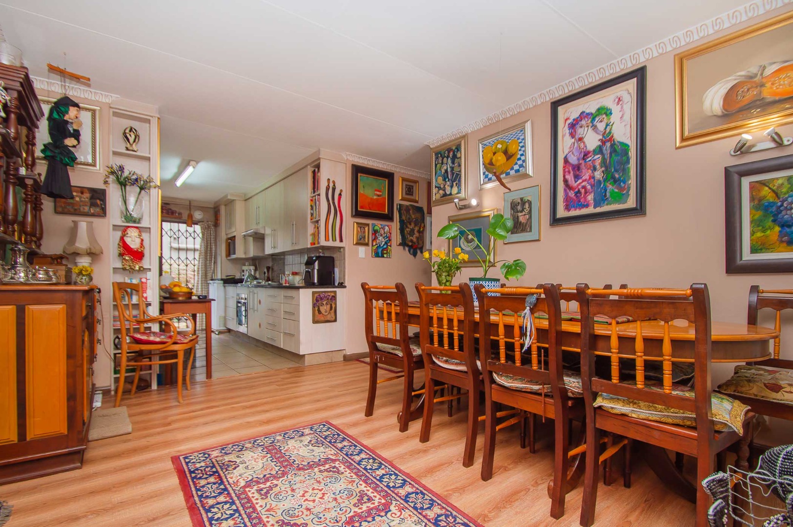 Upon entrance you are welcomed by open plan living areas and an enclosed patio with a built-in braai. Spacious kitchen with ample cupboards, granite counter tops, an oven and hob with a backsplash, a pantry, space for a fridge and 3x appliances. The kitchen flows directly into the large open plan dining area and lounge that have laminate flooring. This leads into the enclosed patio for entertaining.