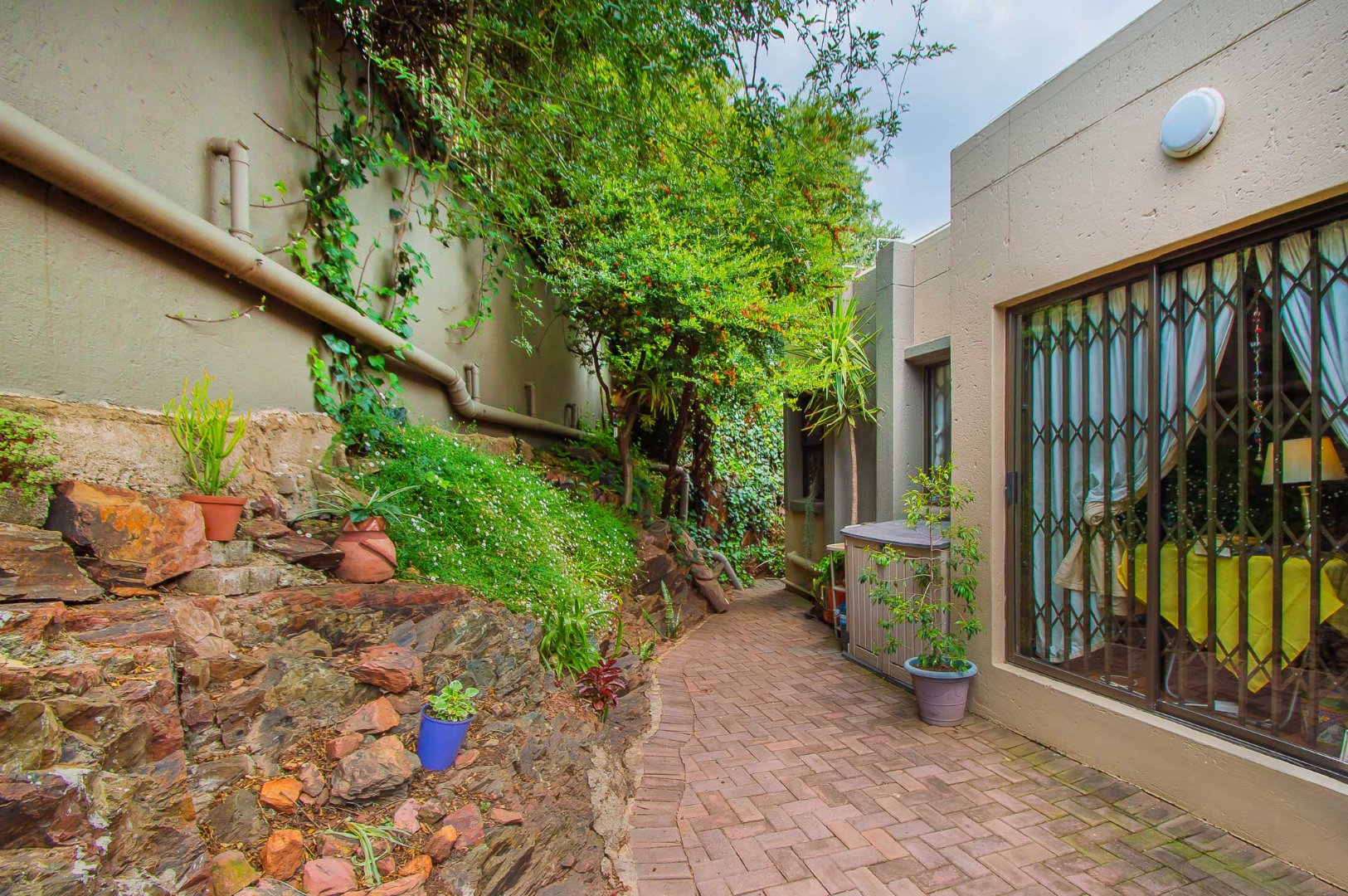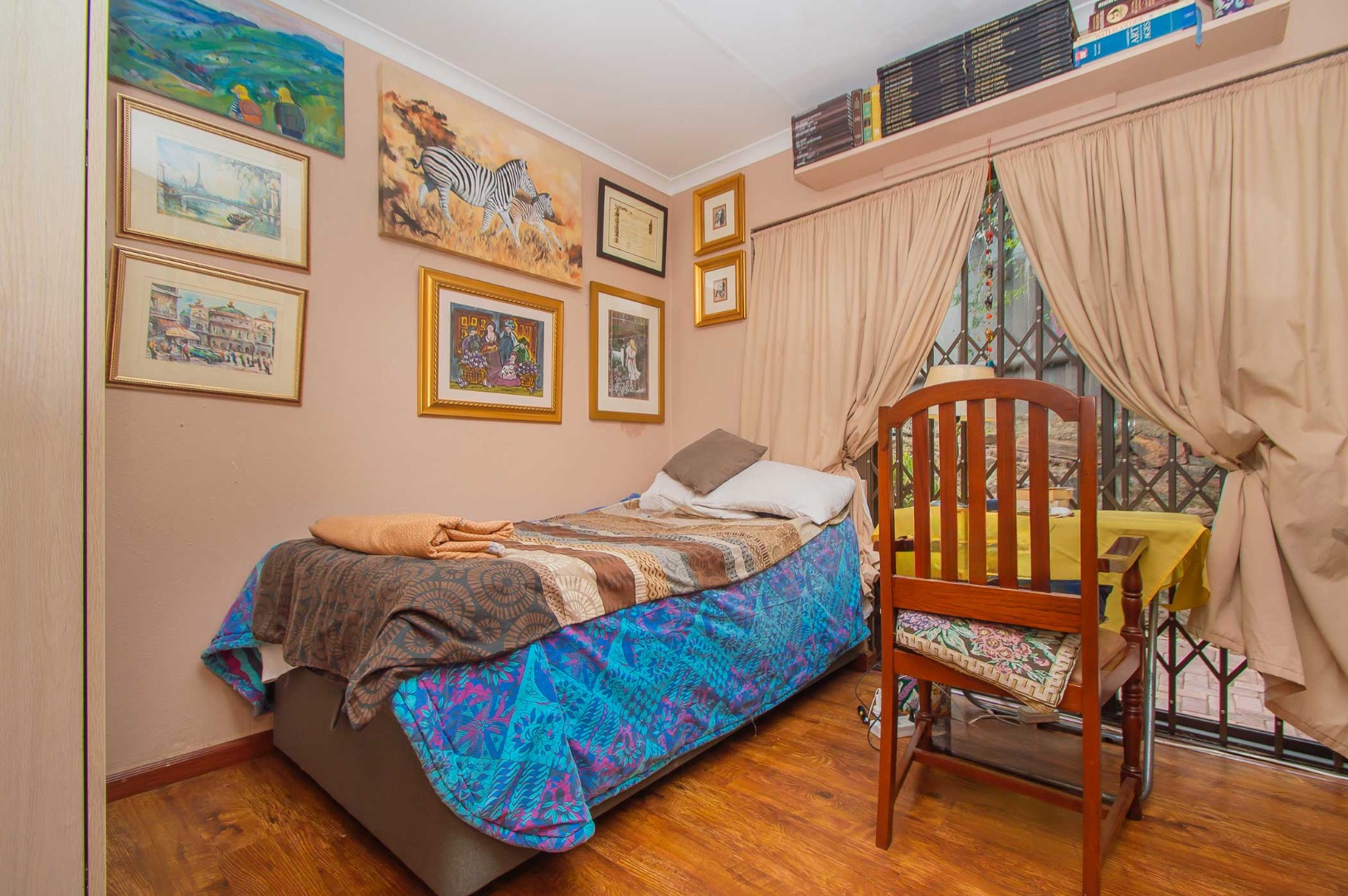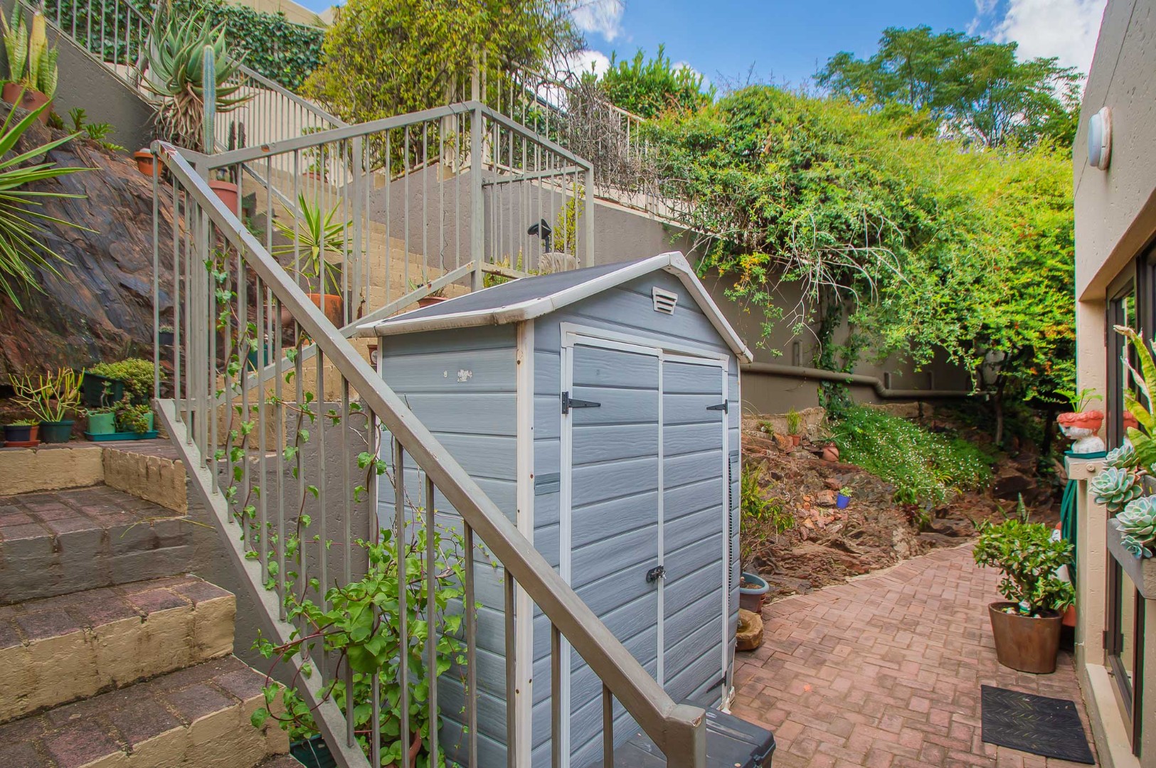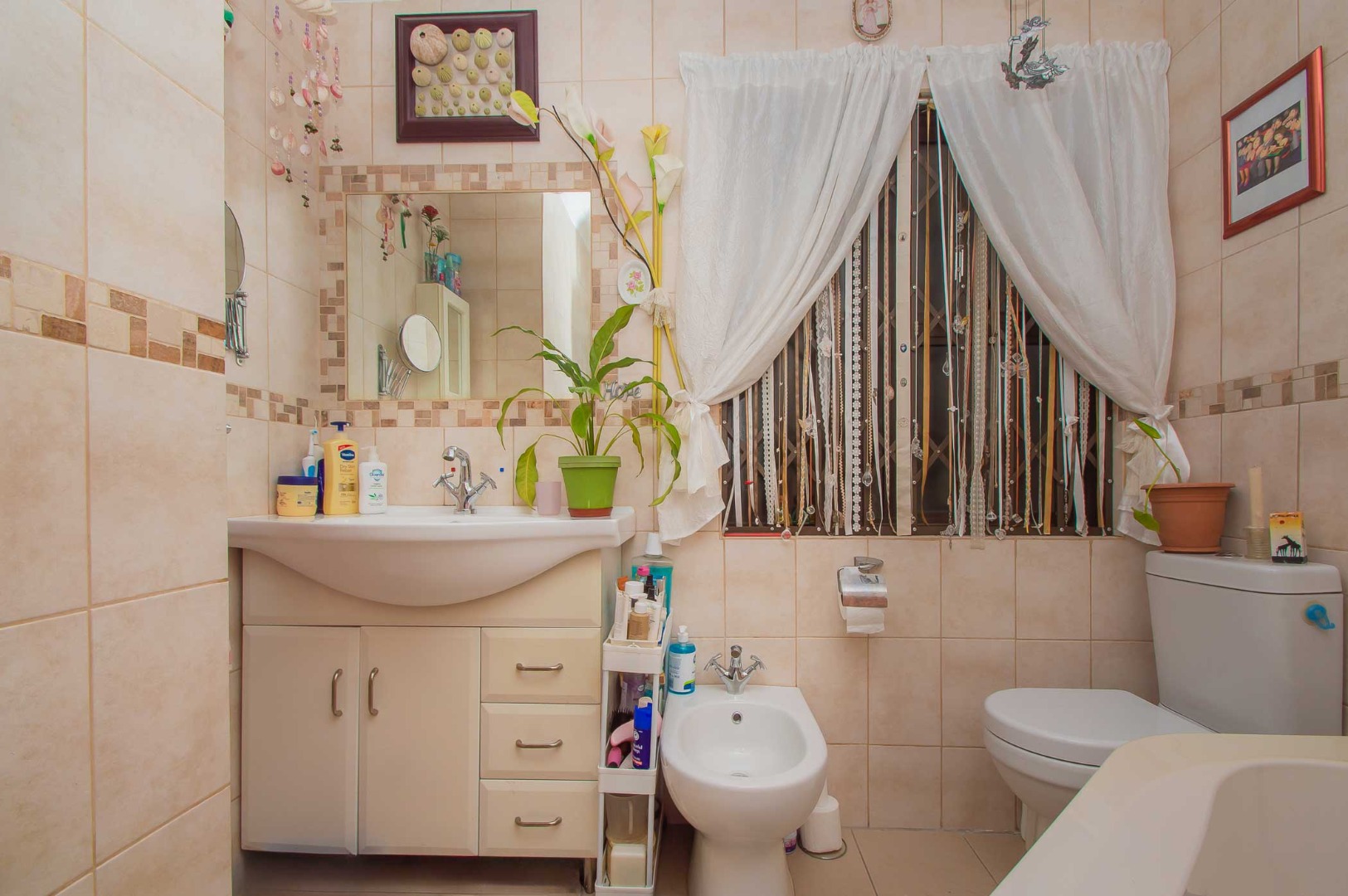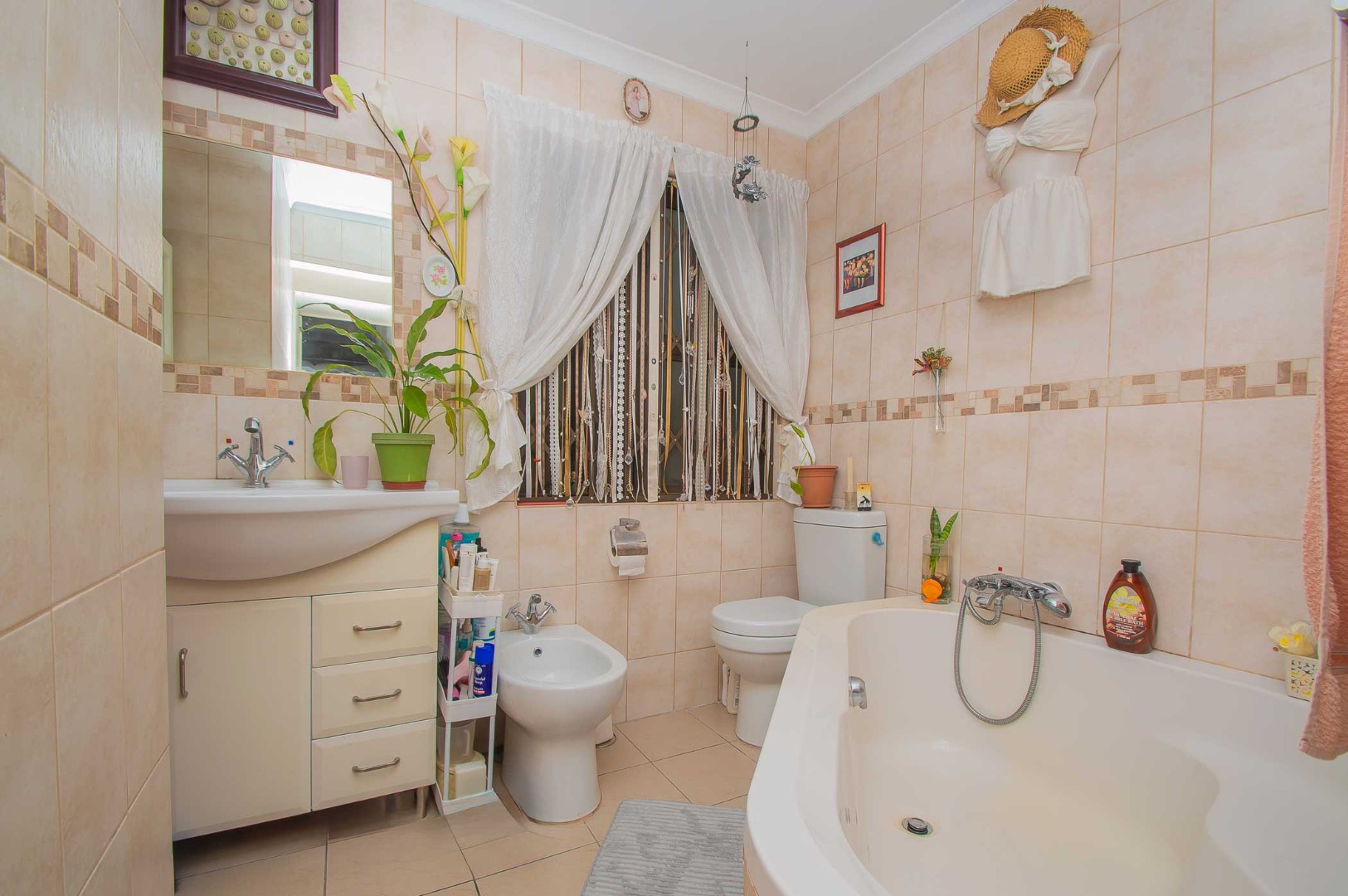 The main bedroom is double volume in size, is filled with natural light, has built-in cupboards, laminate flooring and an en-suite bathroom that has a bathtub, toilet, b-day and a vanity – the bathroom is tiled to the roof. The second bedroom has built-in cupboards, and third bedroom is spacious and used as an office. The second and third bedrooms are complimented by the second bathroom that has a toilet basin and shower and is tiled to the roof.